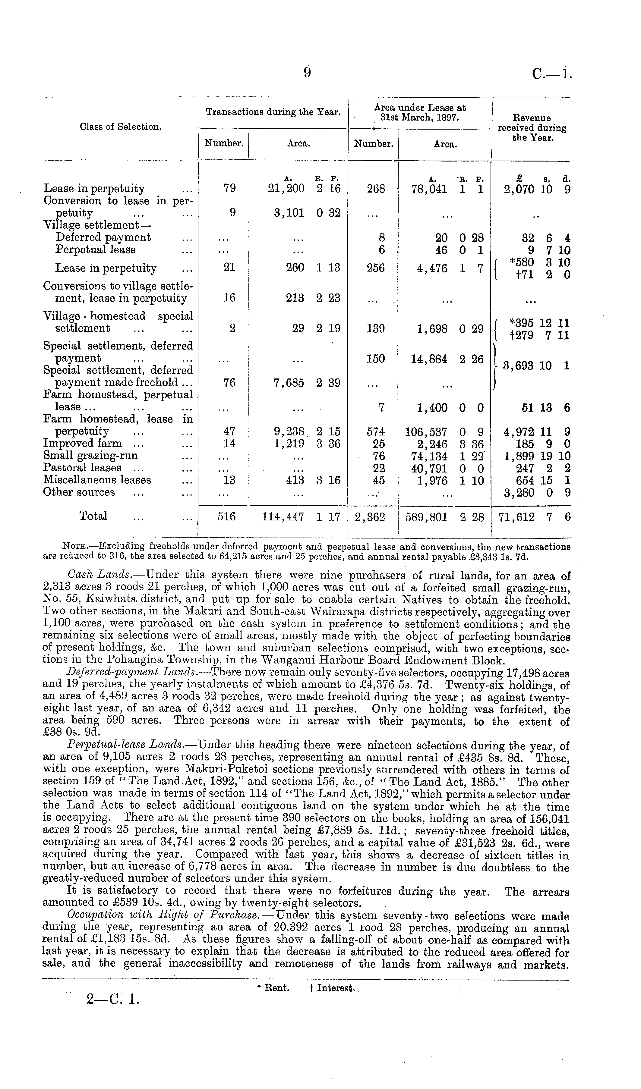 Transactions during the Year. Area under Lease at 31st March, 1897. Class of Selection. Bevenue received during the Year. Number. Area. Number. Area. Lease in perpetuity Conversion to lease in perpetuity Village settlement— Deferred payment Perpetual lease 79 A. E. P. 21,200 2 16 268 78,041 B. P. 1 1 £ s. d. 2,070 10 9 9 3,101 0 32 8 6 20 46 0 28 0 1 32 6 4 9 7 10 f *580 3 10 I +71 2 0 Lease in perpetuity 21 260 1 13 256 4,476 1 7 Conversions to village settlement, lease in perpetuity 16 213 2 23 Village - homestead special settlement 2 29 2 19 139 1,698 0 29 j *395 12 11 1 +279 7 11 3,693 10 1 Special settlement, deferred payment Special settlement, deferred payment made freehold ... Farm homestead, perpetual lease ... Farm homestead, lease in perpetuity Improved farm ... Small grazing-run Pastoral leases ... Miscellaneous leases Other sources 76 47 14 7,685 2 39 9,238 2 15 1,219 3 36 150 7 574 25 76 22 45 14,884 1,400 2 26 0 0 51 13 6 4,972 11 9 185 9 0 1,899 19 10 247 2 2 654 15 1 3,280 0 9 106,537 2,246 74,134 40,791 1,976 0 9 3 36 1 22 0 0 1 10 13 413 3 16 Total 516 114,447 1 17 2,362 589,801 2 28 71,612 7 6