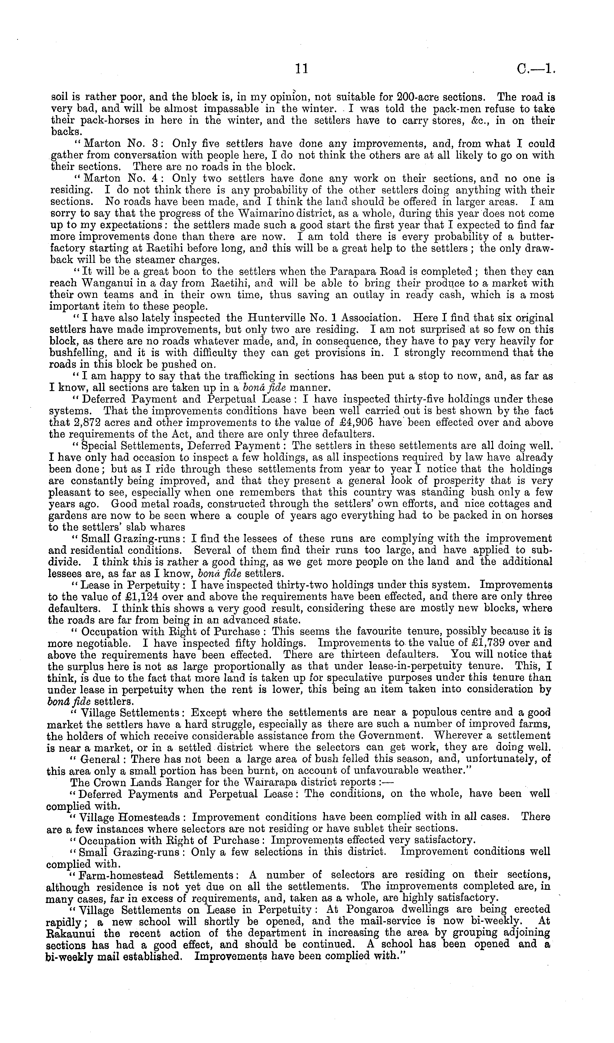 soil is rather poor, and the block is, in my opinion, not suitable for 200-acre sections. The road is very bad, and will be almost impassable in the winter. I was told the pack-men refuse to take their pack-horses in here in the winter, and the settlers have to carry stores, &c, in on their backs. " Marton No. 3: Only five settlers have done any improvements, and, from what I could gather from conversation with people here, I do not think the others are at all likely to go on with their sections. There are no roads in the block. " Marton No. 4 : Only two settlers have done any work on their sections, and no one is residing. I do not think there is any probability of the other settlers doing anything with their sections. No roads have been made, and I think the land should be offered in larger areas. lam sorry to say that the progress of the Waimarino district, as a whole, during this year does not come up to my expectations : the settlers made such a good start the first year that I expected to find far more improvements done than there are now. lam told there is every probability of a butterfactory starting at Baetihi before long, and this will be a great help to the settlers ; the only drawback will be the steamer charges. "It will be a great boon to the settlers when the Parapara Boad is completed ; then they can reach Wanganui in a day from Eaetihi, and will be able to bring their produce to a market with their own teams and in their own time, thus saving an outlay in ready cash, which is a most important item to these people. " I have also lately inspected the Hunterville No. 1 Association. Here I find that six original settlers have made improvements, but only two are residing. lam not surprised at so few on this block, as there are no roads whatever made, and, in consequence, they have to pay very heavily for bushfelling, and it is with difficulty they can get provisions in. I strongly recommend that the roads in this block be pushed on. " I am happy to say that the trafficking in sections has been put a stop to now, and, as far as I know, all sections are taken up in a bona fide manner. " Deferred Payment and Perpetual Lease : I have inspected thirty-five holdings under these systems. That the improvements conditions have been well carried out is best shown by the fact that 2,872 acres and other improvements to the value of £4,906 have been effected over and above the requirements of the Act, and there are only three defaulters. " Special Settlements, Deferred Payment: The settlers in these settlements are all doing well. I have only had occasion to inspect a few holdings, as all inspections required by law have already been done; but as I ride through these settlements from year to year I notice that the holdings are constantly being improved, and that they present a general look of prosperity that is very pleasant to see, especially when one remembers that this country was standing bush only a few years ago. Good metal roads, constructed through the settlers' own efforts, and nice cottages and gardens are now to be seen where a couple of years ago everything had to be packed in on horses to the settlers' slab whares " Small Grazing-runs : I find the lessees of these runs are complying with the improvement and residential conditions. Several of them find their runs too large, and have applied to subdivide. I think this is rather a good thing, as we get more people on the land and the additional lessees are, as far as I know, bond fide settlers. " Lease in Perpetuity : I have inspected thirty-two holdings under this system. Improvements to the value of £1,124 over and above the requirements have been effected, and there are only three defaulters. I think this shows a very good result, considering these are mostly new blocks, where the roads are far from being in an advanced state. " Occupation with Eight of Purchase : This seems the favourite tenure, possibly because it is more negotiable. I have inspected fifty holdings. Improvements to the value of £1,739 over and above the requirements have been effected. There are thirteen defaulters. You will notice that the surplus here is not as large proportionally as that under lease-in-perpetuity tenure. This, I think, is due to the fact that more land is taken up for speculative purposes under this tenure than under lease in perpetuity when the rent is lower, this being an item taken into consideration by bond fide settlers. " Village Settlements: Except where the settlements are near a populous centre and a good market the settlers have a hard struggle, especially as there are such a number of improved farms, the holders of which receive considerable assistance from the Government. Wherever a settlement is near a market, or in a settled district where the selectors can get work, they are doing well. " General: There has not been a large area of bush felled this season, and, unfortunately, of this area only a small portion has been burnt, on account of unfavourable weather." The Crown Lands Banger for the Wairarapa district reports : — " Deferred Payments and Perpetual Lease: The conditions, on the whole, have been well complied with. " Village Homesteads : Improvement conditions have been complied with in all cases. There are a few instances where selectors are not residing or have sublet their sections. " Occupation with Bight of Purchase : Improvements effected very satisfactory. "Small Grazing-runs: Only a few selections in this district. Improvement conditions well complied with. " Farm-homestead Settlements: A number of selectors are residing on their sections, although residence is not yet due on all the settlements. The improvements completed are, in many cases, far in excess of requirements, and, taken as a whole, are highly satisfactory. " Village Settlements on Lease in Perpetuity : At Pongaroa dwellings are being erected rapidly ; a new school will shortly be opened, and the mail-service is now bi-weekly. At Bakaunui t