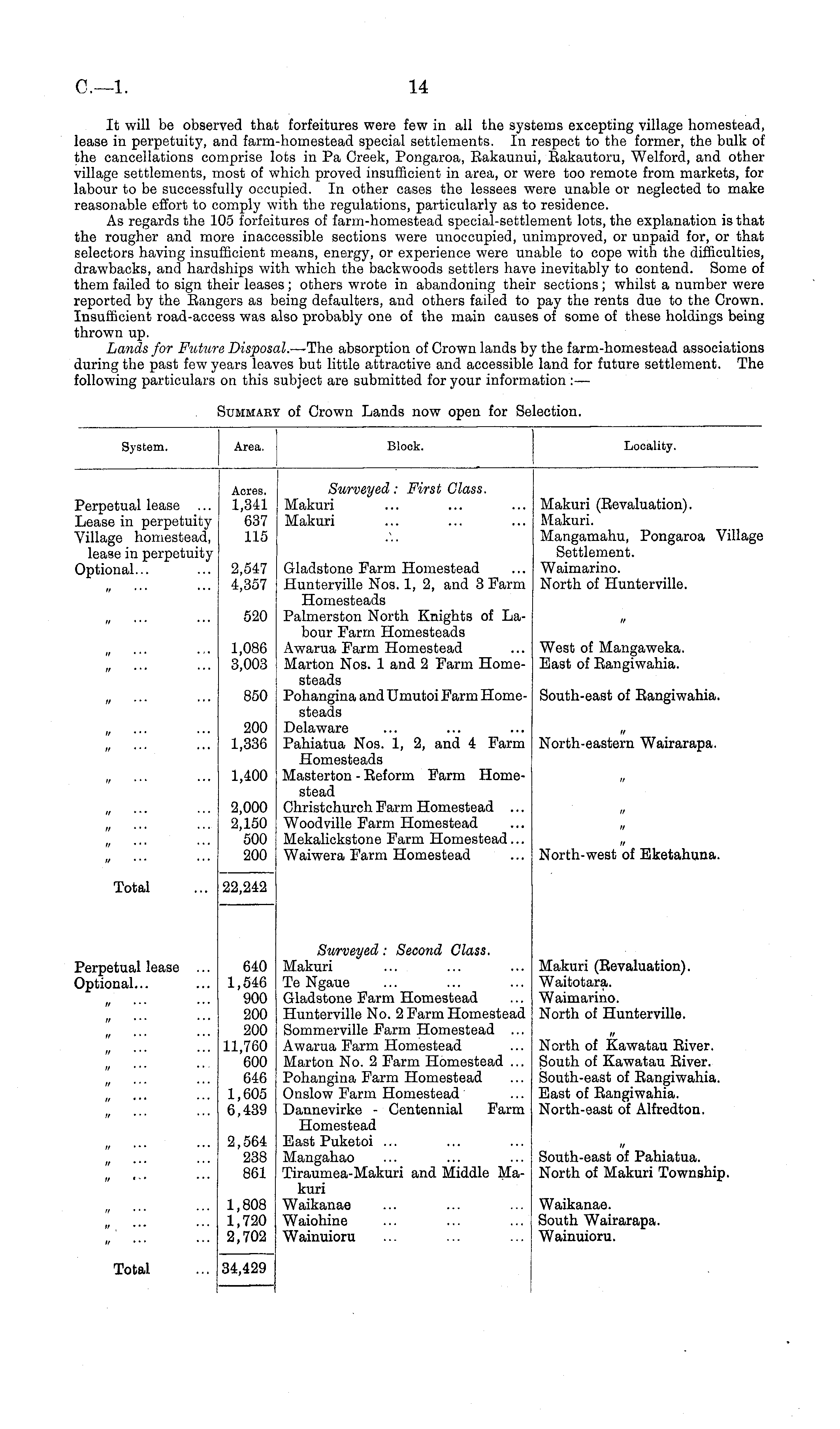 It will be observed that forfeitures were few in all the systems excepting village homestead, lease in perpetuity, and farm-homestead special settlements. In respect to the former, the bulk of the cancellations comprise lots in Pa Creek, Pongaroa, Bakaunui, Bakautoru, Welford, and other village settlements, most of which proved insufficient in area, or were too remote from markets, for labour to be successfully occupied. In other cases the lessees were unable or neglected to make reasonable effort to comply with the regulations, particularly as to residence. As regards the 105 forfeitures of farm-homestead special-settlement lots, the explanation is that the rougher and more inaccessible sections were unoccupied, unimproved, or unpaid for, or that selectors having insufficient means, energy, or experience were unable to cope with the difficulties, drawbacks, and hardships with which the backwoods settlers have inevitably to contend. Some of them failed to sign their leases; others wrote in abandoning their sections; whilst a number were reported by the Bangers as being defaulters, and others failed to pay the rents due to the Crown. Insufficient road-access was also probably one of the main causes of some of these holdings being thrown up. Lands for Future Disposal. —-The absorption of Crown lands by the farm-homestead associations during the past few years leaves but little attractive and accessible land for future settlement. The following particulars on this subject are submitted for your information : —