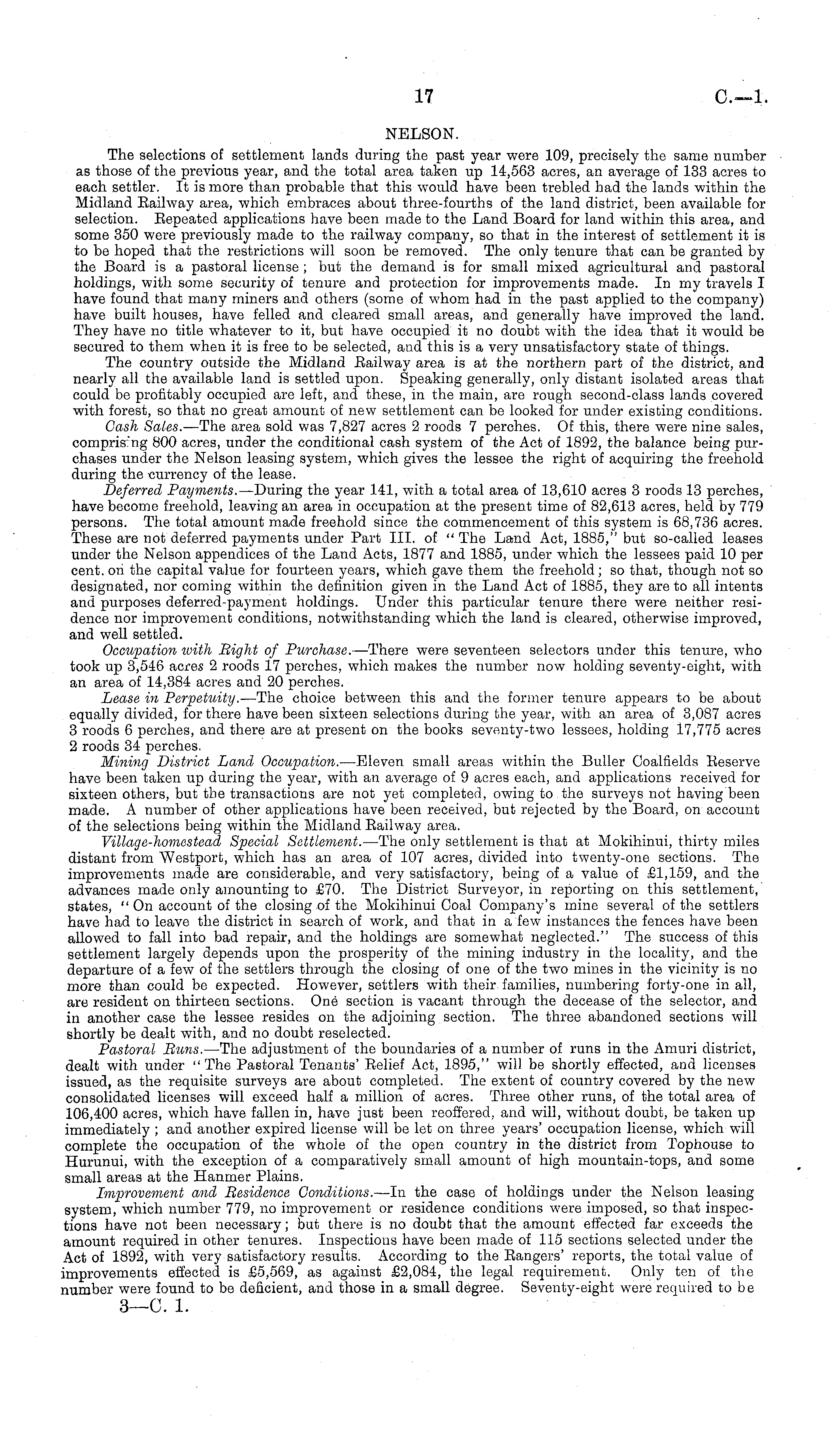 NELSON. The selections of settlement lands during the past year were 109, precisely the same number as those of the previous year, and the total area taken up 14,563 acres, an average of 133 acres to each settler. It is more than probable that this would have been trebled had the lands within the Midland Bailway area, which embraces about three-fourths of the land district, been available for selection. Bepeated applications have been made to the Land Board for land within this area, and some 350 were previously made to the railway company, so that in the interest of settlement it is to be hoped that the restrictions will soon be removed. The only tenure that can be granted by the Board is a pastoral license ; but the demand is for small mixed agricultural and pastoral holdings, with some security of tenure and protection for improvements made. In my travels I have found that many miners and others (some of whom had in the past applied to the company) have built houses, have felled and cleared small areas, and generally have improved the land. They have no title whatever to it, but have occupied it no doubt with the idea that it would be secured to them when it is free to be selected, and this is a very unsatisfactory state of things. The country outside the Midland Bailway area is at the northern part of the district, and nearly all the available land is settled upon. Speaking generally, only distant isolated areas that could be profitably occupied are left, and these, in the main, are rough second-class lands covered with forest, so that no great amount of new settlement can be looked for under existing conditions. Cash Sales. —The area sold was 7,827 acres 2 roods 7 perches. Of this, there were nine sales, comprising 800 acres, under the conditional cash system of the Act of 1892, the balance being purchases under the Nelson leasing system, which gives the lessee the right of acquiring the freehold during the currency of the lease. Deferred Payments. —During the year 141, with a total area of 13,610 acres 3 roods 13 perches, have become freehold, leaving an area in occupation at the present time of 82,613 acres, held by 779 persons. The total amount made freehold since the commencement of this system is 68,736 acres. These are not deferred payments under Part 111. of " The Land Act, 1885," but so-called leases under the Nelson appendices of the Land Acts, 1877 and 1885, under -which the lessees paid 10 per cent, on the capital value for fourteen years, which gave them the freehold; so that, though not so designated, nor coming within the definition given in the Land Act of 1885, they are to all intents and purposes deferred-payment holdings. Under this particular tenure there were neither residence nor improvement conditions, notwithstanding which the land is cleared, otherwise improved, and well settled. Occupation with Right of Purchase. —There were seventeen selectors under this tenure, who took up 3,546 acres 2 roods 17 perches, which makes the number now holding seventy-eight, with an area of 14,384 acres and 20 perches. Lease in Perpetuity. —The choice between this and the former tenure appears to be about equally divided, for there have been sixteen selections during the year, with an area of 3,087 acres 3 roods 6 perches, and there are at present on the books seventy-two lessees, holding 17,775 acres 2 roods 34 perches. Mining District Land Occupation. —Eleven small areas within the Buller Coalfields Beserve have been taken up during the year, with an average of 9 acres each, and applications received for sixteen others, but tbe transactions are not yet completed, owing to the surveys not having been made. A number of other applications have been received, but rejected by the Board, on account of the selections being within the Midland Bailway area. Village-homestead Special Settlement. —The only settlement is that at Mokihinui, thirty miles distant from Westport, which has an area of 107 acres, divided into twenty-one sections. The improvements made are considerable, and very satisfactory, being of a value of £1,159, and the advances made only amounting to £70. The District Surveyor, in reporting on this settlement, states, " On account of the closing of the Mokihinui Coal Company's mine several of the settlers have had to leave the district in search of work, and that in a few instances the fences have been allowed to fall into bad repair, and the holdings are somewhat neglected." The success of this settlement largely depends upon the prosperity of the mining industry in the locality, and the departure of a few of the settlers through the closing of one of the two mines in the vicinity is no more than could be expected. However, settlers with their families, numbering forty-one in all, are resident on thirteen sections. One section is vacant through the decease of the selector, and in another case the lessee resides on the adjoining section. The three abandoned sections will shortly be dealt with, and no doubt reselected. Pastoral Runs. —The adjustment of the boundaries of a number of runs in the Amuri district, dealt with under "The Pastoral Tenants' Belief Act, 1895," will be shortly effected, and licenses issued, as the requisite surveys are about completed. The extent of country covered by the new consolidated licenses will exceed half a million of acres. Three other runs, of the total area of 106,400 acres, which have fallen in, have just been reoffered, and will, without doubt, be taken up immediately ; and another expired license will be let on three years' occupation license, which will complete the occupation of the whole of the open country in the district from Tophouse to Hurunui, with the exception of a comparatively small amount of high mountain-tops, and some small areas at the Haniner Plains. Improvement and Residence Conditions. —ln the case of holdings under the Nelson leasing system, which number 779, no improvement or residence condition