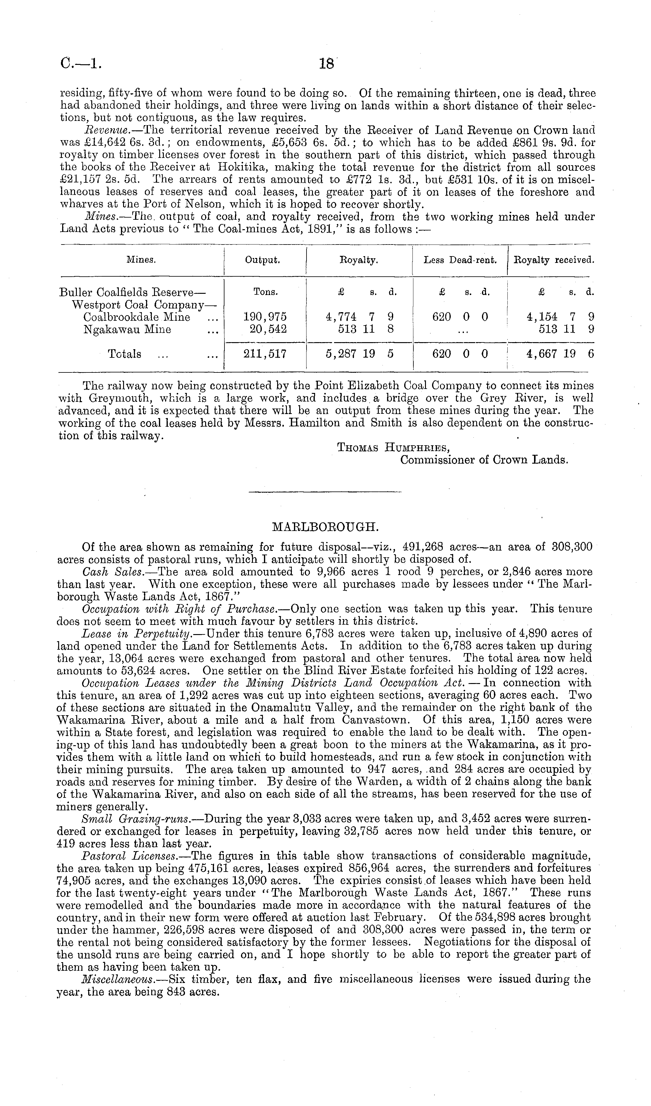 The railway now being constructed by the Point Elizabeth Coal Company to connect its mines with Greymouth, which is a large work, and includes a bridge over the Grey Eiver, is well advanced, and it is expected that there will be an output from these mines during the year. The working of the coal leases held by Messrs. Hamilton and Smith is also dependent on the construction of this railway. Thomas Humpheies, Commissioner of Crown Lands.