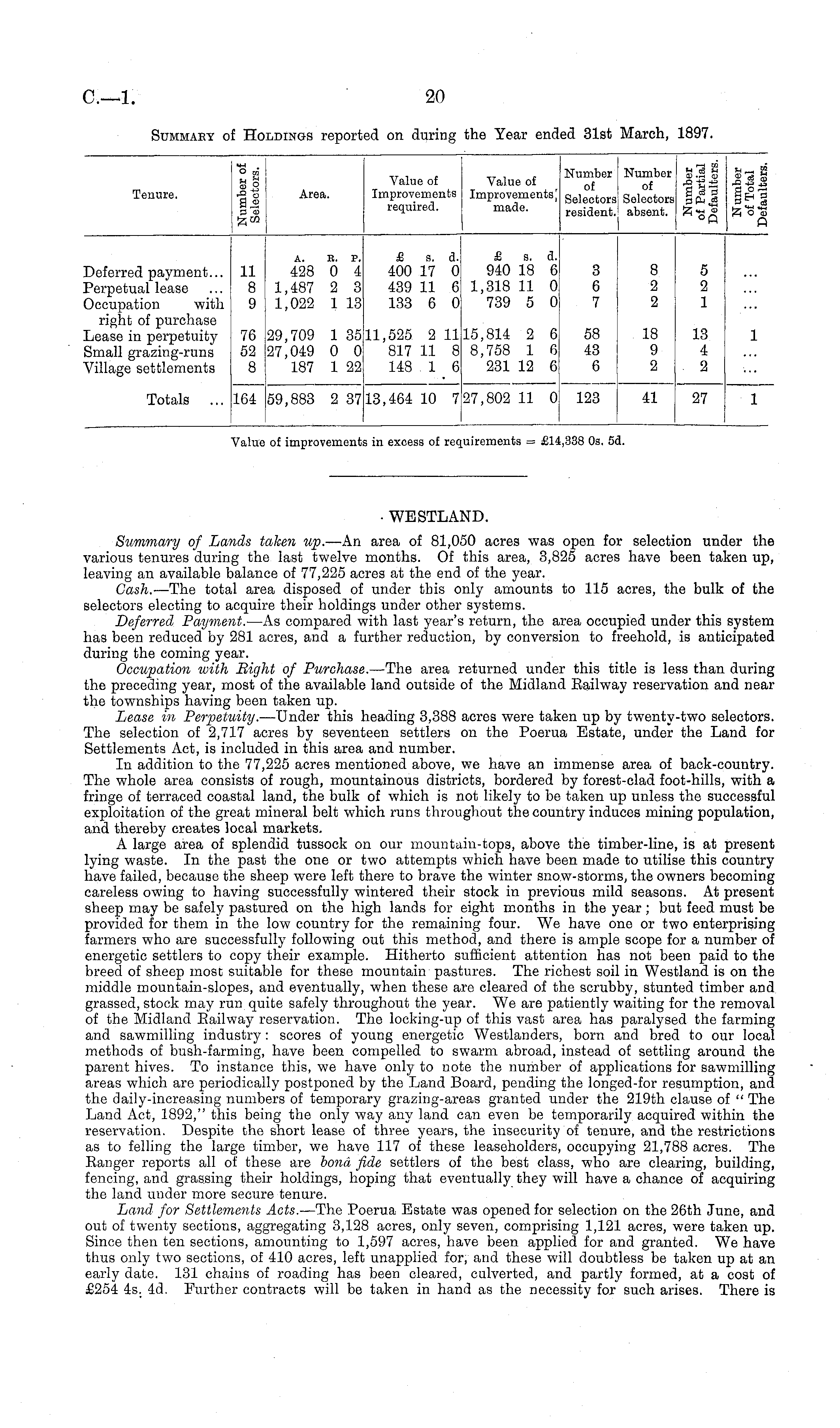 Tenure. O m SJ W }l a .2 a oi Area. Value of Value of Improvements Improvements J required. made. Number of Selectors resident. Number of Selectors absent. II! I )eferred payment... 'erpetual lease )ccupation with right of purchase jease in perpetuity imall grazing-runs Ullage settlements 11 8 9 A. E. P. 428 0 4 1,487 2 3 1,022 1 13 £ s. d. 400 17 0 439 11 6 133 6 0 £ s. d. 940 18 6 1,318 11 0 739 5 0 3 6 7 8 2 2 5 2 1 7G 52 8 29,709 1 35 27,049 0 0 187 1 22 11,525 2 11 817 11 8 148 1 6 15,814 2 6 8,758 1 6 231 12 6 58 6 18 9 2 13 4 2 1 Totals ... 164 59,883 2 37 13,464 10 7 27,802 11 0 123 41 27
