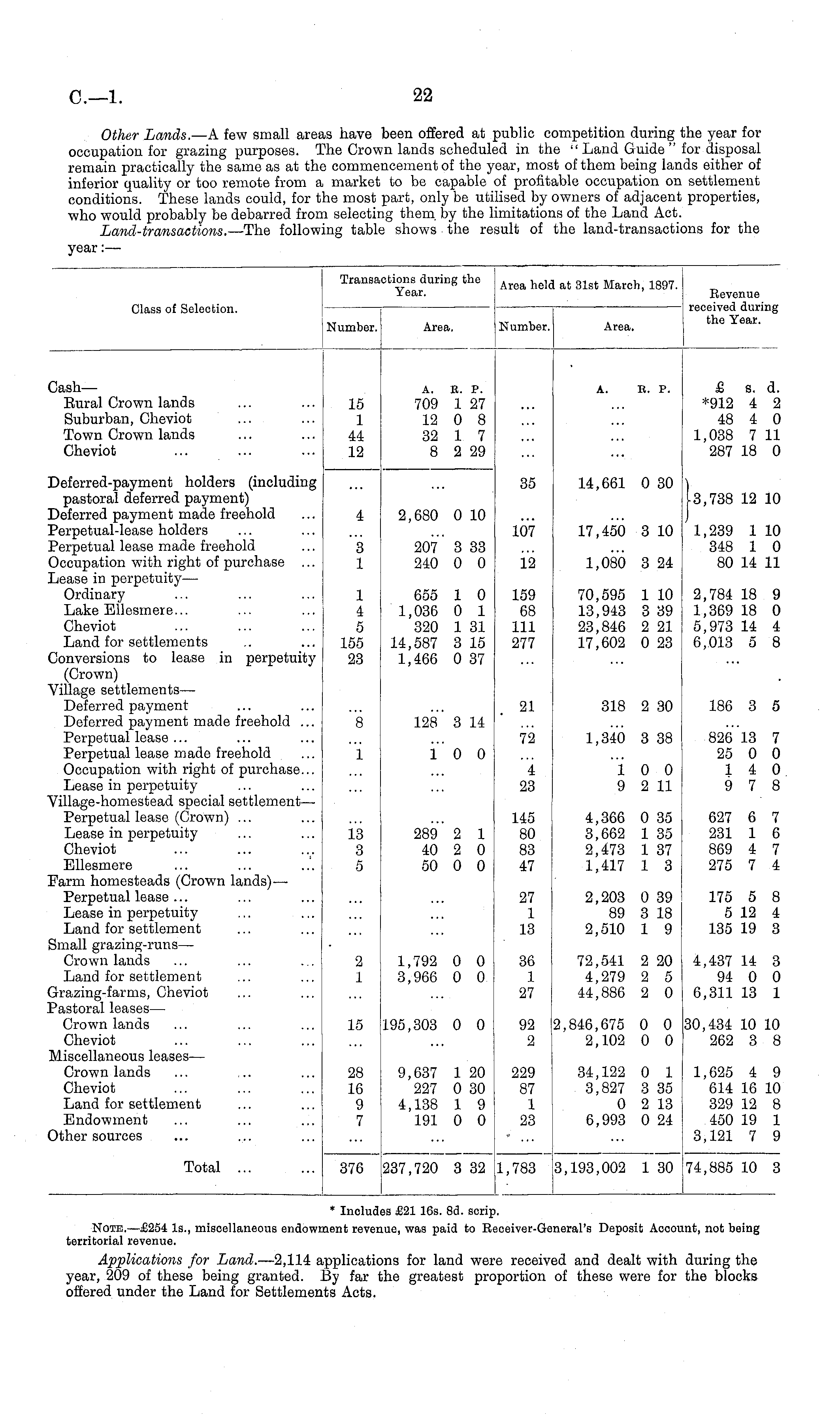 Transactions during the Year. Area held at 31st March, 1897. Class of Selection. Revenue :eived during the Year. Number. Area. Number. Area. Cash — Eural Crown lands Suburban, Cheviot Town Crown lands Cheviot A. E. P. 709 1 27 12 0 8 32 1 7 8 2 29 A. K. P. £ s. a. *912 4 2 48 4 0 1,038 7 11 287 18 0 15 1 44 12 Deferred-payment holders (including pastoral deferred payment) Deferred payment made freehold Perpetual-lease holders Perpetual lease made freehold Occupation with right of purchase ... Lease in perpetuity — Ordinary Lake Ellesmere... Cheviot Land for settlements Conversions to lease in perpetuity (Crown) Village settlements— Deferred payment Deferred payment made freehold ... Perpetual lease ... Perpetual lease made freehold Occupation with right of purchase... Lease in perpetuity Village-homestead special settlement— Perpetual lease (Crown) ... Lease in perpetuity Cheviot Ellesmere Farm homesteads (Crown lands) —■ Perpetual lease ... Lease in perpetuity Land for settlement Small grazing-runs— Crown lands Land for settlement Grazing-farms, Cheviot Pastoral leases— Crown lands Cheviot Miscellaneous leases — Crown lands Cheviot Land for settlement Endowment Other sources 4 3 1 1 4 5 155 23 8 1 13 3 5 2,680 0 10 207 3 33 240 0 0 655 1 0 1,036 0 1 320 1 31 14,587 3 15 1,466 0 37 128 3 14 i o o 289 2 1 40 2 0 50 0 0 35 107 12 159 68 111 277 21 72 4 23 145 80 83 47 14,661 17,450 1,080 70,595 13,943 23,846 17,602 318 1,340 1 9 4,366 3,662 2,473 1,417 0 30 3 10 3 24 1 10 3 39 2 21 0 23 2 30 3 38 0 0 2 11 0 35 1 35 1 37 1 3 3,738 12 10 1,239 1 10 348 1 0 80 14 11 2,784 18 9 1,369 18 0 5,973 14 4 6,013 5 8 186 3 5 826 13 7 25 0 0 14 0 9 7 8 627 6 7 231 1 6 869 4 7 275 7 4 27 1 13 2,203 89 2,510 0 39 3 18 1 9 175 5 8 5 12 4 135 19 3 2 1 1,792 0 0 3,966 0 0 36 1 27 72,541 4,279 44,886 2 20 2 5 2 0 4,437 14 3 94 0 0 6,311 13 1 15 195,303 0 0 92 2 2,846,675 2,102 0 0 0 0 30,434 10 10 262 3 8 28 16 9 7 9,637 1 20 227 0 30 4,138 1 9 191 0 0 229 87 1 23 34,122 3,827 0 6,993 0 1 3 35 2 13 0 24 1,625 4 9 614 16 10 329 12 8 450 19 1 3,121 7 9 Total ... 3,193,002 1 30 74,885 10 3 376 237,720 3 32 1,783 * Include is £21 16s. 8d. scrr