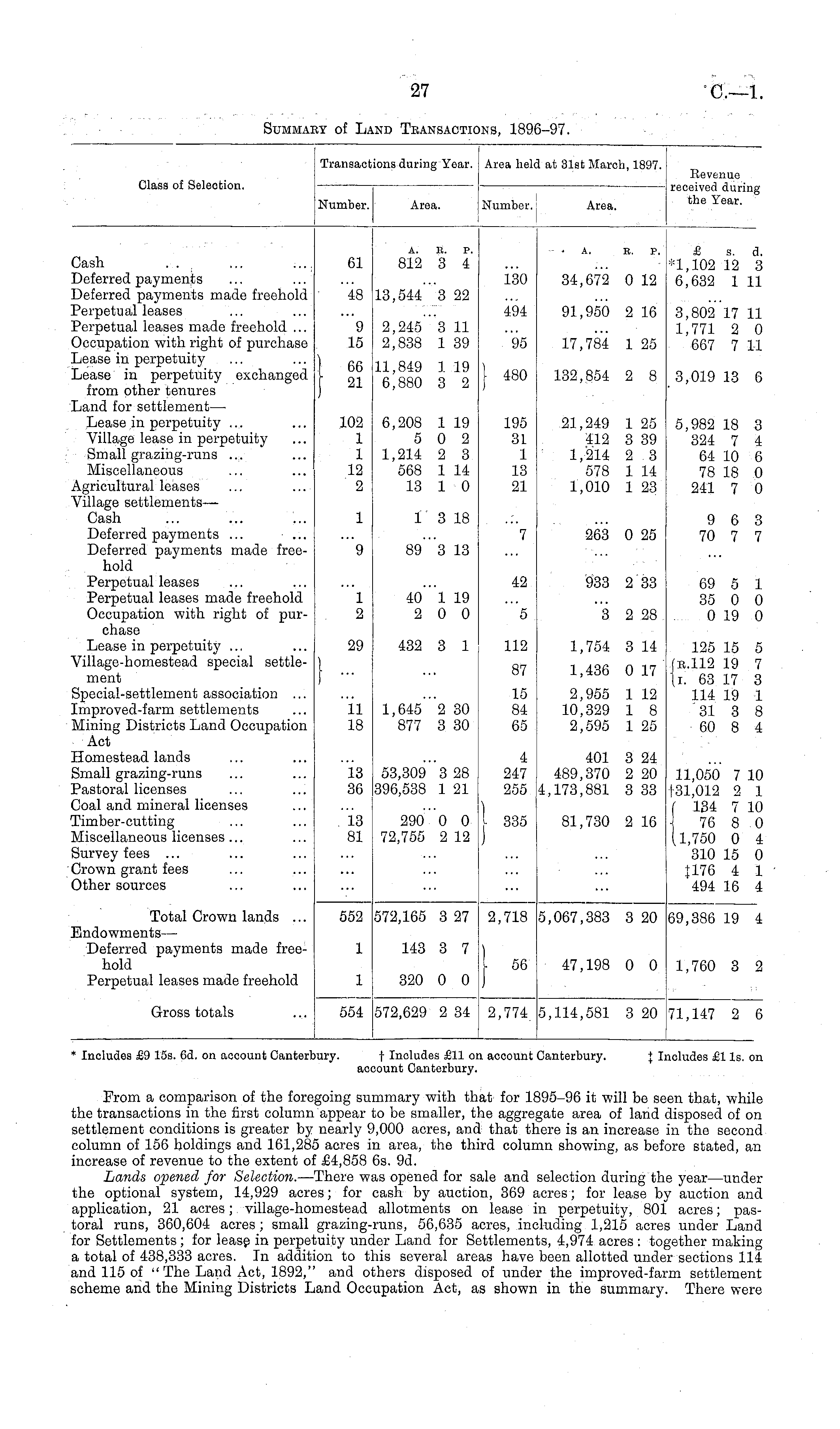 Transactions during Year. Area held at 31st March, 1897. Class of Selection. Number. Eevenue received during the Year. Area. Number. Area. Cash .-.. , 1 Deferred payments Deferred payments made freehold Perpetual leases Perpetual leases made freehold ... Occupation with right of purchase Lease in perpetuity Lease in perpetuity exchanged from other tenures Land for settlement— Lease in perpetuity ... Village lease in perpetuity Small grazing-runs ... Miscellaneous Agricultural leases Village settlements— Cash Deferred payments ... ... Deferred payments made freehold Perpetual leases Perpetual leases made freehold Occupation with right of purchase Lease in perpetuity ... Village-homestead special settlement Special-settlement association ... Improved-farm settlements Mining Districts Land Occupation Act 61 A. B. P. 812 3 4 A. B. P. £ s. a. *l,102 12 3 6,632 1 11 "48 13,544 3 22 130 34,672 0 12 9 15 494 91,950 2 16 3,802 17 11 1,771 2 0 667 7 11 2,245 3 11 2,838 1 39 95 17,784 1 25 1 66 21 11,849 1 19 6,880 3 2 I 480 132,854 2 8 3,019 13 6 102 1 1 12 2 6,208 1 19 5 0 2 1,214 2 3 568 1 14 13 1 0 195 3L 1 13 21 21,249 412 1,214 578 1,010 1 25 3 39 2 3 1 14 1 23 5,982 18 3 324 7 4 64 10 6 78 18 0 241 7 0 1 1 3 18 7 263 0 25 9 6 3 70 7 7 9 89 "3 13 1 2 40 1 19 2 0 0 42 933 2 33 69 5 1 35 0 0 0 19 0 "5 3 2 28 29 432 3 1 112 1,754 3 14 125 15 5 (E.112 19 7 |i. 63 17 3 114 19 1 31 3 8 60 8 4 I 87 1,436 0 17 11 18 1,645"'2 30 877 3 30 15 84 65 2,955 10,329 2,595 1 12 1 8 1 25 Homestead lands Small grazing-runs Pastoral licenses Coal and mineral licenses Timber-cutting Miscellaneous licenses... Survey fees Crown grant fees Other sources 13 36 53,309 3 28 396,538 1 21 4 247 255 401 489,370 4,173,881 3 24 2 20 3 33 11,050 7 10 t31,012 2 1 f 134 7 10 76 8 0 (1,750 0 4 310 15 0 J176 4 1 494 16 4 "l3 81 29o"o 0 72,755 2 12 1 335 81,730 2 16 Total Crown lands ... Endowments — Deferred payments made freehold Perpetual leases made freehold 552 572,165 3 27 2,718 5,067,383 3 20 69,386 19 4 1 143 3 7 1 - 56 47,198 0 0 1,760 3 2 1 320 0 0 Gross totals 554 572,629 2 34 2,774 5,114,581 3 20 71,147 2 6 Includes £9 15s. 6d. on account Canterl lury. f Includes £11 on account Canterbury, lount Canterbury. J I: icludes £1 Is. 0: ac<