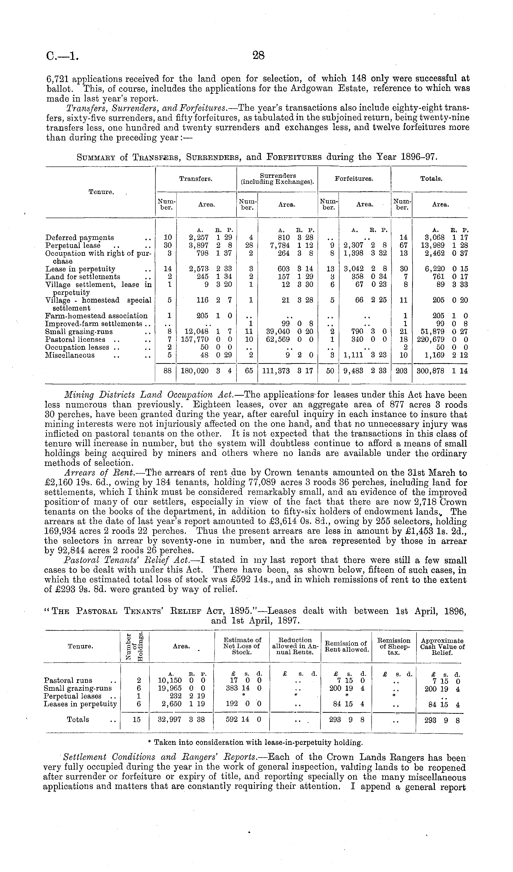 6,721 applications received for the land open for selection, of which 148 only were successful at ballot. This, of course, includes the applications for the Ardgowan Estate, reference to which was made in last year's report. Transfers, Surrenders, and Forfeitures. —The year's transactions also include eighty-eight transfers, sixty-five surrenders, and fifty forfeitures, as tabulated in the subjoined return, being twenty-nine transfers less, one hundred and twenty surrenders and exchanges less, and twelve forfeitures more than during the preceding year :—