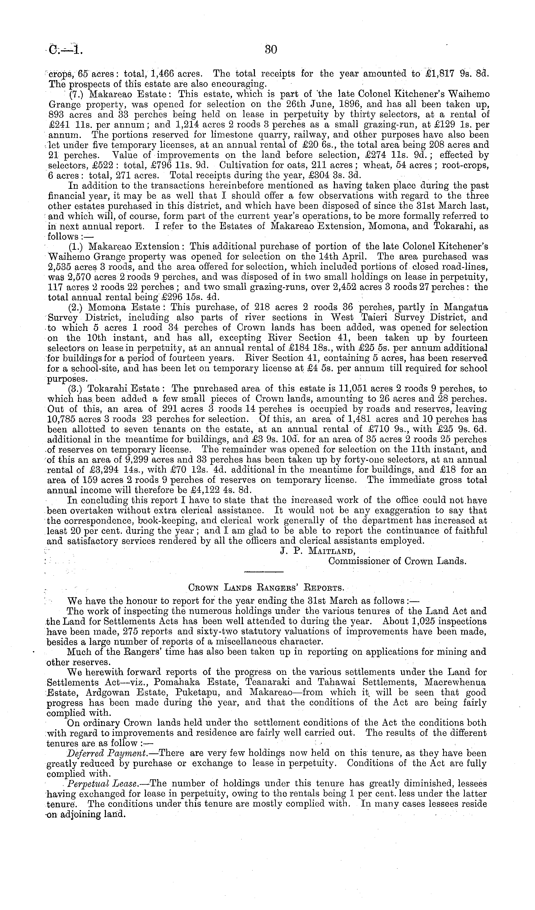 crops, 65 acres: total, 1,466 acres. The total receipts for the year amounted to £1,817 9s. Bd. The prospects of this estate are also encouraging. (7.) Makareao Estate: This estate, which is part of the late Colonel Kitchener's Waihemo Grange property, was opened for selection on the 26th June, 1896, and has all been taken up, 893 acres and 33 perches being held on lease in perpetuity by thirty selectors, at a rental of £241 lis. per annum; and 1,214 acres 2 roods 3 perches as a small grazing-run, at £129 Is. per annum. The portions reserved for limestone quarry, railway, and other purposes have also been let under five temporary licenses, at an annual rental of £20 65., the total area being 208 acres and 21 perches. Value of improvements on the land before selection, £274 lis. 9d.; effected by selectors, £522 : total, £796 lis. 9d. Cultivation for oats, 211 acres ; wheat, 54 acres ; root-crops, 6 acres : total, 271 acres. Total receipts during the year, £304 3s. 3d. In addition to the transactions hereinbefore mentioned as having taken place during the past financial year, it may be as well that I should offer a few observations with regard to the three other estates purchased in this district, and which have been disposed of since the 31st March last, and which will, of course, form part of the current year's operations, to be more formally referred to in next annual report. I refer to the Estates of Makareao Extension, Momona, and Tokarahi, as follows:— (1.) Makareao Extension : This additional purchase of portion of the late Colonel Kitchener's Waihemo Grange property was opened for selection on the 14th April. The area purchased was 2,535 acres 3 roods, and the area offered for selection, which included portions of closed road-lines, was 2,570 acres 2 roods 9 perches, and was disposed of in two small holdings on lease in perpetuity, 117 acres 2 roods 22 perches ; and two small grazing-runs, over 2,452 acres 3 roods 27 perches : the total annual rental being £296 15s. 4d. (2.) Momona Estate : This purchase, of 218 acres 2 roods 36 perches, partly in Mangatua Survey District, including also parts of river sections in West Taieri Survey District, and to which 5 acres 1 rood 34 perches of Crown lands has been added, was opened for selection on the 10th instant, and has all, excepting Biver Section 41, been taken up by fourteen selectors on lease in perpetuity, at an annual rental of £184 18s., with £25 ss. per annum additional for buildings for a period of fourteen years. Biver Section 41, containing 5 acres, has been reserved for a school-site, and has been let on temporary license at £4 ss. per annum till required for school purposes. (3.) Tokarahi Estate : The purchased area of this estate is 11,051 acres 2 roods 9 perches, to which has been added a few small pieces of Crown lands, amounting to 26 acres and 28 perches. Out of this, an area of 291 acres 3 roods 14 perches is occupied by roads and reserves, leaving 10,785 acres 3 roods 23 perches for selection. Of this, an area of 1,481 acres and 10 perches has been allotted to seven tenants on the estate, at an annual rental of £710 95., with £25 9s. 6d. additional in the meantime for buildings, and £3 9s. lOd. for an area of 35 acres 2 roods 25 perches of reserves on temporary license. The remainder was opened for selection on the 11th instant, and of this an area of 9,299 acres and 33 perches has been taken up by forty-one selectors, at an annual rental of £3,294 145., with £70 12s. 4d. additional in the meantime for buildings, and £18 for an area of 159 acres 2 roods 9 perches of reserves on temporary license. The immediate gross total annual income will therefore be £4,122 4s. Bd. In concluding this report I have to state that the increased work of the office could not have been overtaken without extra clerical assistance. It would not be any exaggeration to say that the correspondence, book-keeping, and clerical work generally of the department has increased at least 20 per cent, during the year ; and I am glad to be able to report the continuance of faithful and satisfactory services rendered by all the officers and clerical assistants employed. J. P. Maitland, ; ■'.. Commissioner of Crown Lands.