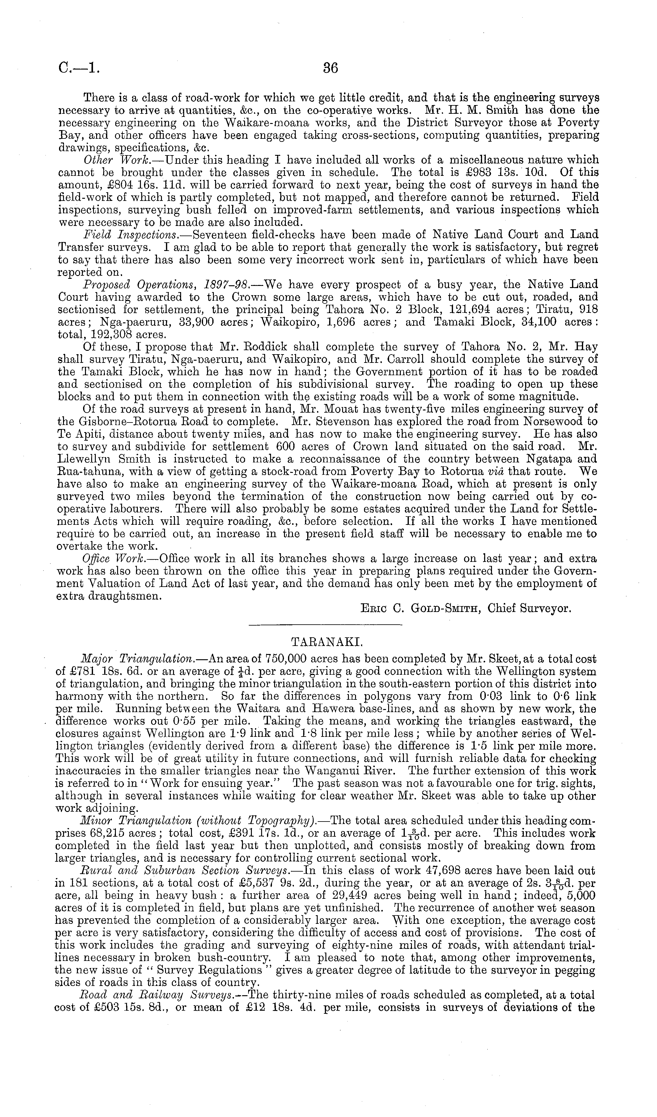 There is a class of road-work for which we get little credit, and that is the engineering surveys necessary to arrive at quantities, &c, on the co-operative works. Mr. H. M. Smith has done the necessary engineering on the Waikare-moana works, and the District Surveyor those at Poverty Bay, and other officers have been engaged taking cross-sections, computing quantities, preparing drawings, specifications, &c. Other Work. —Under this heading I have included all works of a miscellaneous nature which cannot be brought under the classes given in schedule. The total is £983 13s. lOd. Of this amount, £804 16s. lid. will be carried forward to next year, being the cost of surveys in hand the field-work of which is partly completed, but not mapped, and therefore cannot be returned. Field inspections, surveying bush felled on improved-farm settlements, and various inspections which were necessary to be made are also included. Field Inspections. —Seventeen field-checks have been made of Native Land Court and Land Transfer surveys. lam glad to be able to report that generally the work is satisfactory, but regret to say that there has also been some very incorrect work sent in, particulars of which have been reported on. Proposed Operations, 1897-98. —We have every prospect of a busy year, the Native Land Court having awarded to the Crown some large areas, which have to be cut out, roaded, and sectionised for settlement, the principal being Tahora No. 2 Block, 121,694 acres; Tiratu, 918 acres; Nga-paeruru, 33,900 acres; Waikopiro, 1,696 acres; and Tamaki Block, 34,100 acres: total, 192,308 acres. Of these, I propose that Mr. Eoddick shall complete the survey of Tahora No. 2, Mr. Hay shall survey Tiratu, Nga-naeruru, and Waikopiro, and Mr. Carroll should complete the survey of the Tamaki Block, which he has now in hand; the Government portion of it has to be roaded and sectionised on the completion of his subdivisional survey. The roading to open up these blocks and to put them in connection with the existing roads will be a work of some magnitude. Of the road surveys at present in hand, Mr. Mouat has twenty-five miles engineering survey of the Gisborne-Botorua Eoad to complete. Mr. Stevenson has explored the road from Norsewood to Te Apiti, distance about twenty miles, and has now to make the engineering survey. He has also to survey and subdivide for settlement 600 acres of Crown land situated on the said road. Mr. Llewellyn Smith is instructed to make a reconnaissance of the country between Ngatapa and Bua-tahuna, with a view of getting a stock-road from Poverty Bay to Botorua vid that route. We have also to make an engineering survey of the Waikare-moana Boad, which at present is only surveyed two miles beyond the termination of the construction now being carried out by cooperative labourers. There will also probably be some estates acquired under the Land for Settlements Acts which will require roading, &c, before selection. If all the works I have mentioned require to be carried out, an increase in the present field staff will be necessary to enable me to overtake the work. Office Work. —Office work in all its branches shows a large increase on last year; and extra work has also been thrown on the office this year in preparing plans required under the Government Valuation of Land Act of last year, and the demand has only been met by the employment of extra draughtsmen. Ebic C. Gold-Smith, Chief Surveyor.
