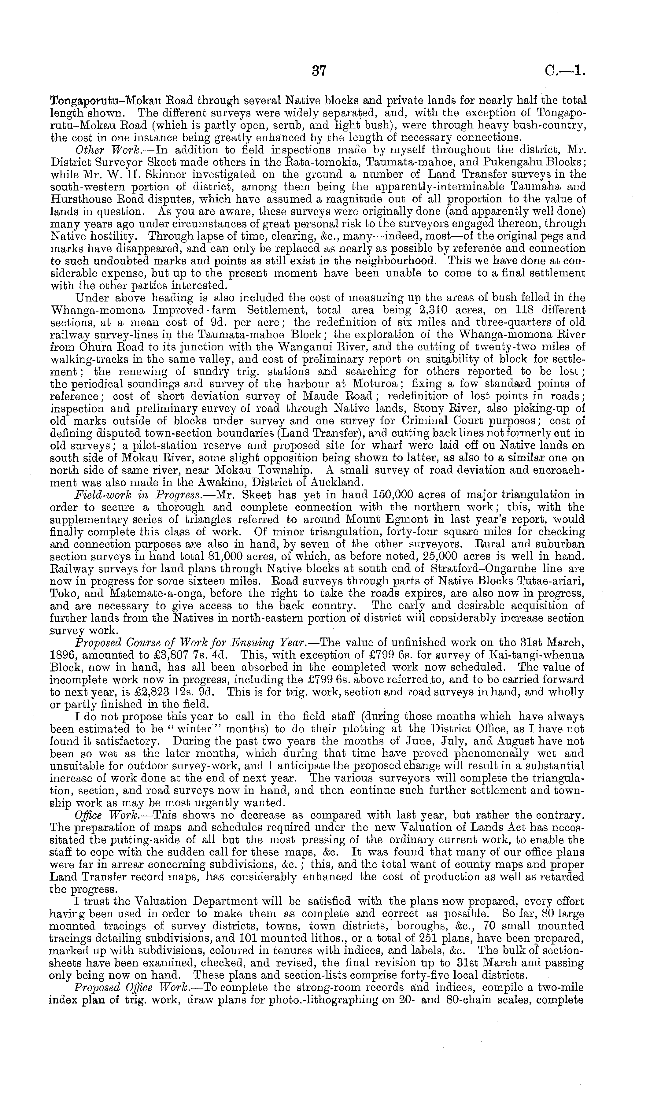 Tongaporutu-Mokau Boad through several Native blocks and private lands for nearly half the total length shown. The different surveys were widely separated, and, with the exception of Tongapo-rutu-Mokau Boad (which is partly open, scrub, and light bush), were through heavy bush-country, the cost in one instance being greatly enhanced by the length of necessary connections. Other Work. —ln addition to field inspections made by myself throughout the district, Mr. District Surveyor Skeet made others in the Bata-tomokia, Taumata-mahoe, and Pukengahu Blocks; while Mr. W. H. Skinner investigated on the ground a number of Land Transfer surveys in the south-western portion of district, among them being the apparently-interminable Taumaha and Hursthouse Eoad disputes, which have assumed a magnitude out of all proportion to the value of lands in question. As you are aware, these surveys were originally done (and apparently well done) many years ago under circumstances of great personal risk to the surveyors engaged thereon, through Native hostility. Through lapse of time, clearing, &c, many—indeed, most—of the original pegs and marks have disappeared, and can only be replaced as nearly as possible by reference and connection to such undoubted marks and points as still exist in the neighbourhood. This we have done at considerable expense, but up to the present moment have been unable to come to a final settlement with the other parties interested. Under above heading is also included the cost of measuring up the areas of bush felled in the Whanga-momona Improved - farm Settlement, total area being 2,310 acres, on 118 different sections, at a mean cost of 9d. per acre; the redefinition of six miles and three-quarters of old railway survey-lines in the Taumata-mahoe Block; the exploration of the Whanga-momona Eiver from Ohura Eoad to its junction with the Wanganui Biver, and the cutting of twenty-two miles of walking-tracks in the same valley, and cost of preliminary report on suitability of block for settlement ; the renewing of sundry trig, stations and searching for others reported to be lost; the periodical soundings and survey of the harbour at Moturoa; fixing a few standard points of reference; cost of short deviation survey of Maude Boad ; redefinition of lost points in roads; inspection and preliminary survey of road through Native lands, Stony Biver, also picking-up of old marks outside of blocks under survey and one survey for Criminal Court purposes; cost of defining disputed town-section boundaries (Land Transfer), and cutting back lines not formerly cut in old surveys; a pilot-station reserve and proposed site for wharf were laid off on Native lands on south side of Mokau Biver, some slight opposition being shown to latter, as also to a similar one on north side of same river, near Mokau Township. A small survey of road deviation and encroachment was also made in the Awakino, District of Auckland. Field-work in Progress. —Mr. Skeet has yet in hand 150,000 acres of major triangulation in order to secure a thorough and complete connection with the northern work; this, with the supplementary series of triangles referred to around Mount Egmont in last year's report, would finally complete this class of work. Of minor triangulation, forty-four square miles for checking and connection purposes are also in hand, by seven of the other surveyors. Bural and suburban section surveys in hand total 81,000 acres, of which, as before noted, 25,000 acres is well in hand. Eailway surveys for land plans through Native blocks at south end of Stratford-Ongaruhe line are now in progress for some sixteen miles. Boad surveys through parts of Native Blocks Tutae-ariari, Toko, and Matemate-a-onga, before the right to take the roads expires, are also now in progress, and are necessary to give access to the back country. The early and desirable acquisition of further lands from the Natives in north-eastern portion of district will considerably increase section survey work. Proposed Course of Work for Ensuing Year. —The value of unfinished work on the 31st March, 1896, amounted to £3,807 7s. 4d. This, with exception of £799 6s. for survey of Kai-tangi-whenua Block, now in hand, has all been absorbed in the completed work now scheduled. The value of incomplete work now in progress, including the £799 6s. above referred to, and to be carried forward to next year, is £2,823 12s. 9d. This is for trig, work, section and road surveys in hand, and wholly or partly finished in the field. I do not propose this year to call in the field staff (during those months which have always been estimated to be " winter " months) to do their plotting at the District Office, as I have not found it satisfactory. During the past two years the months of June, July, and August have not been so wet as the later months, which during that time have proved phenomenally wet and unsuitable for outdoor survey-work, and I anticipate the proposed change will result in a substantial increase of work done at the end of next year. The various surveyors will complete the triangulation, section, and road surveys now in hand, and then continue such further settlement and township work as may be most urgently wanted. Office Work. —This shows no decrease as compared with last year, but rather the contrary. The preparation of maps and schedules required under the new Valuation of Lands Act has necessitated the putting-aside of all but the most pressing of the ordinary current work, to enable the staff to cope with the sudden call for these maps, &c. It was found that many of our office plans were far in arrear concerning subdivisions, &c. ; this, and the total want of county maps and proper Land Transfer record maps, has considerably enhanced the cost of production as well as retarded the progress. I trust the Valuation Department will be satisfied with the plans now prepared, every effort having been used in order to make them as complete an