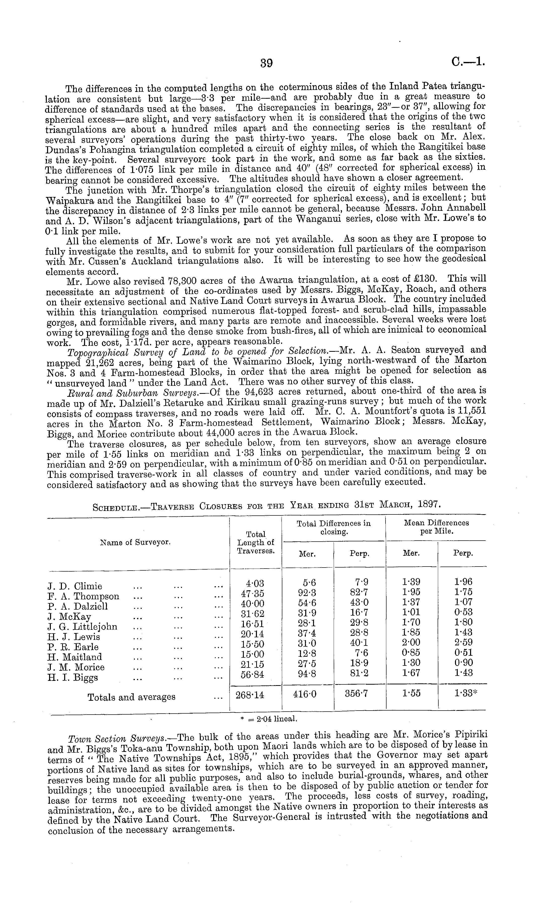 The differences in the computed lengths on the coterminous sides of the Inland Patea triangulation are consistent but large—3-3 per mile—and are probably due in a great measure to difference of standards used at the bases. The discrepancies in bearings, 23"—or 37", allowing for spherical excess—are slight, and very satisfactory when it is considered that the origins of the twc triangulations are about a hundred miles apart and the connecting series is the resultant of several surveyors' operations during the past thirty-two years. The close back on Mr. Alex. Dundas's Pohangina triangulation completed a circuit of eighty miles, of which the Bangitikei base is the key-point. Several surveyors took part in the work, and some as far back as the sixties. The differences of 1-075 link per mile in distance and 40" (48" corrected for spherical excess) in bearing cannot be considered excessive. The altitudes should have shown a closer agreement. The junction with Mr. Thorpe's triangulation closed the circuit of eighty miles between the Waipakura and the Bangitikei base to 4" (7" corrected for spherical excess), and is excellent; but the discrepancy in distance of 2-3 links per mile cannot be general, because Messrs. John Annabell and A. D. Wilson's adjacent triangulations, part of the Wanganui series, close with Mr. Lowe's to 0-1 link per mile. All the elements of Mr. Lowe's work are not yet available. As soon as they are I propose to fully investigate the results, and to submit for your consideration full particulars of the comparison with Mr. Cussen's Auckland triangulations also. It will be interesting to see how the geodesical elements accord. Mr. Lowe also revised 78,300 acres of the Awarua triangulation, at a cost of £130. This will necessitate an adjustment of the co-ordinates used by Messrs. Biggs, McKay, Boach, and others on their extensive sectional and Native Land Court surveys in Awarua Block. The country included within this triangulation comprised numerous flat-topped forest- and scrub-clad hills, impassable gorges, and formidable rivers, and many parts are remote and inaccessible. Several weeks were lost owing to prevailing fogs and the dense smoke from bush-fires, all of which are inimical to economical work. The cost, l-17d. per acre, appears reasonable. Topographical Survey of Land to be opened for Selection.—Mr. A. A. Seaton surveyed and mapped 21,262 acres, being part of the Waimarino Block, lying north-westward of the Marton Nos. 3 and 4 Farm-homestead Blocks, in order that the area might be opened for selection as " unsurveyed land " under the Land Act. There was no other survey of this class. Rural and Suburban Surveys.—ol the 94,623 acres returned, about one-third of the area is made up of Mr. Dalziell's Betaruke and Kirikau small grazing-runs survey; but much of the work consists of compass traverses, and no roads were laid off. Mr. C. A. Mountfort's quota is 11,551 acres in the Marton No. 3 Farm-homestead Settlement, Waimarino Block; Messrs. McKay, Biggs, and Morice contribute about 44,000 acres in the Awarua Block. The traverse closures, as per schedule below, from ten surveyors, show an average closure per mile of 1-55 links on meridian and 1-33 links on perpendicular, the maximum being 2 on meridian and 2-59 on perpendicular, with a minimum of 0-85 on meridian and 0-51 on perpendicular. This comprised traverse-work in all classes of country and under varied conditions, and may be considered satisfactory and as showing that the surveys have been carefully executed.