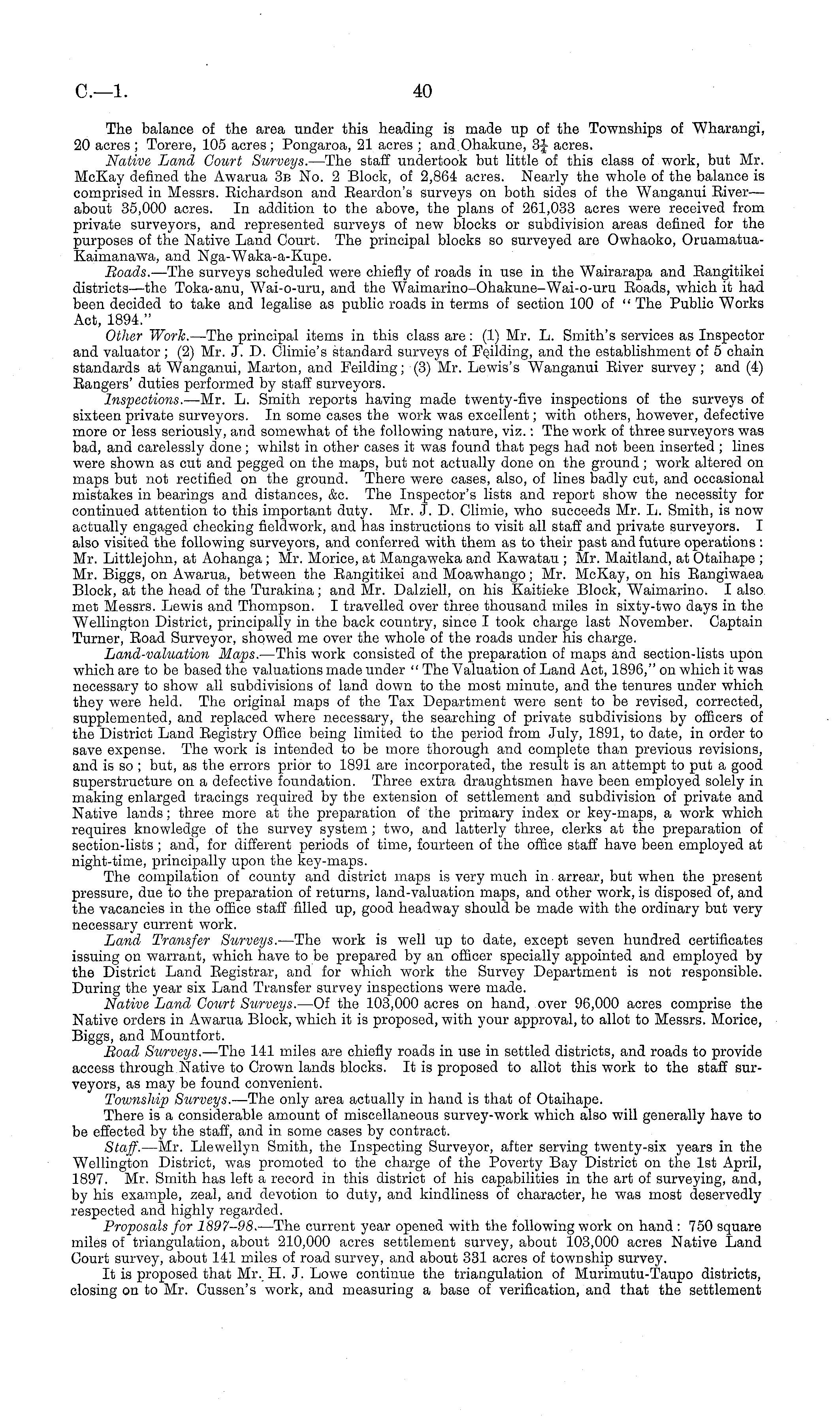 The balance of the area under this heading is made up of the Townships of Wharangi, 20 acres ; Torere, 105 acres; Pongaroa, 21 acres ; and.Ohakune, 3J acres. Native Land Court Surveys. —The staff undertook but little of this class of work, but Mr. McKay defined the Awarua 3b No. 2 Block, of 2,864 acres. Nearly the whole of the balance is comprised in Messrs. Bichardson and Beardon's surveys on both sides of the Wanganui Biver — about 35,000 acres. In addition to the above, the plans of 261,033 acres were received from private surveyors, and represented surveys of new blocks or subdivision areas defined for the purposes of the Native Land Court. The principal blocks so surveyed are Owhaoko, OruamatuaKaimanawa, and Nga-Waka-a-Kupe. Boads.- —The surveys scheduled were chiefly of roads in use in the Wairarapa and Bangitikei districts —the Toka-anu, Wai-o-uru, and the Waimarino-Ohakune-Wai-o-uru Boads, which it had been decided to take and legalise as public roads in terms of section 100 of " The Public Works Act, 1894." Other Work. —The principal items in this class are : (1) Mr. L. Smith's services as Inspector and valuator; (2) Mr. J. D. Chime's standard surveys of Fending, and the establishment of 5 chain standards at Wanganui, Marton, and Feilding; (3) Mr. Lewis's Wanganui Biver survey; and (4) Bangers' duties performed by staff surveyors. Inspections. —Mr. L. Smith reports having made twenty-five inspections of the surveys of sixteen private surveyors. In some cases the work was excellent; with others, however, defective more or less seriously, and somewhat of the following nature, viz.: The work of three surveyors was bad, and carelessly done; whilst in other cases it was found that pegs had not been inserted ; lines were shown as cut and pegged on the maps, but not actually done on the ground; work altered on maps but not rectified on the ground. There were cases, also, of lines badly cut, and occasional mistakes in bearings and distances, &c. The Inspector's lists and report show the necessity for continued attention to this important duty. Mr. J. D. Climie, who succeeds Mr. L. Smith, is now actually engaged checking fieldwork, and has instructions to visit all staff and private surveyors. I also visited the following surveyors, and conferred with them as to their past and future operations : Mr. Littlejohn, at Aohanga; Mr. Morice, at Mangaweka and Kawatau ; Mr. Maitland, at Otaihape ; Mr. Biggs, on Awarua, between the Bangitikei and Moawhango; Mr. McKay, on his Bangiwaea Block, at the head of the Turakina; and Mr. Dalziell, on his Kaitieke Block, Waimarino. I also, met Messrs. Lewis and Thompson. I travelled over three thousand miles in sixty-two days in the Wellington District, principally in the back country, since I took charge last November. Captain Turner, Boad Surveyor, showed me over the whole of the roads under his charge. Land-valuation Maps. —This work consisted of the preparation of maps and section-lists upon which are to be based the valuations made under " The Valuation of Land Act, 1896," on which it was necessary to show all subdivisions of land down to the most minute, and the tenures under which they were held. The original maps of the Tax Department were sent to be revised, corrected, supplemented, and replaced where necessary, the searching of private subdivisions by officers of the District Land Begistry Office being limited to the period from July, 1891, to date, in order to save expense. The work is intended to be more thorough and complete than previous revisions, and is so ; but, as the errors prior to 1891 are incorporated, the result is an attempt to put a good superstructure on a defective foundation. Three extra draughtsmen have been employed solely in making enlarged tracings required by the extension of settlement and subdivision of private and Native lands; three more at the preparation of the primary index or key-maps, a work which requires knowledge of the survey system; two, and latterly three, clerks at the preparation of section-lists; and, for different periods of time, fourteen of the office staff have been employed at night-time, principally upon the key-maps. The compilation of county and district maps is very much in. arrear, but when the present pressure, due to the preparation of returns, land-valuation maps, and other work, is disposed of, and the vacancies in the office staff filled up, good headway should be made with the ordinary but very necessary current work. Land Transfer Surveys. —The work is well up to date, except seven hundred certificates issuing on warrant, which have to be prepared by an officer specially appointed and employed by the District Land Begistrar, and for which work the Survey Department is not responsible. During the year six Land Transfer survey inspections were made. Native Land Court Surveys. —Of the 103,000 acres on hand, over 96,000 acres comprise the Native orders in Awarua Block, which it is proposed, with your approval, to allot to Messrs. Morice, Biggs, and Mountfort. Boad Surveys. —The 141 miles are chiefly roads in use in settled districts, and roads to provide access through Native to Crown lands blocks. It is proposed to allot this work to the staff surveyors, as may be found convenient. Township Surveys. —The only area actually in hand is that of Otaihape. There is a considerable amount of miscellaneous survey-work which also will generally have to be effected by the staff, and in some cases by contract. Staff. —Mr. Llewellyn Smith, the Inspecting Surveyor, after serving twenty-six years in the Wellington District, was promoted to the charge of the Poverty Bay District on the Ist April, 1897. Mr. Smith has left a record in this district of his capabilities in the art of surveying, and, by his example, zeal, and devotion to duty, and kindliness of character, he was most deservedly respected and highly regarded. Proposals for 1897-98. —The current year opened with the follow