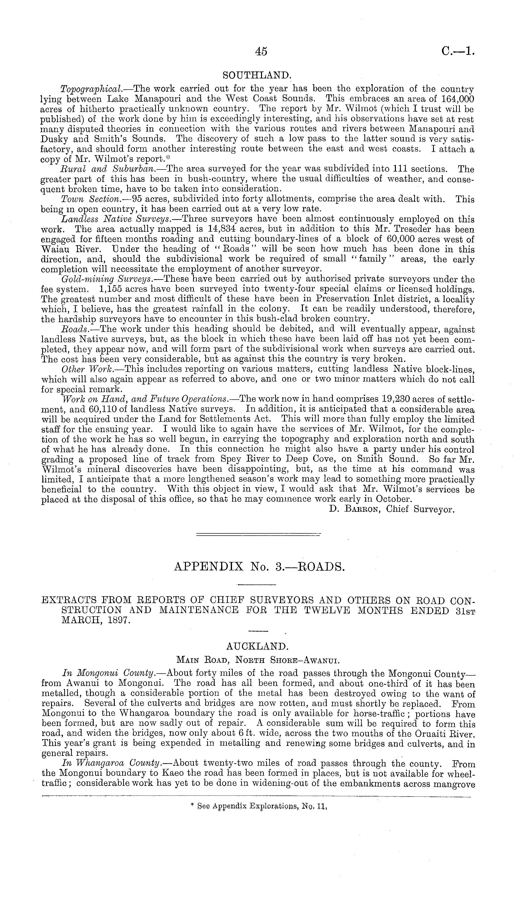 SOUTHLAND. Topographical. —The work carried out for the year has been the exploration of the country lying between Lake Manapouri and the West Coast Sounds. This embraces an area of 164,000 acres of hitherto practically unknown country. The report by Mr. Wilmot (which I trust will be published) of the work done by him is exceedingly interesting, and his observations have set at rest many disputed theories in connection with the various routes and rivers between Manapouri and Dusky and Smith's Sounds. The discovery of such a low pass to the latter sound is very satisfactory, and should form another interesting route between the east and west coasts. I attach a copy of Mr. Wilmot's report.* Rural and Suburban. —The area surveyed for the year was subdivided into 111 sections. The greater part of this has been in bush-country, where the usual difficulties of weather, and consequent broken time, have to be taken into consideration. Town Section. —95 acres, subdivided into forty allotments, comprise the area dealt with. This being in open country, it has been carried out at a very low rate. Landless Native Surveys. —Three surveyors have been almost continuously employed on this work. The area actually mapped is 14,834 acres, but in addition to this Mr. Treseder has been engaged for fifteen months roading and cutting boundary-lines of a block of 60,000 acres west of Waiau Eiver. Under the heading of "Eoads" will be seen how much has been done in this direction, and, should the subdivisional work be required of small "family" areas, the early completion will necessitate the employment of another surveyor. Gold-mining Surveys. —These have been carried out by authorised private surveyors under the fee system. 1,155 acres have been surveyed into twenty-four special claims or licensed holdings. The greatest number and most difficult of these have been in Preservation Inlet district, a locality which, I believe, has the greatest rainfall in the colony. It can be readily understood, therefore, the hardship surveyors have to encounter in this bush-clad broken country. Roads. —The work under this heading should be debited, and will eventually appear, against landless Native surveys, but, as the block in which these have been laid off has not yet been completed, they appear now, and will form part of the subdivisional work when surveys are carried out. The cost has been very considerable, but as against this the country is very broken. Other Work. —This includes reporting on various matters, cutting landless Native block-lines, which will also again appear as referred to above, and one or two minor matters which do not call for special remark. Work on Hand, and Future Operations. —The work now in hand comprises 19,230 acres of settlement, and 60,110 of landless Native surveys. In addition, it is anticipated that a considerable area will be acquired under the Land for Settlements Act. This will more than fully employ the limited staff for the ensuing year. I would like to again have the services of Mr. Wilmot, for the completion of the work he has so well begun, in carrying the topography and exploration north and south of what he has already done. In this connection he might also have a party under his control grading a proposed line of track from Spey Biver to Deep Cove, on Smith Sound. So far Mr. Wilmot's mineral discoveries have been disappointing, but, as the time at his command was limited, I anticipate that a more lengthened season's work may lead to something more practically beneficial to the country. With this object in view, I would ask that Mr. Wilmot's services be placed at the disposal of this office, so that he may commence work early in October. D. Baeeon, Chief Surveyor.