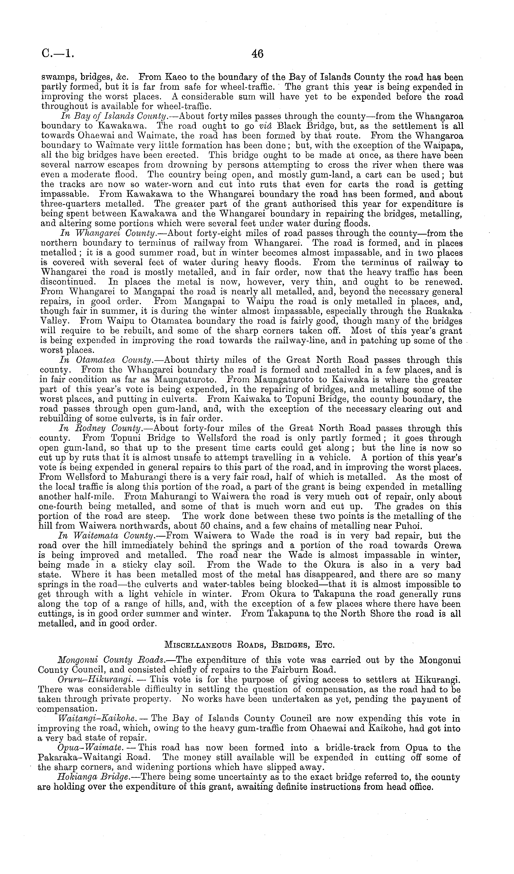 swamps, bridges, &c. From Kaeo to the boundary of the Bay of Islands County the road has been partly formed, but it is far from safe for wheel-traffic. The grant this year is being expended in improving the worst places. A considerable sum will have yet to be expended before the road throughout is available for wheel-traffic. In Bay of Islands County. —About forty miles passes through the county—from the Whangaroa boundary to Kawakawa. The road ought to go via Black Bridge, but, as the settlement is all towards Ohaewai and Waimate, the road has been formed by that route. From the Whangaroa boundary to Waimate very little formation has been done; but, with the exception of the Waipapa, all the big bridges have been erected. This bridge ought to be made at once, as there have been several narrow escapes from drowning by persons attempting to cross the river when there was even a moderate flood. The country being open, and mostly gum-land, a cart can be used; but the tracks are now so water-worn and cut into ruts that even for carts the road is getting impassable. From Kawakawa to the Whangarei boundary the road has been formed, and about three-quarters metalled. The greater part of the grant authorised this year for expenditure is being spent between Kawakawa and the Whangarei boundary in repairing the bridges, metalling, and altering some portions which were several feet under water during floods. In Whangarei County. —About forty-eight miles of road passes through the county—from the northern boundary to terminus of railway from Whangarei. The road is formed, and in places metalled ; it is a good summer road, but in winter becomes almost impassable, and in two places is covered with several feet of water during heavy floods. From the terminus of railway to Whangarei the road is mostly metalled, and in fair order, now that the heavy traffic has been discontinued. In places the metal is now, however, very thin, and ought to be renewed. From Whangarei to Mangapai the road is nearly all metalled, and, beyond the necessary general repairs, in good order. From Mangapai to Waipu the road is only metalled in places, and, though fair in summer, it is during the winter almost impassable, especially through the Buakaka Valley. From Waipu to Otamatea boundary the road is fairly good, though many of the bridges will require to be rebuilt, and some of the sharp corners taken off. Most of this year's grant is being expended in improving the road towards the railway-line, and in patching up some of the worst places. In Otamatea County. —About thirty miles of the Great North Eoad passes through this county. From the Whangarei boundary the road is formed and metalled in a few places, and is in fair condition as far as Maungaturoto. From Maungaturoto to Kaiwaka is where the greater part of this year's vote is being expended, in the repairing of bridges, and metalling some of the worst places, and putting in culverts. From Kaiwaka to Topuni Bridge, the county boundary, the road passes through open gum-land, and, with the exception of the necessary clearing out and rebuilding of some culverts, is in fair order. In Rodney County. —About forty-four miles of the Great North Boad passes through this county. From Topuni Bridge to Wellsford the road is only partly formed; it goes through open gum-land, so that up to the present time carts could get along; but the line is now so cut up by ruts that it is almost unsafe to attempt travelling in a vehicle. A portion of this year's vote is being expended in general repairs to this part of the road, and in improving the worst places. From Wellsford to Mahurangi there is a very fair road, half of which is metalled. As the most of the local traffic is along this portion of the road, a part of the grant is being expended in metalling another half-mile. From Mahurangi to Waiwera the road is very much out of repair, only about one-fourth being metalled, and some of that is much worn and cut up. The grades on this portion of the road are steep. The work done between these two points is the metalling of the hill from Waiwera northwards, about 50 chains, and a few chains of metalling near Puhoi. In Waitemata County. —From Waiwera to Wade the road is in very bad repair, but the road over the hill immediately behind the springs and a portion of the road towards Orewa is being improved and metalled. The road near the Wade is almost impassable in winter, being made in a sticky clay soil. From the Wade to the Okura is also in a very bad state. Where it has been metalled most of the metal has disappeared, and there are so many springs in the road—the culverts and water-tables being blocked —that it is almost impossible to get through with a light vehicle in winter. From Okura to Takapuna the road generally runs along the top of a range of hills, and, with the exception of a few places where there have been cuttings, is in good order summer and winter. From Takapuna to the North Shore the road is all metalled, and in good order. Miscellaneous Boads, Beidges, Etc. Mongonui County Roads. —The expenditure of this vote was carried out by the Mongonui County Council, and consisted chiefly of repairs to the Fairburn Eoad. Oruru-Hikurangi. — This vote is for the purpose of giving access to settlers at Hikurangi. There was considerable difficulty in settling the question of compensation, as the road had to be taken through private property. No works have been undertaken as yet, pending the payment of compensation. Waitangi-Kaikohe. — The Bay of Islands County Council are now expending this vote in improving the road, which, owing to the heavy gum-traffic from Ohaewai and Kaikohe, had got into a very bad state of repair. Opua-Waimate. — This road has now been formed into a bridle-track from Opua to the Pakaraka-Waitangi Eoad. The money still available will be expended in cutting off some of the sharp corners, and widening portions which have slipped away. Hokianga Bri