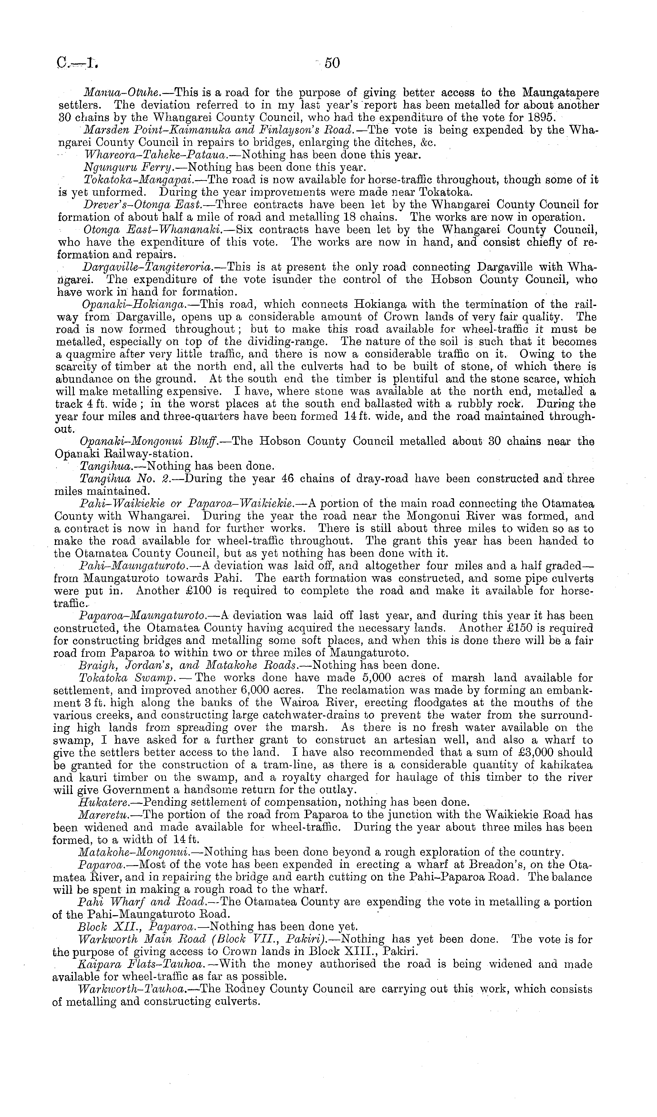 Manua-Otuhe. —This is a road for the purpose of giving better access to the Maungatapere settlers. The deviation referred to in my last year's report has been metalled for about another 30 chains by the Whangarei County Council, who had the expenditure of the vote for 1895. Marsden Point-Kaimanuka and Finlayson's Road. —The vote is being expended by the Whangarei County Council in repairs to bridges, enlarging the ditches, &c. Whareora-Taheke-Pataua. —Nothing has been done this year. Ngunguru Ferry. —Nothing has been done this year. Tokatoka-Mangapai. —The road is now available for horse-traffic throughout, though some of it is yet unformed. During the year improvements were made near Tokatoka. Drever's-Otonga East. —Three contracts have been let by the Whangarei County Council for formation of about half a mile of road and metalling 18 chains. The works are now in operation. Otonga East-Whananaki. —Six contracts have been let by the Whangarei County Council, who have the expenditure of this vote. The works are now in hand, and consist chiefly of reformation and repairs. Dargaville-Tangiteroria. —This is at present the only road connecting Dargaville with Whangarei. The expenditure of the vote isunder the control of the Hobson County Council, who have work in hand for formation. Opanaki-Hokianga. —This road, which connects Hokianga with the termination of the railway from Dargaville, opens up a considerable amount of Crown lands of very fair quality. The road is now formed throughout; but to make this road available for wheel-traffic it must be metalled, especially on top of the dividing-range. The nature of the soil is such that it becomes a quagmire after very little traffic, and there is now a considerable traffic on it. Owing to the scarcity of timber at the north end, all the culverts had to be built of stone, of which there is abundance on the ground. At the south end the timber is plentiful and the stone scarce, which will make metalling expensive. I have, where stone was available at the north end, metalled a track 4 ft. wide ; in the worst places at the south end ballasted with a rubbly rock. During the year four miles and three-quarters have been formed 14 ft. wide, and the road maintained throughout. Opanaki-Mongonui Bluff. —The Hobson County Council metalled about 30 chains near the Opanaki Eailway-station. Tangihua. —Nothing has been done. Tangihua No. 2. —During the year 46 chains of dray-road have been constructed and three miles maintained. Pahi-Waikiekie or Paparoa-Waikiekie. —A portion of the main road connecting the Otamatea County with Whangarei. During the year the road near the Mongonui Biver was formed, and a contract is now in hand for further works. There is still about three miles to widen so as to make the road available for wheel-traffic throughout. The grant this year has been handed to the Otamatea County Council, but as yet nothing has been done with it. Pahi-Maungaturoto. —A deviation was laid off, and altogether four miles and a half graded— from Maungaturoto towards Pahi. The earth formation was constructed, and some pipe culverts were put in. Another £100 is required to complete the road and make it available for horsetraffic. Paparoa-Maungaturoto. —A deviation was laid off last year, and during this year it has been constructed, the Otamatea County having acquired the necessary lands. Another £150 is required for constructing bridges and metalling some soft places, and when this is done there will be a fair road from Paparoa to within two or three miles of Maungaturoto. Braigh, Jordan's, and Matakohe Roads. —Nothing has been done. Tokatoka Swamp. — The works done have made 5,000 acres of marsh land available for settlement, and improved another 6,000 acres. The reclamation was made by forming an embankment 3 ft. high along the banks of the Wairoa Eiver, erecting floodgates at the mouths of the various creeks, and constructing large catch water-drains to prevent the water from the surrounding high lands from spreading over the marsh. As there is no fresh water available on the swamp, I have asked for a further grant to construct an artesian well, and also a wharf to give the settlers better access to the land. I have also recommended that a sum of £3,000 should be granted for the construction of a tram-line, as there is a considerable quantity of kahikatea and kauri timber on the swamp, and a royalty charged for haulage of this timber to the river will give Government a handsome return for the outlay. Hukatere. —Pending settlement of compensation, nothing has been done. Mareretu. —The portion of the road from Paparoa to the junction with the Waikiekie Eoad has been widened and made available for wheel-traffic. During the year about three miles has been formed, to a width of 14 ft. Matakohe-Mongonui. —Nothing has been done beyond a rough exploration of the country. Paparoa. —Most of the vote has been expended in erecting a wharf at Breadon's, on the Otamatea Biver, and in repairing the bridge and earth cutting on the Pahi-Paparoa Boad. The balance will be spent in making a rough road to the wharf. Pahi Wharf and Road. —The Otamatea County are expending the vote in metalling a portion of the Pahi-Maungaturoto Boad. Block XII., Paparoa. —Nothing has been done yet. Warkworth Main Road (Block VII., Pakiri). —Nothing has yet been done. The vote is for the purpose of giving access to Crown lands in Block XIII., Pakiri. Kaipara Flats-Tauhoa. —With the money authorised the road is being widened and made available for wheel-traffic as far as possible. Warkworth-Tauhoa. —The Eodney County Council are carrying out this work, which consists of metalling and constructing culverts.