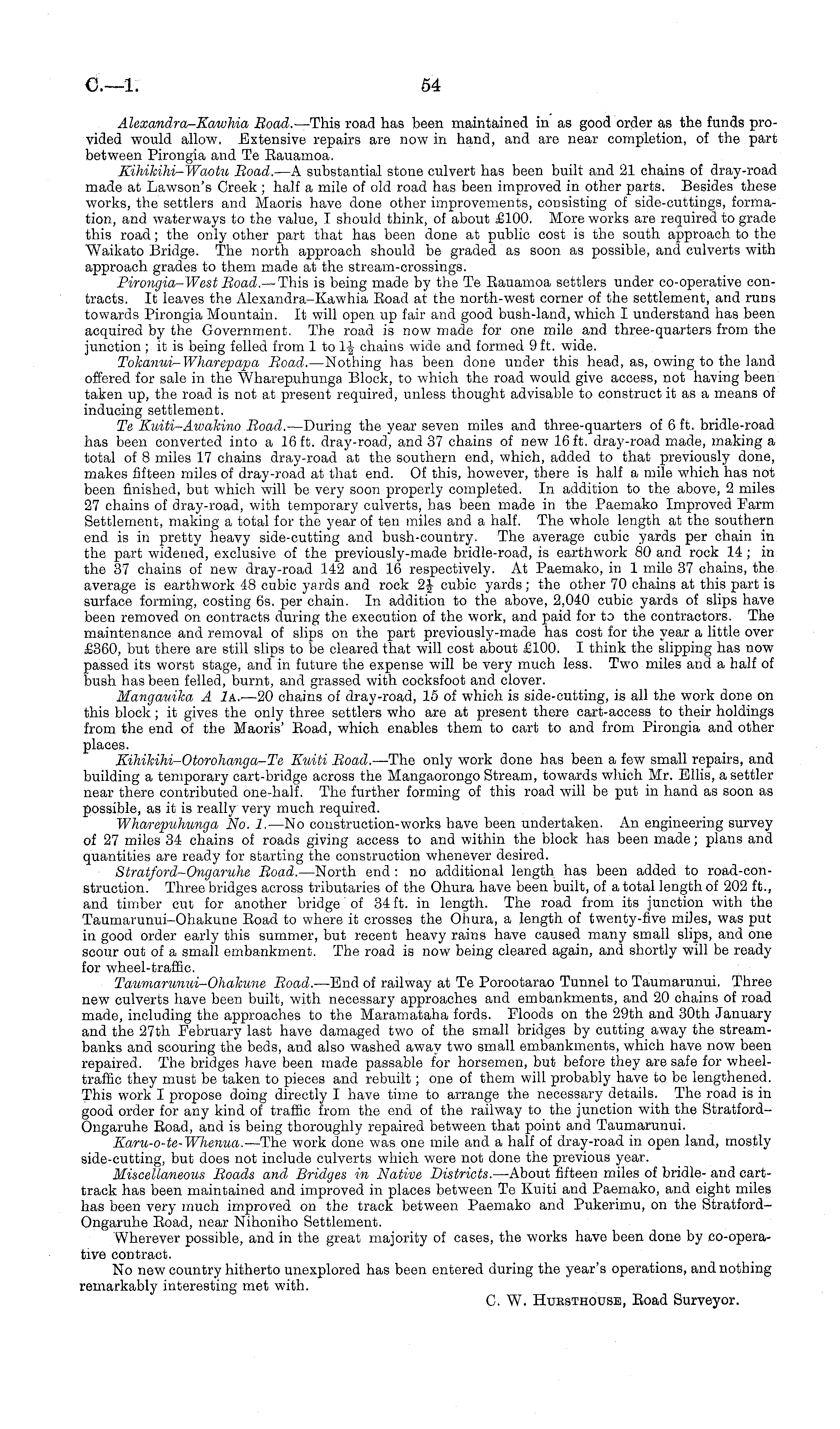 Alexandra-Kawhia Road.— This road has been maintained in as good order as the funds provided would allow. Extensive repairs are now in hand, and are near completion, of the part between Pirongia and Te Bauamoa. Kihikihi-Waotu Road. —A substantial stone culvert has been built and 21 chains of dray-road made at Lawson's Creek ; half a mile of old road has been improved in other parts. Besides these works, the settlers and Maoris have done other improvements, consisting of side-cuttings, formation, and waterways to the value, I should think, of about £100. More works are required to grade this road; the only other part that has been done at public cost is the south approach to the Waikato Bridge. The north approach should be graded as soon as possible, and culverts with approach grades to them made at the stream-crossings. Pirongia-West Road. — This is being made by the Te Bauamoa settlers under co-operative contracts. It leaves the Alexandra-Kawhia Boad at the north-west corner of the settlement, and runs towards Pirongia Mountain. It will open up fair and good bush-land, which I understand has been acquired by the Government. The road is now made for one mile and three-quarters from the junction ; it is being felled from 1 to 1-J chains wide and formed 9 ft. wide. Tokanui-Wharepapa Road. —Nothing has been done under this head, as, owing to the land offered for sale in the Wharepuhunga Block, to which the road would give access, not having been taken up, the road is not at present required, unless thought advisable to construct it as a means of inducing settlement. Te Kuiti-Awakino Road. —During the year seven miles and three-quarters of 6 ft. bridle-road has been converted into a 16 ft. dray-road, and 37 chains of new 16 ft. dray-road made, making a total of 8 miles 17 chains dray-road at the southern end, which, added to that previously done, makes fifteen miles of dray-road at that end. Of this, however, there is half a mile which has not been finished, but which will be very soon properly completed. In addition to the above, 2 miles 27 chains of dray-road, with temporary culverts, has been made in the Paemako Improved Farm Settlement, making a total for the year of ten miles and a half. The whole length at the southern end is in pretty heavy side-cutting and bush-country. The average cubic yards per chain in the part widened, exclusive of the previously-made bridle-road, is earthwork 80 and rock 14 ; in the 37 chains of new dray-road 142 and 16 respectively. At Paemako, in 1 mile 37 chains, the average is earthwork 48 cubic yards and rock 2-J cubic yards; the other 70 chains at this part is surface forming, costing 6s. per chain. In addition to the above, 2,040 cubic yards of slips have been removed on contracts during the execution of the work, and paid for to the contractors. The maintenance and removal of slips on the part previously-made has cost for the year a little over £360, but there are still slips to be cleared that will cost about £100. I think the slipping has now passed its worst stage, and in future the expense will be very much less. Two miles and a half of bush has been felled, burnt, and grassed with cocksfoot and clover. Mangauika A Ik. —20 chains of dray-road, 15 of which is side-cutting, is all the work done on this block; it gives the only three settlers who are at present there cart-access to their holdings from the end of the Maoris' Boad, which enables them to cart to and from Pirongia and other places. Kihikihi-Otorohanga-Te Kuiti Road. —The only work done has been a few small repairs, and building a temporary cart-bridge across the Mangaorongo Stream, towards which Mr. Ellis, a settler near there contributed one-half. The further forming of this road will be put in hand as soon as possible, as it is really very much required. Wharepuhunga No. I. —No construction-works have been undertaken. An engineering survey of 27 miles 34 chains of roads giving access to and within the block has been made; plans and quantities are ready for starting the construction whenever desired. Stratford-Ongaruhe Road. —North end: no additional length has been added to road-con-struction. Three bridges across tributaries of the Ohura have been built, of a total length of 202 ft., and timber cut for another bridge of 34 ft. in length. The road from its junction with the Taumarunui-Ohakune Eoad to where it crosses the Ohura, a length of twenty-five miles, was put in good order early this summer, but recent heavy rains have caused many small slips, and one scour out of a small embankment. The road is now being cleared again, and shortly will be ready for wheel-traffic. Taumarunui-Ohakune Road. —End of railway at Te Porootarao Tunnel to Taumarunui. Three new culverts have been built, with necessary approaches and embankments, and 20 chains of road made, including the approaches to the Maramataha fords. Floods on the 29th and 30th January and the 27th February last have damaged two of the small bridges by cutting away the streambanks and scouring the beds, and also washed away two small embankments, which have now been repaired. The bridges have been made passable for horsemen, but before they are safe for wheeltraffic they must be taken to pieces and rebuilt; one of them will probably have to be lengthened. This work I propose doing directly I have time to arrange the necessary details. The road is in good order for any kind of traffic from the end of the railway to the junction with the StratfordOngaruhe Eoad, and is being thoroughly repaired between that point and Taumarunui. Karu-o-te-Whenua. —The work done was one mile and a half of dray-road in open land, mostly side-cutting, but does not include culverts which were not done the previous year. Miscellaneous Roads and Bridges in Native Districts. —About fifteen miles of bridle- and carttrack has been maintained and improved in places between Te Kuiti and Paemako, and eight miles has been very much improved