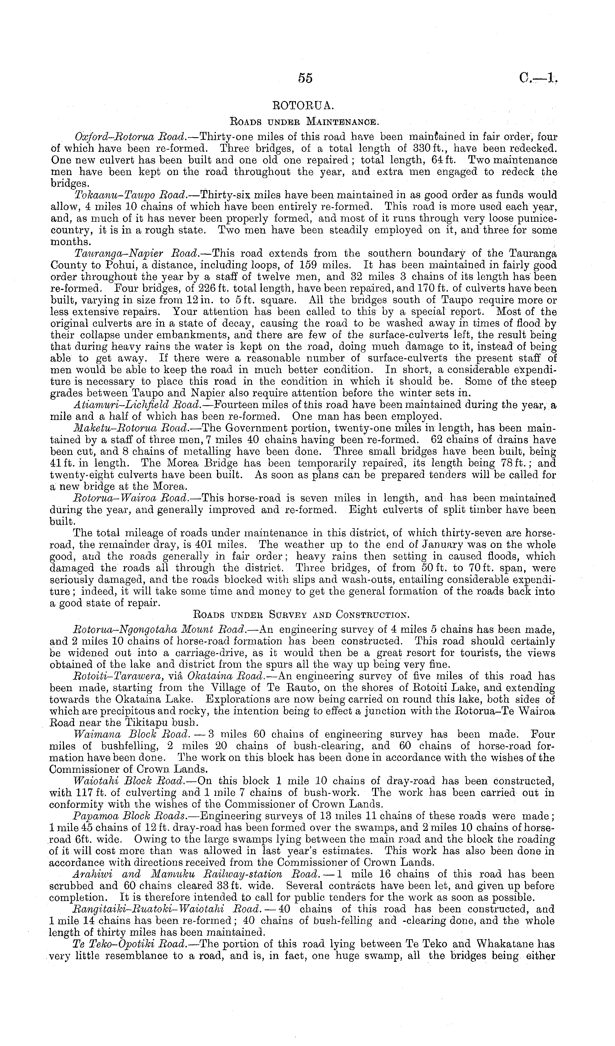 EOTOEUA. Boads tjndee Maintenance. Oxford-Rotorua Road. —Thirty-one miles of this road have been maintained in fair order, four of which have been re-formed. Three bridges, of a total length of 330 ft., have been redecked. One new culvert has been built and one old one repaired ; total length, 64 ft. Two maintenance men have been kept on the road throughout the year, and extra men engaged to redeck the bridges. Tokaanu-Taupo Road. —Thirty-six miles have been maintained in as good order as funds would allow, 4 miles 10 chains of which have been entirely re-formed. This road is more used each year, and, as much of it has never been properly formed, and most of it runs through very loose pumicecountry, it is in a rough state. Two men have been steadily employed on it, and three for some months. Tauranga-Napier Road. —This road extends from the southern boundary of the Tauranga County to Pohui, a distance, including loops, of 159 miles. It has been maintained in fairly good order throughout the year by a staff of twelve men, and 32 miles 3 chains of its length has been re-formed. Four bridges, of 226 ft. total length, have been repaired, and 170 ft. of culverts have been built, varying in size from 12 in. to 5 ft. square. All the bridges south of Taupo require more or less extensive repairs. Your attention has been called to this by a special report. Most of the original culverts are in a state of decay, causing the road to be washed away in times of flood by their collapse under embankments, and there are few of the surface-culverts left, the result being that during heavy rains the water is kept on the road, doing much damage to it, instead of being able to get away. If there were a reasonable number of surface-culverts the present staff of men would be able to keep the road in much better condition. In short, a considerable expenditure is necessary to place this road in the condition in which it should be. Some of the steep grades between Taupo and Napier also require attention before the winter sets in. Atiamuri-Liehfield Road. —Fourteen miles of tliis road have been maintained during the year, a mile and a half of which has been re-formed. One man has been employed. Maketu-Rotorua Road. —The Government portion, twenty-one miles in length, has been maintained by a staff of three men, 7 miles 40 chains having been re-formed. 62 chains of drains have been cut, and 8 chains of metalling have been done. Three small bridges have been built, being 41 ft. in length. The Morea Bridge has been temporarily repaired, its length being 78 ft.; and twenty-eight culverts have been built. As soon as plans can be prepared tenders will be called for a new bridge at the Morea. Rotorua-Wairoa Road. —This horse-road is seven miles in length, and has been maintained during the year, and generally improved and re-formed. Eight culverts of split timber have been built. The total mileage of roads under maintenance in this district, of which thirty-seven are horseroad, the remainder dray, is 401 miles. The weather up to the end of January was on the whole good, and the roads generally in fair order; heavy rains then setting in caused floods, which damaged the roads all through the district. Three bridges, of from 50 ft. to 70 ft. span, were seriously damaged, and the roads blocked with slips and wash-outs, entailing considerable expenditure ; indeed, it will take some time and money to get the general formation of the roads back into a good state of repair. Boads undeb Suevey and Construction. Rotorua-Ngongotaha Mount Road. —An engineering survey of 4 miles 5 chains has been made, and 2 miles 10 chains of horse-road formation has been constructed. This road should certainly be widened out into a carriage-drive, as it would then be a great resort for tourists, the views obtained of the lake and district from the spurs all the way up being very fine. Rotoiti-Tarawera, via Okataina Road. —An engineering survey of five miles of this road has been made, starting from the Village of Te Bauto, on the shores of Eotoiti Lake, and extending towards the Okataina Lake. Explorations are now being carried on round this lake, both sides of which are precipitous and rocky, the intention being to effect a junction with the Eotorua-Te Wairoa Boad near the Tikitapu bush. Waimana Block Road. — 3 miles 60 chains of engineering survey has been made. Four miles of bushfelling, 2 miles 20 chains of bush-clearing, and 60 chains of horse-road formation have been done. The work on this block has been done in accordance with the wishes of the Commissioner of Crown Lands. Waiotahi Block Road. —On this block 1 mile 10 chains of dray-road has been constructed, with 117 ft. of culverting and 1 mile 7 chains of bush-work. The work has been carried out in conformity with the wishes of the Commissioner of Crown Lands. Papamoa Block Roads. —Engineering surveys of 13 miles 11 chains of these roads were made; 1 mile 45 chains of 12 ft. dray-road has been formed over the swamps, and 2 miles 10 chains of horseroad 6ft. wide. Owing to the large swamps lying between the main road and the block the roading of it will cost more than was allowed in last year's estimates. This work has also been done in accordance with directions received from the Commissioner of Crown Lands. Arahiwi and Mamuku Railway-station Road. — 1 mile 16 chains of this road has been scrubbed and 60 chains cleared 33 ft. wide. Several contracts have been let, and given up before completion. It is therefore intended to call for public tenders for the work as soon as possible. Rangitaiki-Ruatoki-Waiotahi Road. —40 chains of this road has been constructed, and 1 mile 14 chains has been re-formed; 40 chains of bush-felling and -clearing done, and the whole length of thirty miles has been maintained. Te Teko-Opotiki Road. —The portion of this road lying between Te Teko and Whakatane has very little resemblance to a road, and is, in fact, one huge swamp, all the b