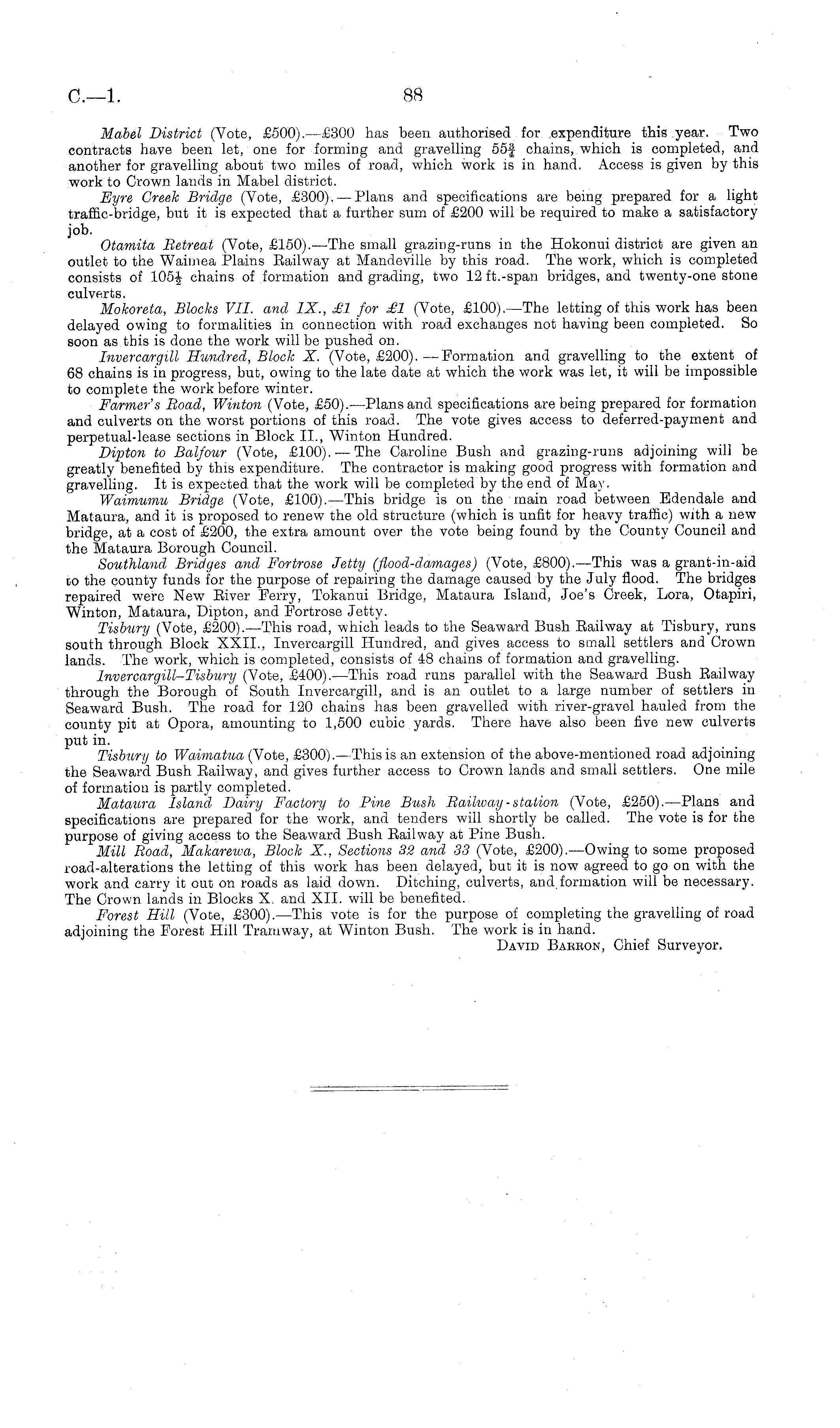 Mabel District (Vote, £500). —£300 has been authorised for expenditure this year. Two contracts have been let, one for forming and gravelling 55} chains, which is completed, and another for gravelling about two miles of road, which work is in hand. Access is given by this work to Crown lauds in Mabel district. Eyre Creek Bridge (Vote, £300). — Plans and specifications are being prepared for a light traffic-bridge, but it is expected that a further sum of £200 will be required to make a satisfactory job. Otamita Retreat (Vote, £150). —The small grazing-runs in the Hokonui district are given an outlet to the Waimea Plains Bailway at Mandeville by this road. The work, which is completed consists of 105| chains of formation and grading, two 12 ft.-span bridges, and twenty-one stone culverts. Mokoreta, Blocks VII. and IX., £1 for £1 (Vote, £100). —The letting of this work has been delayed owing to formalities in connection with road exchanges not having been completed. So soon as this is done the work will be pushed on. Invercargill Hundred, Block X. (Vote, £200). —Formation and gravelling to the extent of 68 chains is in progress, but, owing to the late date at which the work was let, it will be impossible to complete the work before winter. Farmer's Road, Winton (Vote, £50). —Plans and specifications are being prepared for formation and culverts on the worst portions of this road. The vote gives access to deferred-payment and perpetual-lease sections in Block 11., Winton Hundred. Dipton to Balfour (Vote, £100). — The Caroline Bush and grazing-runs adjoining will be greatly benefited by this expenditure. The contractor is making good progress with formation and gravelling. It is expected that the work will be completed by the end of May. Waimumu Bridge (Vote, £100). —This bridge is on the main road between Edendale and Mataura, and it is proposed to renew the old structure (which is unfit for heavy traffic) with a new bridge, at a cost of £200, the extra amount over the vote being found by the County Council and the Mataura Borough Council. Southland Bridges and Fortrose Jetty (flood-damages) (Vote, £800). —This was a grant-in-aid co the county funds for the purpose of repairing the damage caused by the July flood. The bridges repaired were New Biver Ferry, Tokanui Bridge, Mataura Island, Joe's Creek, Lora, Otapiri, Winton, Mataura, Dipton, and Fortrose Jetty. Tisbury (Vote, £200). —This road, which leads to the Seaward Bush Eailway at Tisbury, runs south through Block XXII., Invercargill Hundred, and gives access to small settlers and Crown lands. The work, which is completed, consists of 48 chains of formation and gravelling. Invercargill-Tisbury (Vote, £400). —This road runs parallel with the Seaward Bush Eailway through the Borough of South Invercargill, and is an outlet to a large number of settlers in Seaward Bush. The road for 120 chains has been gravelled with river-gravel hauled from the county pit at Opora, amounting to 1,500 cubic yards. There have also been five new culverts put in. Tisbury to Waimatua (Vote, £300). —This is an extension of the above-mentioned road adjoining the Seaward Bush Bailway, and gives further access to Crown lands and small settlers. One mile of formation is partly completed. Mataura Island Dairy Factory to Pine Bush Railway-station (Vote, £250). —Plans and specifications are prepared for the work, and tenders will shortly be called. The vote is for the purpose of giving access to the Seaward Bush Eailway at Pine Bush. Mill Road, Makarewa, Block X., Sections 32 and 33 (Vote, £200). —Owing to some proposed road-alterations the letting of this work has been delayed, but it is now agreed to go on with the work and carry it out on roads as laid down. Ditching, culverts, and formation will be necessary. The Crown lands in Blocks X. and XII. will be benefited. Forest Hill (Vote, £300). —This vote is for the purpose of completing the gravelling of road adjoining the Forest Hill Tramway, at Winton Bush. The work is in hand. David Babeon, Chief Surveyor.