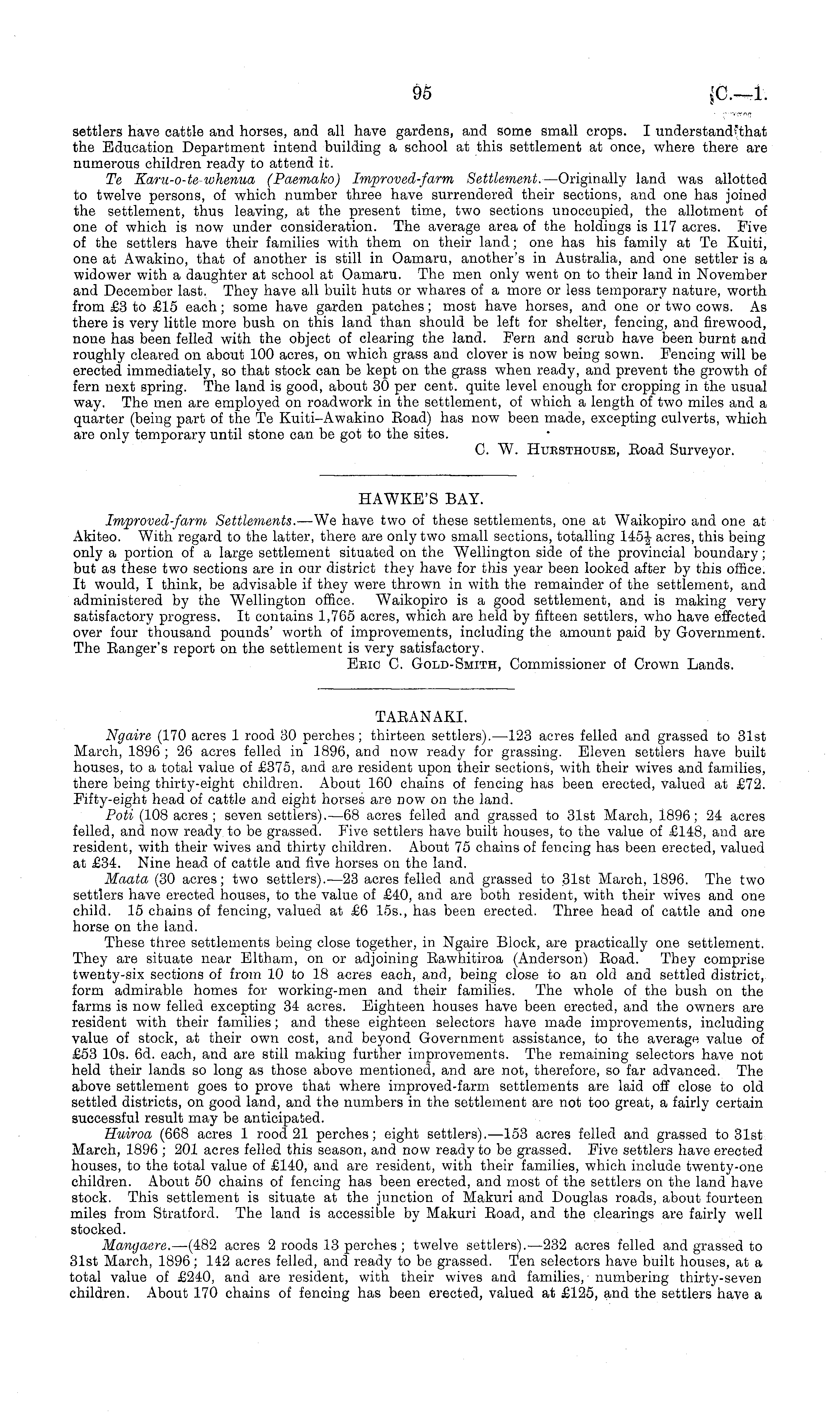 settlers have cattle and horses, and all have gardens, and some small crops. I understand'that the Education Department intend building a school at this settlement at once, where there are numerous children ready to attend it. Te Karu-o-te-whenua (Paemako) Improved-farm Settlement. —Originally land was allotted to twelve persons, of which number three have surrendered their sections, and one has joined the settlement, thus leaving, at the present time, two sections unoccupied, the allotment of one of which is now under consideration. The average area of the holdings is 117 acres. Five of the settlers have their families with them on their land; one has his family at Te Kuiti, one at Awakino, that of another is still in Oamaru, another's in Australia, and one settler is a widower with a daughter at school at Oamaru. The men only went on to their land in November and December last. They have all built huts or whares of a more or less temporary nature, worth from £3 to £15 each; some have garden patches; most have horses, and one or two cows. As there is very little more bush on this land than should be left for shelter, fencing, and firewood, none has been felled with the object of clearing the land. Fern and scrub have been burnt and roughly cleared on about 100 acres, on which grass and clover is now being sown. Fencing will be erected immediately, so that stock can be kept on the grass when ready, and prevent the growth of fern next spring. The land is good, about 30 per cent, quite level enough for cropping in the usual way. The men are employed on roadwork in the settlement, of which a length of two miles and a quarter (being part of the Te Kuiti-Awakino Boad) has now been made, excepting culverts, which are only temporary until stone can be got to the sites. C. W. Hursthouse, Boad Surveyor.