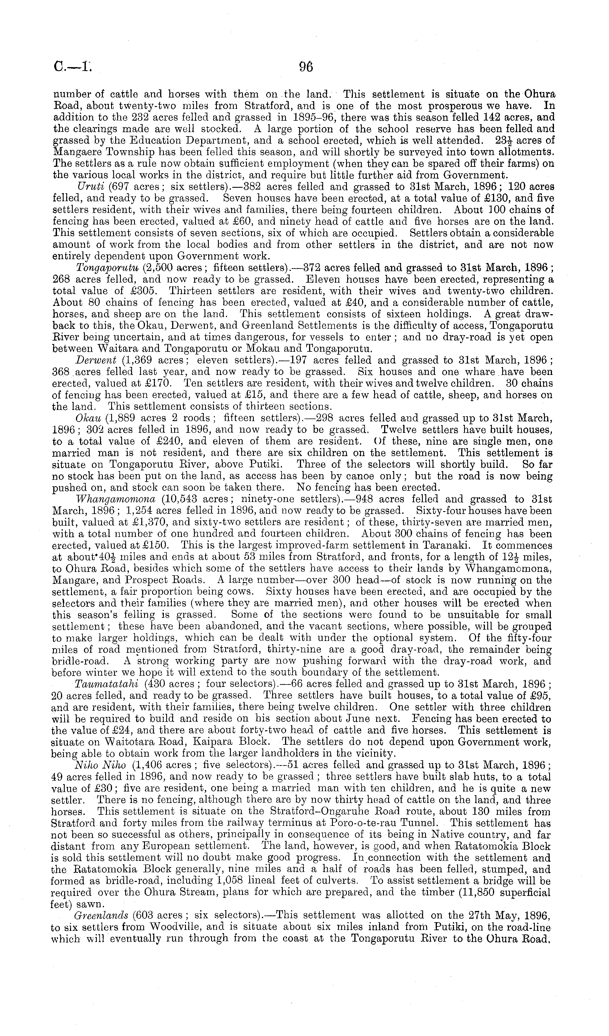 number of cattle and horses with them on the land. This settlement is situate on the Ohura Eoad, about twenty-two miles from Stratford, and is one of the most prosperous we have. In addition to the 232 acres felled and grassed in 1895-96, there was this season felled 142 acres, and the clearings made are well stocked. A large portion of the school reserve has been felled and grassed by the Education Department, and a school erected, which is well attended. 23J acres of Mangaere Township has been felled this season, and will shortly be surveyed into town allotments. The settlers as a rule now obtain sufficient employment (when they can be spared off their farms) on the various local works in the district, and require but little further aid from Government. Uruti (697 acres; six settlers). —382 acres felled and grassed to 31st March, 1896; 120 acres felled, and ready to be grassed. Seven houses have been erected, at a total value of £130, and five settlers resident, with their wives and families, there being fourteen children. About 100 chains of fencing has been erected, valued at £60, and ninety head of cattle and five horses are on the land. This settlement consists of seven sections, six of which are occupied. Settlers obtain a considerable amount of work from the local bodies and from other settlers in the district, and are not now entirely dependent upon Government work. Tongaporutu (2,500 acres; fifteen settlers). —372 acres felled and grassed to 31st March, 1896 ; 268 acres felled, and now ready to be grassed. Eleven houses have been erected, representing a total value of £305. Thirteen settlers are resident, with their wives and twenty-two children. About 80 chains of fencing has been erected, valued at £40, and a considerable number of cattle, horses, and sheep are on the land. This settlement consists of sixteen holdings. A great drawback to this, the Okau, Derwent, and Greenland Settlements is the difficulty of access, Tongaporutu Eiver being uncertain, and at times dangerous, for vessels to enter ; and no dray-road is yet open between Waitara and Tongaporutu or Mokau and Tongaporutu. Derwent (1,369 acres; eleven settlers). —197 acres felled and grassed to 31st March, 1896; 368 acres felled last year, and now ready to be grassed. Six houses and one whare.have been erected, valued at £170. Ten settlers are resident, with their wives and twelve children. 30 chains of fencing has been erected, valued at £15, and there are a few head of cattle, sheep, and horses on the land. This settlement consists of thirteen sections. Okau (1,889 acres 2 roods ; fifteen settlers). —298 acres felled and grassed up to 31st March, 1896; 302 acres felled in 1896, and now ready to be grassed. Twelve settlers have built houses, to a total value of £240, and eleven of them are resident. Of these, nine are single men, one married man is not resident, and there are six children on the settlement. This settlement is situate on Tongaporutu Biver, above Putiki. Three of the selectors will shortly build. So far no stock has been put on the land, as access has been by canoe only ; but the road is now being pushed on, and stock can soon be taken there. No fencing has been erected. Whangamomona (10,543 acres; ninety-one settlers). —948 acres felled and grassed to 31st March, 1896 ; 1,254 acres felled in 1896, and now ready to be grassed. Sixty-four houses have been built, valued at £1,370, and sixty-two settlers are resident; of these, thirty-seven are married men, with a total number of one hundred and fourteen children. About 300 chains of fencing has been erected, valued at £150. This is the largest improved-farm settlement in Taranaki. It commences at about"4of miles and ends at about 53 miles from Stratford, and fronts, for a length of YA\ miles, to Ohura Boad, besides which some of the settlers have access to their lands by Whangamomona, Mangare, and Prospect Boads. A large number—over 300 head—of stock is now running on the settlement, a fair proportion being cows. Sixty houses have been erected, and are occupied by the selectors and their families (where they are married men), and other houses will be erected when this season's felling is grassed. Some of the sections were found to be unsuitable for small settlement; these have been abandoned, and the vacant sections, where possible, will be grouped to make larger holdings, which can be dealt with under the optional system. Of the fifty-four miles of road mentioned from Stratford, thirty-nine are a good dray-road, the remainder being bridle-road. A strong working party are now pushing forward with the dray-road work, and before winter we hope it will extend to the south boundary of the settlement. Taumatatahi (430 acres ; four selectors). —66 acres felled and grassed up to 31st March, 1896 ; 20 acres felled, and ready to be grassed. Three settlers have built houses, to a total value of £95, and are resident, with their families, there being twelve children. One settler with three children will be required to build and reside on his section about June next. Fencing has been erected to the value of £24, and there are about forty-two head of cattle and five horses. This settlement is situate on Waitotara Boad, Kaipara Block. The settlers do not depend upon Government work, being able to obtain work from the larger landholders in the vicinity. Niho Niho (1,406 acres ; five selectors). —51 acres felled and grassed up to 31st March, 1896; 49 acres felled in 1896, and now ready to be grassed ; three settlers have built slab huts, to a total value of £30; five are resident, one being a married man with ten children, and he is quite a new settler. There is no fencing, although there are by now thirty head of cattle on the land, and three horses. This settlement is situate on the Stratford-Ongaruhe Eoad route, about 130 miles from Stratford and forty miles from the railway terminus at Poro-o-te-rau Tunnel. This settlement has not bee