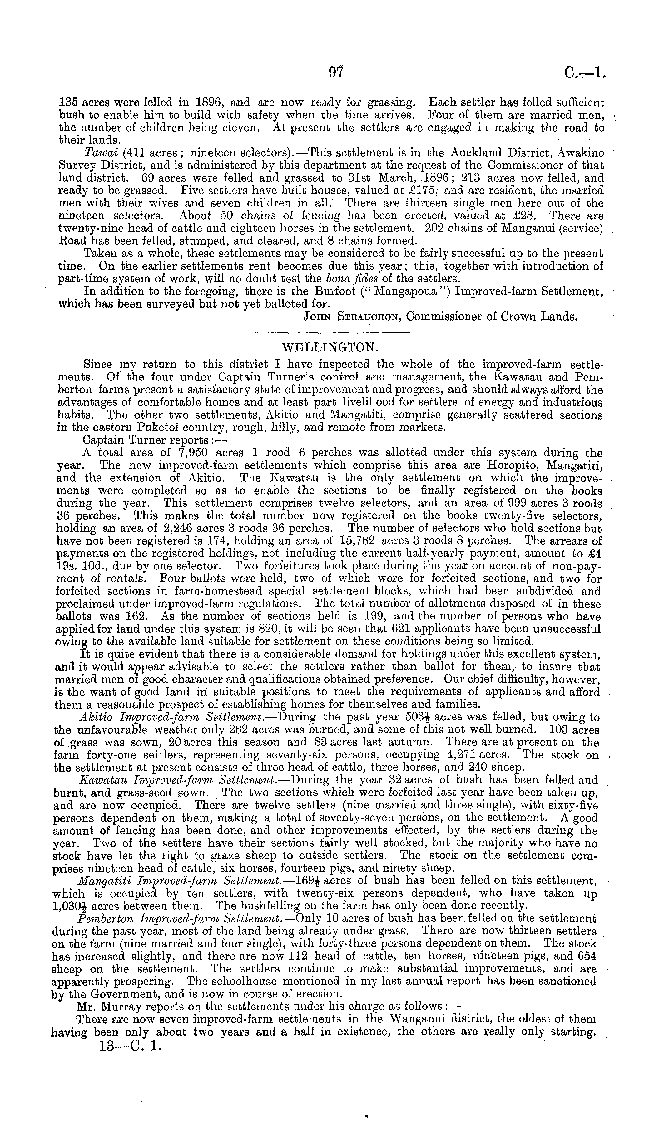 135 acres were felled in 1896, and are now ready for grassing. Each settler has felled sufficient bush to enable him to build with safety when the time arrives. Four of them are married men, the number of children being eleven. At present the settlers are engaged in making the road to their lands. Tawai (411 acres ; nineteen selectors). —This settlement is in the Auckland District, Awakino Survey District, and is administered by this department at the request of the Commissioner of that land district. 69 acres were felled and grassed to 31st March, 1896; 213 acres now felled, and ready to be grassed. Five settlers have built houses, valued at £175, and are resident, the married men with their wives and seven children in all. There are thirteen single men here out of the nineteen selectors. About 50 chains of fencing has been erected, valued at £28. There are twenty-nine head of cattle and eighteen horses in the settlement. 202 chains of Manganui (service) Boad has been felled, stumped, and cleared, and 8 chains formed. Taken as a whole, these settlements may be considered to be fairly successful up to the present time. On the earlier settlements rent becomes due this year; this, together with introduction of part-time system of work, will no doubt test the bona fides of the settlers. In addition to the foregoing, there is the Burfoot (" Mangapoua") Improved-farm Settlement, which has been surveyed but not yet balloted for. John Stbauchon, Commissioner of Crown Lands.