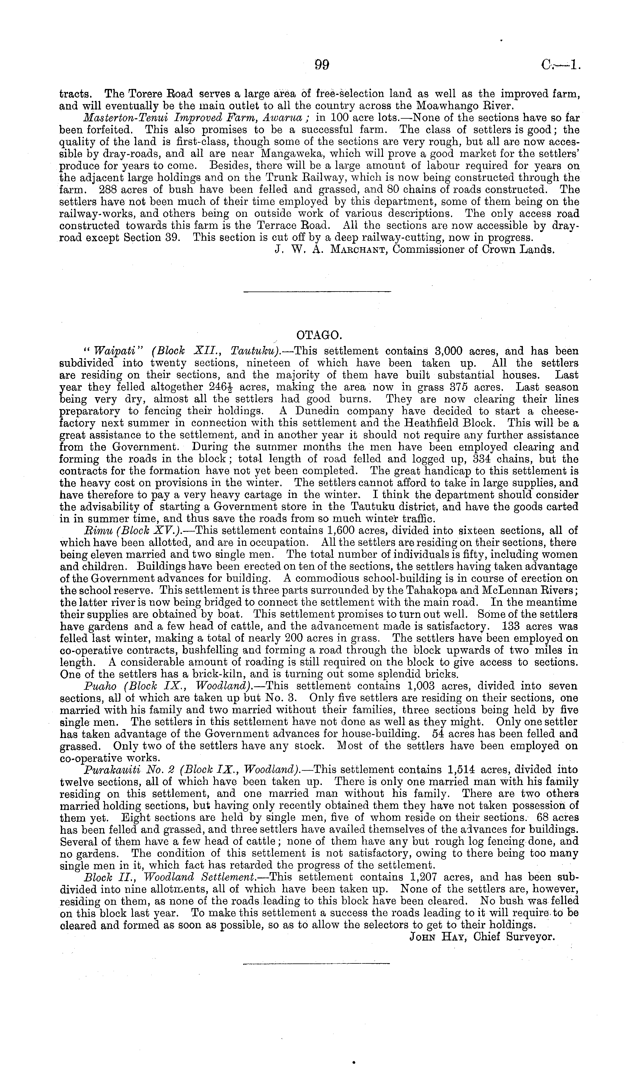 OTAGO. "Waipati" (Block XII., Tautuku). —This settlement contains 3,000 acres, and has been subdivided into twenty sections, nineteen of which have been taken up. All the settlers are residing on their sections, and the majority of them have built substantial houses. Last year they felled altogether 246-| acres, making the area now in grass 375 acres. Last season being very dry, almost all the settlers had good burns. They are now clearing their lines preparatory to fencing their holdings. A Dunedin company have decided to start a cheesefactory next summer in connection with this settlement and the Heathfield Block. This will be a great assistance to the settlement, and in another year it should not require any further assistance from the Government. During the summer months the men have been employed clearing and forming the roads in the block; total length of road felled and logged up, 334 chains, but the contracts for the formation have not yet been completed. The great handicap to this settlement is the heavy cost on provisions in the winter. The settlers cannot afford to take in large supplies, and have therefore to pay a very heavy cartage in the winter. I think the department should consider the advisability of starting a Government store in the Tautuku district, and have the goods carted in in summer time, and thus save the roads from so much winter traffic. Rimu (Block XV.). —This settlement contains 1,600 acres, divided into sixteen sections, all of which have been allotted, and are in occupation. All the settlers are residing on their sections, there being eleven married and two single men. The total number of individuals is fifty, including women and children. Buildings have been erected on ten of the sections, the settlers having taken advantage of the Government advances for building. A commodious school-building is in course of erection on the school reserve. This settlement is three parts surrounded by the Tahakopa and McLennan Eivers; the latter river is now being bridged to connect the settlement with the main road. In the meantime their supplies are obtained by boat. This settlement promises to turn out well. Some of the settlers have gardens and a few head of cattle, and the advancement made is satisfactory. 133 acres was felled last winter, making a total of nearly 200 acres in grass. The settlers have been employed on co-operative contracts, bushfelling and forming a road through the block upwards of two miles in length. A considerable amount of roading is still required on the block to give access to sections. One of the settlers has a brick-kiln, and is turning out some splendid bricks. Puaho (Block IX., Woodland). —This settlement contains 1,003 acres, divided into seven sections, all of which are taken up but No. 3. Only five settlers are residing on their sections, one married with his family and two married without their families, three sections being held by five single men. The settlers in this settlement have not done as well as they might. Only one settler has taken advantage of the Government advances for house-building. 54 acres has been felled and grassed. Only two of the settlers have any stock. Most of the settlers have been employed on co-operative works. Purakauiti No. 2 (Block IX., Woodland). —This settlement contains 1,514 acres, divided into twelve sections, all of which have been taken up. There is only one married man with his family residing on this settlement, and one married man without his family. There are two others married holding sections, but having only recently obtained them they have not taken possession of them yet. Eight sections are held by single men, five of whom reside on their sections. 68 acres has been felled and grassed, and three settlers have availed themselves of the advances for buildings. Several of them have a few head of cattle; none of them have any but rough log fencing done, and no gardens. The condition of this settlement is not satisfactory, owing to there being too many single men in it, which fact has retarded the progress of the settlement. Block 11., Woodland Settlement. —This settlement contains 1,207 acres, and has been subdivided into nine allotments, all of which have been taken up. None of the settlers are, however, residing on them, as none of the roads leading to this block have been cleared. No bush was felled on this block last year. To make this settlement a success the roads leading to it will require to be cleared and formed as soon as possible, so as to allow the selectors to get to their holdings. John Hay, Chief Surveyor.