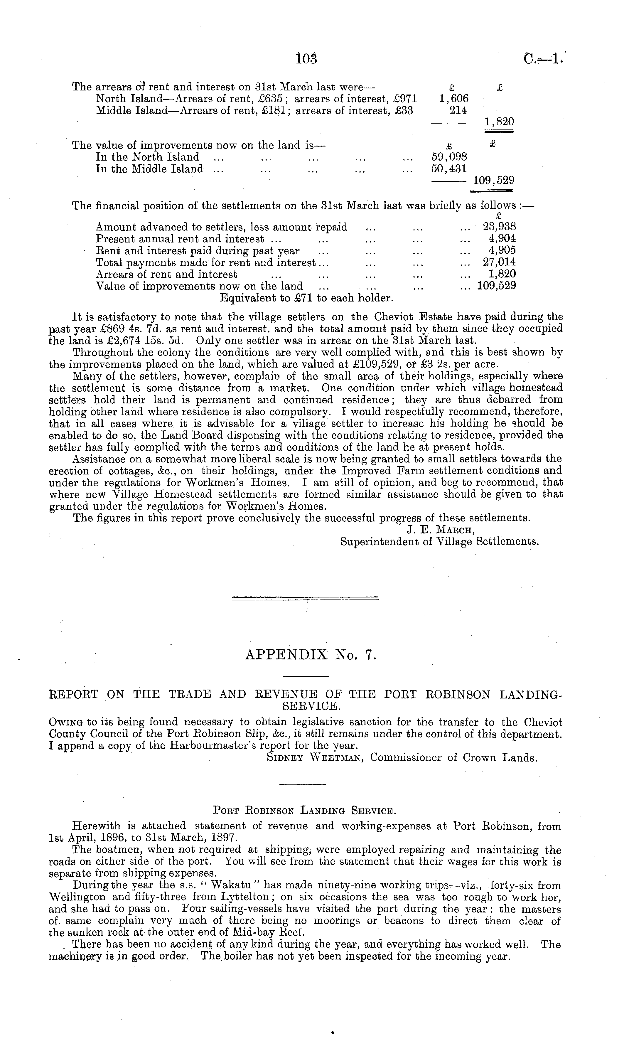 REPORT ON THE TRADE AND REVENUE OP THE PORT ROBINSON LANDINGSERVICE. Owing to its being found necessary to obtain legislative sanction for the transfer to the Cheviot County Council of the Port Robinson Slip, &c, it still remains under the control of this department. I append a copy of the Harbourmaster's report for the year. Sidney Westman, Commissioner of Crown Lands.
