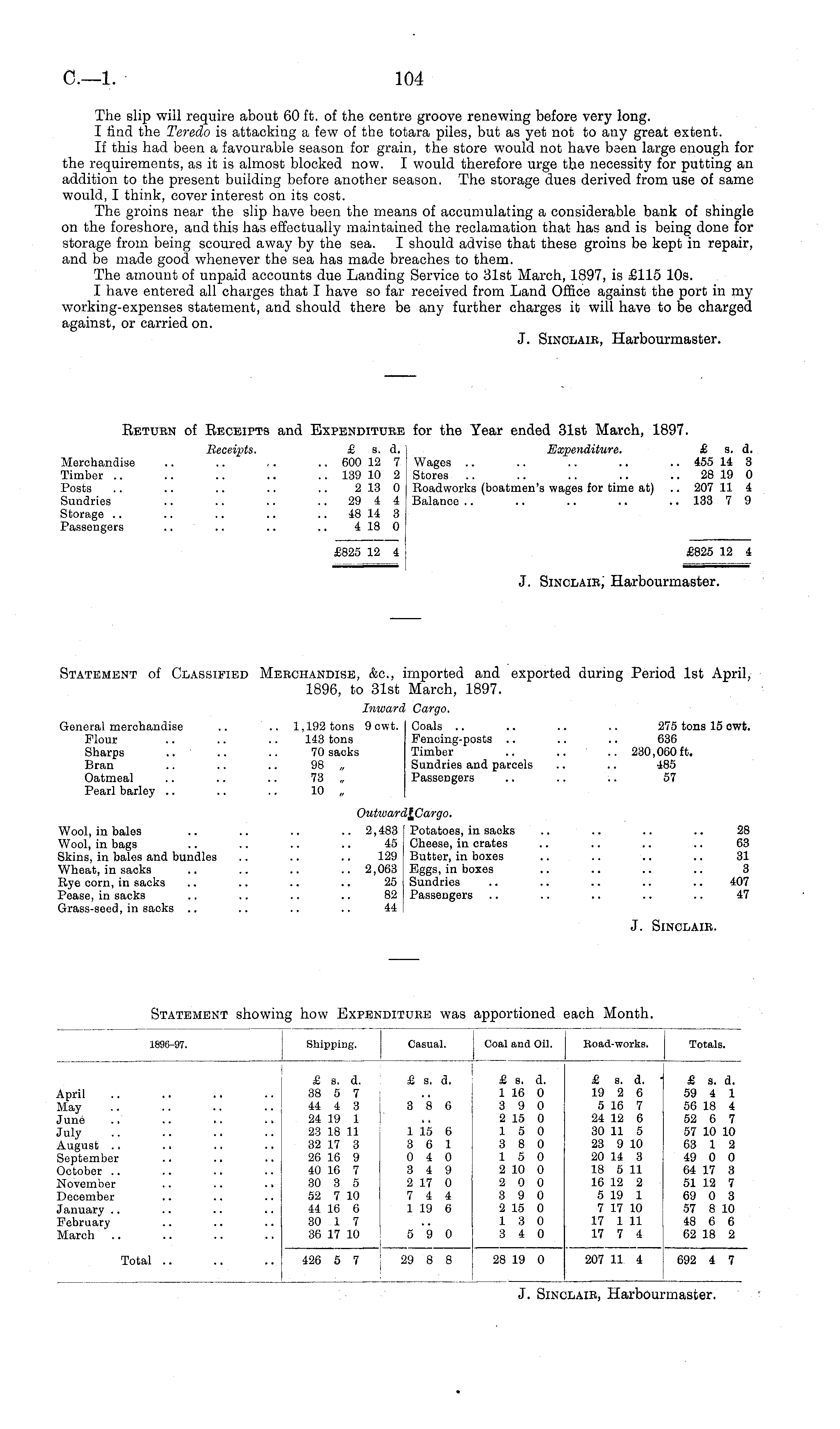 \ . Return of Receipts and Expenditure for the Year ended 31st March, 1897. Receipts. £ a. d. Expenditure. £ a. d. Merchandise .. .. ~ .. 600 12 7 Wages .. .. .. .. .. 455 14 3 Timber .. .. .. .. .. 139 10 2 Stores .. .. .. .. 28 19 0 Posts .. .. .. .. .. 213 0 Roadworks (boatmen's wages for time at) .. 207 11 4 Sundries .. .. .. 29 4 4 Balance .. .. .. .. .. 133 7 9 Storage .. .. .. .. 48 14 3 Passengers .. .. .. .. 418 0 £825 12 4 £825 12 4 J. Sinclair; Harbourmaster.