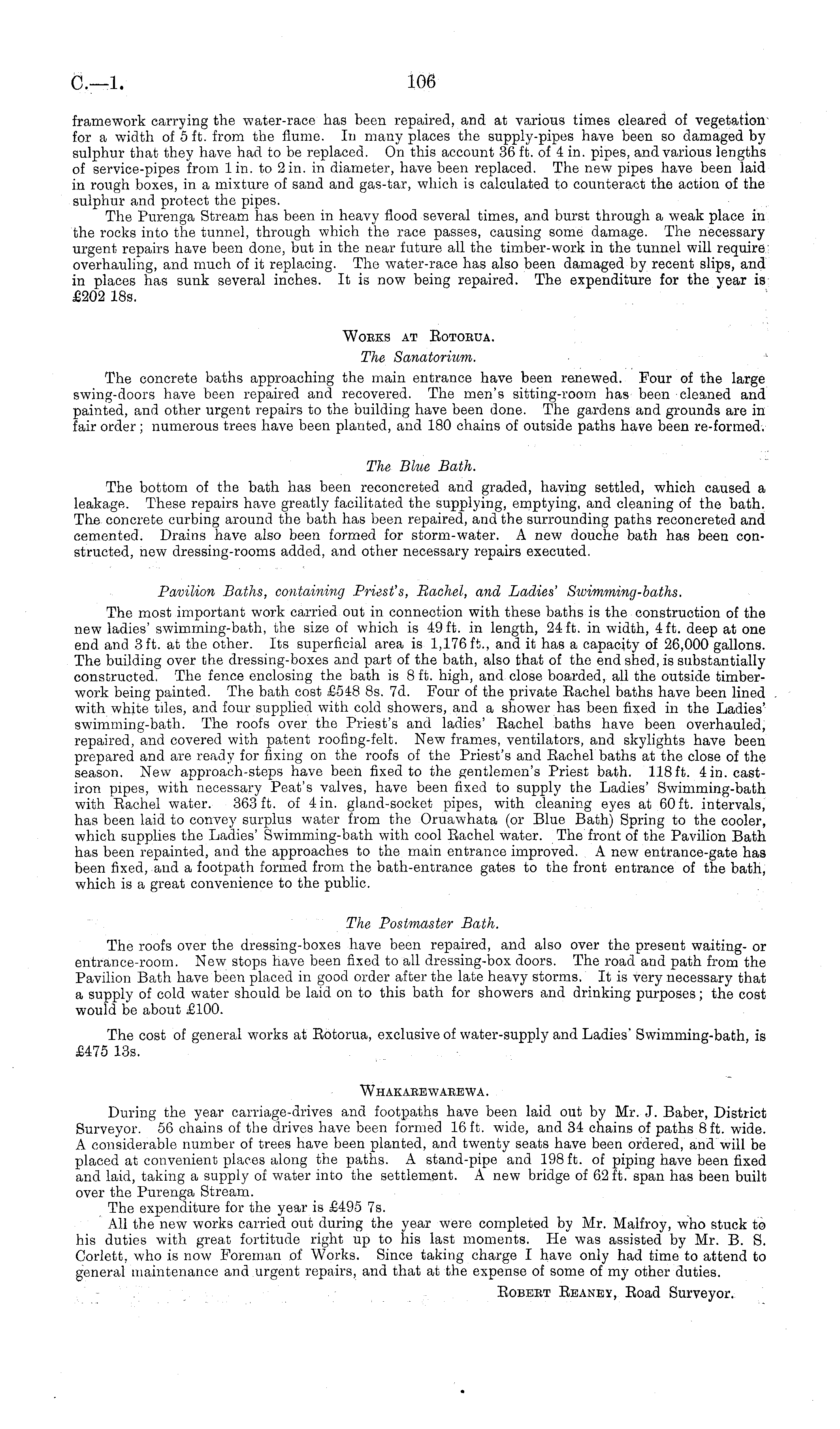 framework carrying the water-race has been repaired, and at various times cleared of vegetation for a width of 5 ft. from the flume. In many places the supply-pipes have been so damaged by sulphur that they have had to be replaced. On this account 36 ft. of 4 in. pipes, and various lengths of service-pipes from lin. to 2in. in diameter, have been replaced. The new pipes have been laid in rough boxes, in a mixture of sand and gas-tar, which is calculated to counteract the action of the sulphur and protect the pipes. The Purenga Stream has been in heavy flood several times, and burst through a weak place in the rocks into the tunnel, through which the race passes, causing some damage. The necessary urgent repairs have been done, but in the near future all the timber-work in the tunnel will require overhauling, and much of it replacing. The water-race has also been damaged by recent slips, and in places has sunk several inches. It is now being repaired. The expenditure for the year is £202 18s. Works at Rotorua. The Sanatorium. The concrete baths approaching the main entrance have been renewed. Four of the large swing-doors have been repaired and recovered. The men's sitting-room has been cleaned and painted, and other urgent repairs to the building have been done. The gardens and grounds are in fair order; numerous trees have been planted, and 180 chains of outside paths have been re-formed. The Blue Bath. The bottom of the bath has been reconcreted and graded, having settled, which caused a leakage. These repairs have greatly facilitated the supplying, emptying, and cleaning of the bath. The concrete curbing around the bath has been repaired, and the surrounding paths reconcreted and cemented. Drains have also been formed for storm-water. A new douche bath has been constructed, new dressing-rooms added, and other necessary repairs executed. Pavilion Baths, containing Priest's, Rachel, and Ladies' Swimming-baths. The most important work carried out in connection with these baths is the construction of the new ladies' swimming-bath, the size of which is 49 ft. in length, 24 ft. in width, 4 ft. deep at one end and 3 ft. at the other. Its superficial area is 1,176 ft., and it has a capacity of 26,000 gallons. The building over the dressing-boxes and part of the bath, also that of the end shed, is substantially constructed, The fence enclosing the bath is 8 ft. high, and close boarded, all the outside timberwork being painted. The bath cost £548 Bs. 7d. Four of the private Rachel baths have been lined with white tiles, and four supplied with cold showers, and a shower has been fixed in the Ladies' swimming-bath. The roofs over the Priest's and ladies' Rachel baths have been overhauled, repaired, and covered with patent roofing-felt. New frames, ventilators, and skylights have been prepared and are ready for fixing on the roofs of the Priest's and Rachel baths at the close of the season. New approach-steps have been fixed to the gentlemen's Priest bath. 118 ft. 4in. castiron pipes, with necessary Peat's valves, have been fixed to supply the Ladies' Swimming-bath with Rachel water. 363 ft. of 4 in. gland-socket pipes, with cleaning eyes at 60 ft. intervals, has been laid to convey surplus water from the Oruawhata (or Blue Bath) Spring to the cooler, which supplies the Ladies' Swimming-bath with cool Rachel water. The front of the Pavilion Bath has been repainted, and the approaches to the main entrance improved. A new entrance-gate has been fixed, and a footpath formed from the bath-entrance gates to the front entrance of the bath, which is a great convenience to the public. The Postmaster Bath. The roofs over the dressing-boxes have been repaired, and also over the present waiting- or entrance-room. New stops have been fixed to all dressing-box doors. The road and path from the Pavilion Bath have been placed in good order after the late heavy storms. It is very necessary that a supply of cold water should be laid on to this bath for showers and drinking purposes; the cost would be about £100. The cost of general works at Rotorua, exclusive of water-supply and Ladies' Swimming-bath, is £475 13s. Whakarewarewa. During the year carriage-drives and footpaths have been laid out by Mr. J. Baber, District Surveyor. 56 chains of the drives have been formed 16 ft. wide, and 34 chains of paths 8 ft. wide. A considerable number of trees have been planted, and twenty seats have been ordered, and will be placed at convenient places along the paths. A stand-pipe and 198 ft. of piping have been fixed and laid, taking a supply of water into the settlement. A new bridge of 62 ft. span has been built over the Purenga Stream. The expenditure for the year is £495 7s. All the new works carried out during the year were completed by Mr. Malfroy, who stuck to his duties with great fortitude right up to his last moments. He was assisted by Mr. B. S. Corlett, who is now Foreman of Works. Since taking charge I have only had time to attend to general maintenance and urgent repairs, and that at the expense of some of my other duties. Robert Reaney, Road Surveyor.