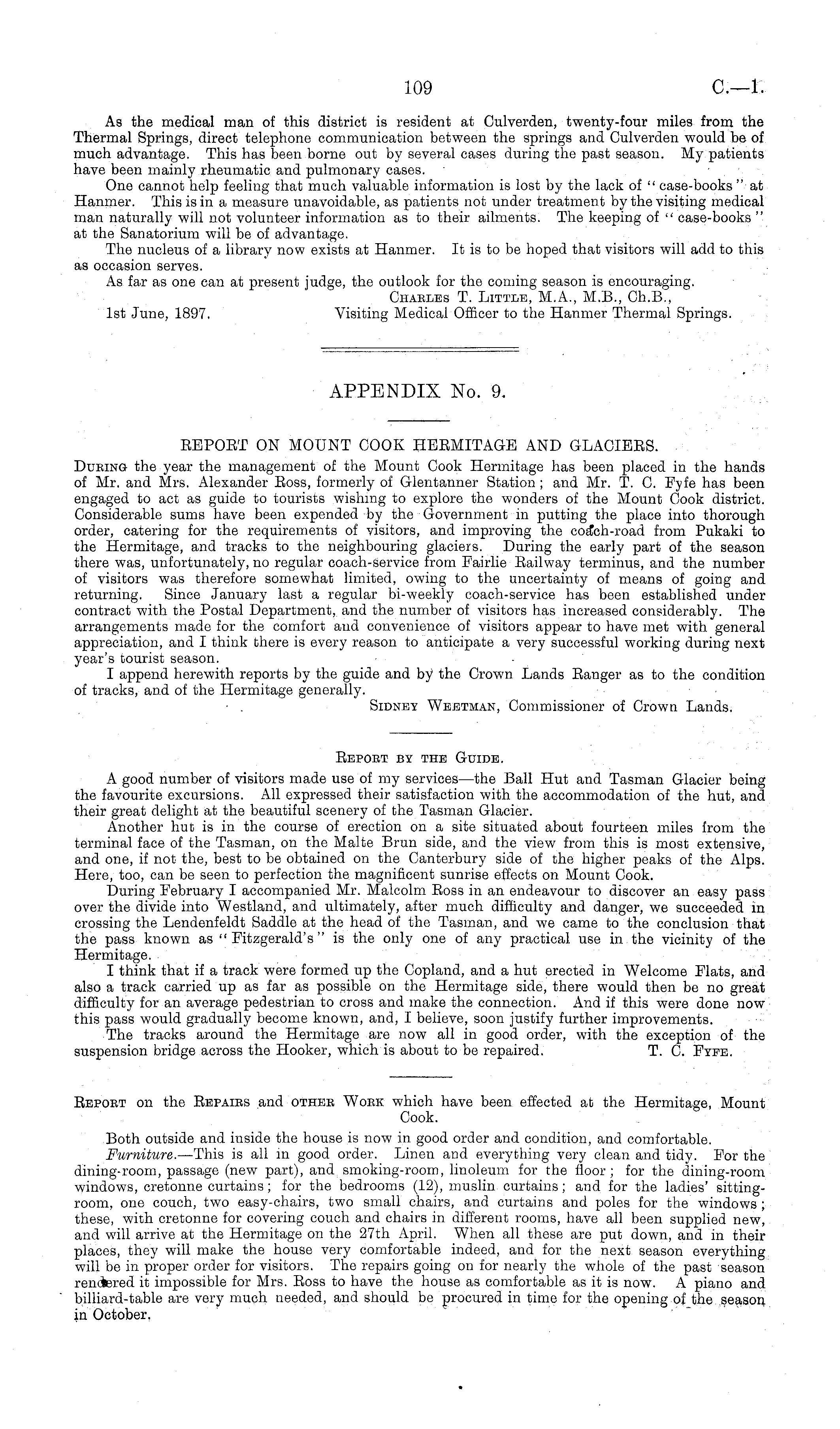 Report by the Guide. A good number of visitors made use of my services—the Ball Hut and Tasman Glacier being the favourite excursions. All expressed their satisfaction with the accommodation of the hut, and their great delight at the beautiful scenery of the Tasman Glacier. Another hut is in the course of erection on a site situated about fourteen miles from the terminal face of the Tasman, on the Malte Brun side, and the view from this is most extensive, and one, if not the, best to be obtained on the Canterbury side of the higher peaks of the Alps. Here, too, can be seen to perfection the magnificent sunrise effects on Mount Cook. During February I accompanied Mr. Malcolm Ross in an endeavour to discover an easy pass over the divide into Westland, and ultimately, after much difficulty and danger, we succeeded in crossing the Lendenfeldt Saddle at the head of the Tasman, and we came to the conclusion that the pass known as "Fitzgerald's" is the only one of any practical use in the vicinity of the Hermitage. I think that if a track were formed up the Copland, and a hut erected in Welcome Flats, and also a track carried up as far as possible on the Hermitage side, there would then be no great difficulty for an average pedestrian to cross and make the connection. And if this were done now this pass would gradually become known, and, I believe, soon justify further improvements. The tracks around the Hermitage are now all in good order, with the exception of the suspension bridge across the Hooker, which is about to be repaired. T. C. Fyfe.