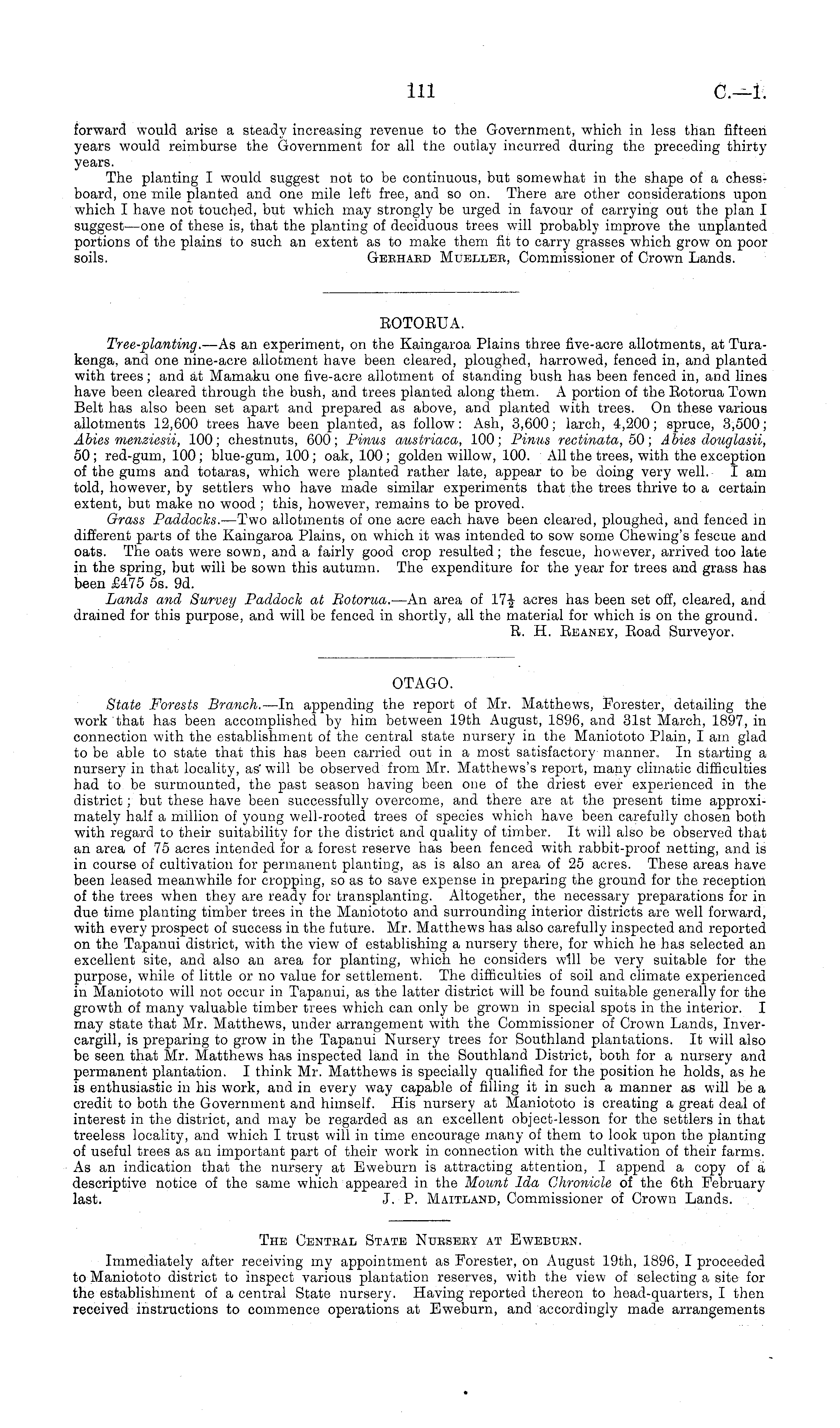 OTAGO. State Forests Branch. —ln appending the report of Mr. Matthews, Forester, detailing the work that has been accomplished by him between 19th August, 1896, and 31st March, 1897, in connection with the establishment of the central state nursery in the Maniototo Plain, I am glad to be able to state that this has been carried out in a most satisfactory manner, In starting a nursery in that locality, as' will be observed from Mr. Matthews's report, many climatic difficulties had to be surmounted, the past season having been one of the driest ever experienced in the district; but these have been successfully overcome, and there are at the present time approximately half a million of young well-rooted trees of species which have been carefully chosen both with regard to their suitability for the district and quality of timber. It will also be observed that an area of 75 acres intended for a forest reserve has been fenced with rabbit-proof netting, and is in course of cultivation for permanent planting, as is also an area of 25 acres. These areas have been leased meanwhile for cropping, so as to save expense in preparing the ground for the reception of the trees when they are ready for transplanting. Altogether, the necessary preparations for in due time planting timber trees in the Maniototo and surrounding interior districts are well forward, with every prospect of success in the future. Mr. Matthews has also carefully inspected and reported on the Tapanui district, with the view of establishing a nursery there, for which he has selected an excellent site, and also an area for planting, which he considers will be very suitable for the purpose, while of little or no value for settlement. The difficulties of soil and climate experienced in Maniototo will not occur in Tapanui, as the latter district will be found suitable generally for the growth of many valuable timber trees which can only be grown in special spots in the interior. I may state that Mr. Matthews, under arrangement with the Commissioner of Crown Lands, Invercargill, is preparing to grow in the Tapanui Nursery trees for Southland plantations. It will also be seen that Mr. Matthews has inspected land in the Southland District, both for a nursery and permanent plantation. I think Mr. Matthews is specially qualified for the position he holds, as he is enthusiastic in his work, and in every way capable of filling it in such a manner as will be a credit to both the Government and himself. His nursery at Maniototo is creating a great deal of interest in the district, and may be regarded as an excellent object-lesson for the settlers in that treeless locality, and which I trust will in time encourage many of them to look upon the planting of useful trees as an important part of their work in connection with the cultivation of their farms. As an indication that the nursery at Eweburn is attracting attention, I append a copy of a descriptive notice of the same which appeared in the Mount Ida Chronicle of the 6th February last. J. P. Maitland, Commissioner of Crown Lands.