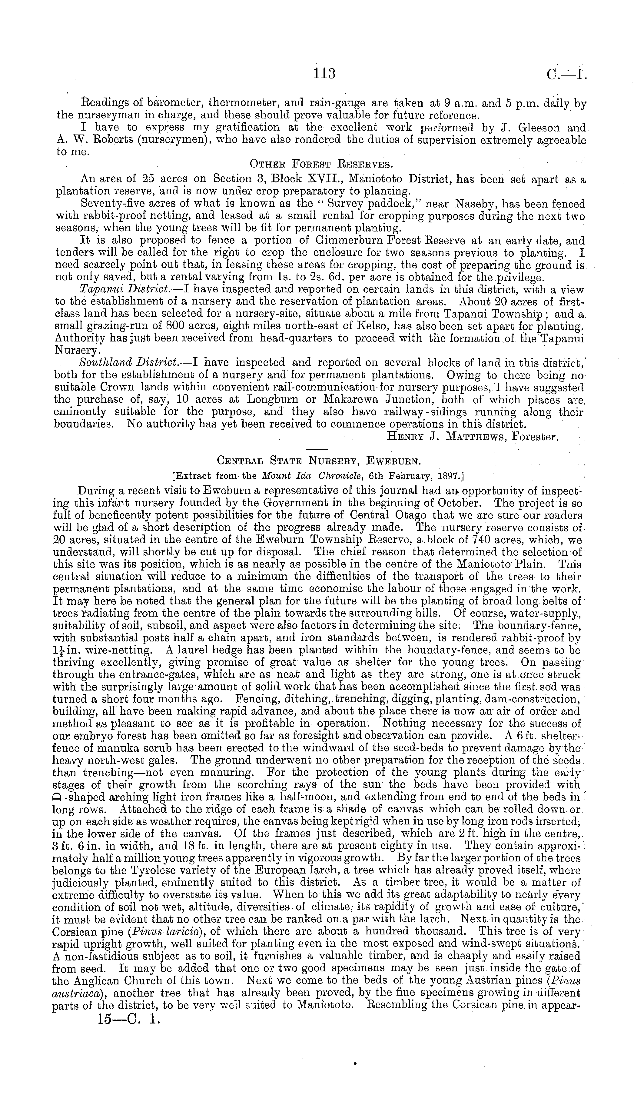 Central State Nursery, Eweburn. [Extract from the Mount [da Chronicle, 6th February, 1897.] During a recent visit to Eweburn a representative of this journal had an opportunity of inspecting this infant nursery founded by the Government in the beginning of October. The project is so full of beneficently potent possibilities for the future of Central Otago that we are sure our readers will be glad of a short description of the progress already made. The nursery reserve consists of 20 acres, situated in the centre of the Eweburn Township Reserve, a block of 740 acres, which, we understand, will shortly be cut up for disposal. The chief reason that determined the selection of this site was its position, which is as nearly as possible in the centre of the Maniototo Plain. This central situation will reduce to a minimum the difficulties of the transport of the trees to their permanent plantations, and at the same time economise the labour of those engaged in the work. It may here be noted that the general plan for the future will be the planting of broad long belts of trees radiating from the centre of the plain towards the surrounding hills. Of course, water-supply, suitability of soil, subsoil, and aspect were also factors in determining the site. The boundary-fence, with substantial posts half a chain apart, and iron standards between, is rendered rabbit-proof by 1-J-in. wire-netting. A laurel hedge has been planted within the boundary-fence, and seems to be thriving excellently, giving promise of great value as shelter for the young trees. On passing through the entrance-gates, which are as neat and light as they are strong, one is at once struck with the surprisingly large amount of solid work that has been accomplished since the first sod was turned a short four months ago. Fencing, ditching, trenching, digging, planting, dam-construction, building, all have been making rapid advance, and about the place there is now an air of order and method as pleasant to see as it is profitable in operation. Nothing necessary for the success of our embryo forest has been omitted so far as foresight and observation can provide. A 6 ft. shelterfence of manuka scrub has been erected to the windward of the seed-beds to prevent damage by the heavy north-west gales. The ground underwent no other preparation for the reception of the seeds than trenching —not even manuring. For the protection of the young plants during the early stages of their growth from the scorching rays of the sun the beds have been provided with Q -shaped arching light iron frames like a half-moon, and extending from end to end of the beds in long rows. Attached to the ridge of each frame is a shade of canvas which can be rolled down or up on each side as weather requires, the canvas being kept rigid when in use by long iron rods inserted, in the lower side of the canvas. Of the frames just described, which are 2 ft. high in the centre, 3 ft. 6 in. in width, and 18 ft. in length, there are at present eighty in use. They contain approxi- i mately half a million young trees apparently in vigorous growth. By far the larger portion of the trees belongs to the Tyrolese variety of the European larch, a tree which has already proved itself, where judiciously planted, eminently suited to this district. As a timber tree, it would be a matter of extreme difficulty to overstate its value. When to this we add its great adaptability to nearly every condition of soil not wet, altitude, diversities of climate, its rapidity of growth and ease of culture, it must be evident that no other tree can be ranked on a par with the larch. Next in quantity is the Corsican pine (Pinus laricio), of which there are about a hundred thousand. This tree is of very rapid upright growth, well suited for planting even in the most exposed and wind-swept situations. A non-fastidious subject as to soil, it furnishes a valuable timber, and is cheaply and easily raised from seed. It may be added that one or two good specimens may be seen just inside the gate of the Anglican Church of this town. Next we come to the beds of the young Austrian pines (Pinus austriaca), another tree that has already been proved, by the fine specimens growing in different parts of the district, to be very well suited to Maniototo. Resembling the Corsican pine in appear15—C. 1.