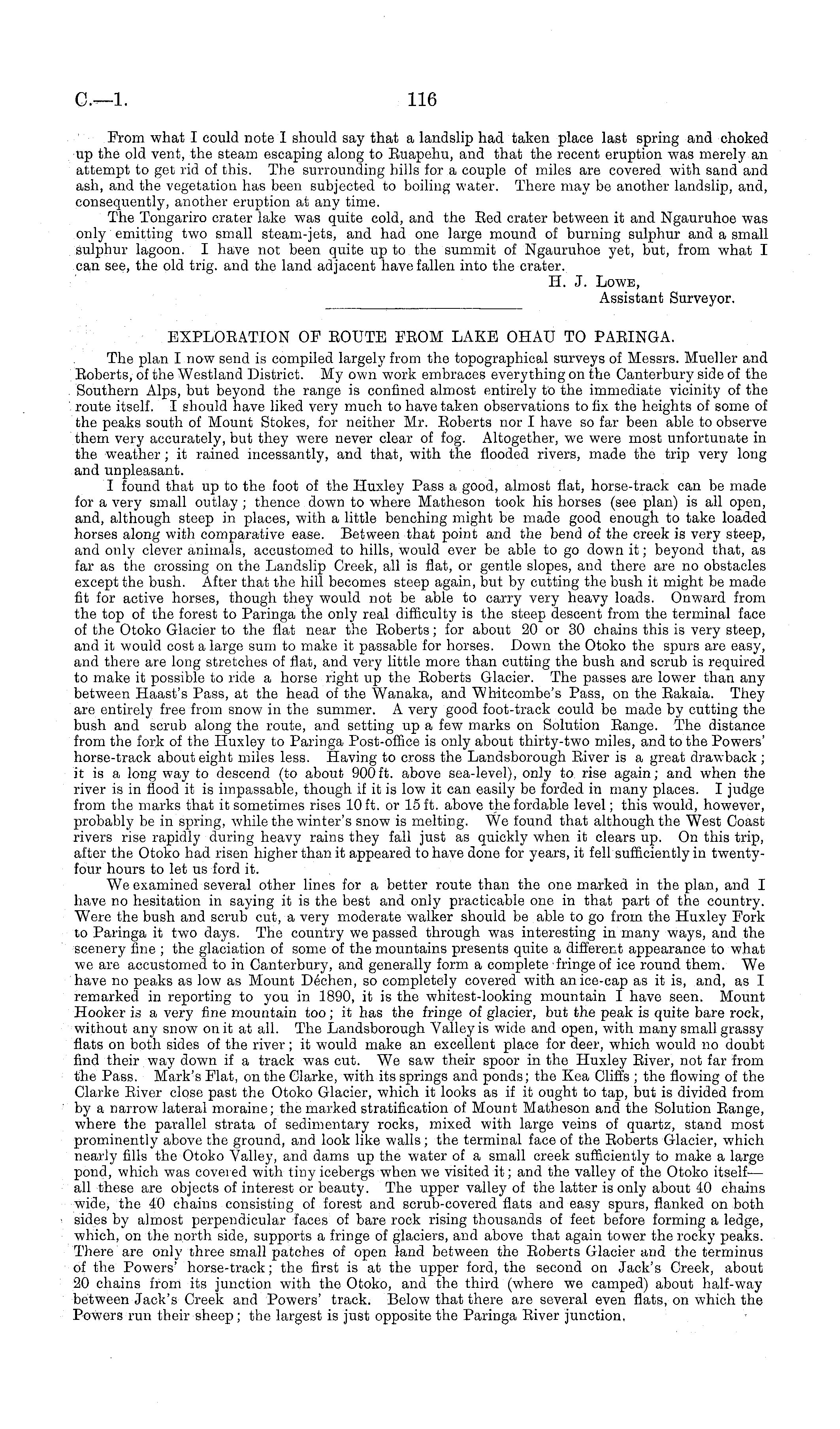 EXPLORATION OF ROUTE FROM LAKE OHAU TO PARINGA. The plan I now send is compiled largely from the topographical surveys of Messrs. Mueller and Roberts, of the Westland District. My own work embraces everything on the Canterbury side of the Southern Alps, but beyond the range is confined almost entirely to the immediate vicinity of the route itself. I should have liked very much to have taken observations to fix the heights of some of the peaks south of Mount Stokes, for neither Mr. Roberts nor I have so far been able to observe them very accurately, but they were never clear of fog. Altogether, we were most unfortunate in the weather ; it rained incessantly, and that, with the flooded rivers, made the trip very long and unpleasant. I found that up to the foot of the Huxley Pass a good, almost flat, horse-track can be made for a very small outlay ; thence down to where Matheson took his horses (see plan) is all open, and, although steep in places, with a little benching might be made good enough to take loaded horses along with comparative ease. Between that point and the bend of the creek is very steep, and only clever animals, accustomed to hills, would ever be able to go down it; beyond that, as far as the crossing on the Landslip Creek, all is flat, or gentle slopes, and there are no obstacles except the bush. After that the hill becomes steep again, but by cutting the bush it might be made fit for active horses, though they would not be able to carry very heavy loads. Onward from the top of the forest to Paringa the only real difficulty is the steep descent from the terminal face of the Otoko Glacier to the flat near the Roberts; for about 20 or 30 chains this is very steep, and it would cost a large sum to make it passable for horses. Down the Otoko the spurs are easy, and there are long stretches of flat, and very little more than cutting the bush and scrub is required to make it possible to ride a horse right up the Roberts Glacier. The passes are lower than any between Haast's Pass, at the head of the Wanaka, and Whitcombe's Pass, on the Rakaia. They are entirely free from snow in the summer. A very good foot-track could be made by cutting the bush and scrub along the route, and setting up a few marks on Solution Range. The distance from the fork of the Huxley to Paringa Post-office is only about thirty-two miles, and to the Powers' horse-track about eight miles less. Having to cross the Landsborough River is a great drawback ; it is a long way to descend (to about 900 ft. above sea-level), only to rise again; and when the river is in flood it is impassable, though if it is low it can easily be forded in many places. I judge from the marks that it sometimes rises 10 ft. or 15 ft. above the fordable level; this would, however, probably be in spring, while the winter's snow is melting. We found that although the West Coast rivers rise rapidly during heavy rains they fall just as quickly when it clears up. On this trip, after the Otoko had risen higher than it appeared to have done for years, it fell sufficiently in twentyfour hours to let us ford it. We examined several other lines for a better route than the one marked in the plan, and I have no hesitation in saying it is the best and only practicable one in that part of the country. Were the bush and scrub cut, a very moderate walker should be able to go from the Huxley Fork to Paringa it two days. The country we passed through was interesting in many ways, and the scenery fine ; the glaciation of some of the mountains presents quite a different appearance to what we are accustomed to in Canterbury, and generally form a complete fringe of ice round them. We have no peaks as low as Mount Dechen, so completely covered with an ice-cap as it is, and, as I remarked in reporting to you in 1890, it is the whitest-looking mountain I have seen. Mount Hooker is a very fine mountain too; it has the fringe of glacier, but the peak is quite bare rock, without any snow on it at all. The Landsborough Valley is wide and open, with many small grassy flats on both sides of the river; it would make an excellent place for deer, which would no doubt find their way down if a track was cut. We saw their spoor in the Huxley River, not far from the Pass. Mark's Flat, on the Clarke, with its springs and ponds; the Kea Cliffs ; the flowing of the Clarke River close past the Otoko Glacier, which it looks as if it ought to tap, but is divided from by a narrow lateral moraine; the marked stratification of Mount Matheson and the Solution Range, where the parallel strata of sedimentary rocks, mixed with large veins of quartz, stand most prominently above the ground, and look like walls; the terminal face of the Roberts Glacier, which nearly fills the Otoko Valley, and dams up the water of a small creek sufficiently to make a large pond, which was covered with tiny icebergs when we visited it; and the valley of the Otoko itself— all these are objects of interest or beauty. The upper valley of the latter is only about 40 chains wide, the 40 chains consisting of forest and scrub-covered flats and easy spurs, flanked on both sides by almost perpendicular faces of bare rock rising thousands of feet before forming a ledge, which, on the north side, supports a fringe of glaciers, and above that again tower the rocky peaks. There are only three small patches of open land between the Roberts Glacier and the terminus of the Powers' horse-track; the first is at the upper ford, the second on Jack's Creek, about 20 chains from its junction with the Otoko, and the third (where we camped) about half-way between Jack's Creek and Powers' track. Below that there are several even flats, on which the Powers run their sheep; the largest is just opposite the Paringa River junction,