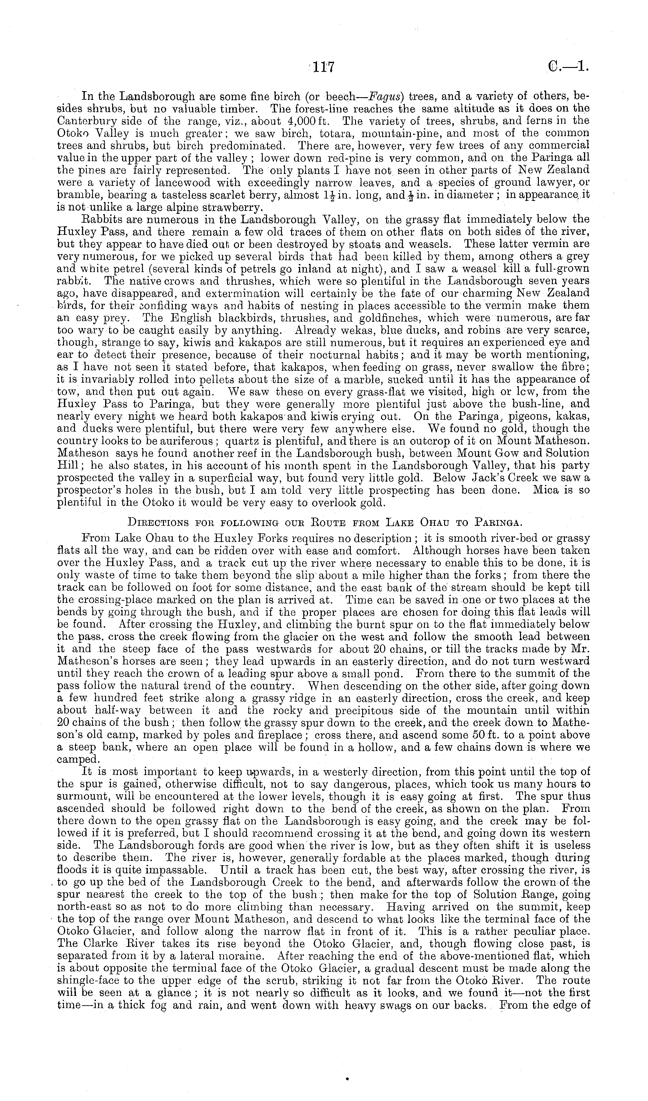 In the Landsborough are some fine birch (or beech— Fagus) trees, and a variety of others, besides shrubs, but no valuable timber. The forest-line reaches the same altitude as it does on the Canterbury side of the range, viz., about 4,000 ft. The variety of trees, shrubs, and ferns in the Otoko Valley is much greater; we saw birch, totara, mountain-pine, and most of the common trees and shrubs, but birch predominated. There are, however, very few trees of any commercial value in the upper part of the valley ; lower down red-pine is very common, and on the Paringa all the pines are fairly represented. The only plants I have not seen in other parts of New Zealand were a variety of lancewood with exceedingly narrow leaves, and a species of ground lawyer, or bramble, bearing a tasteless scarlet berry, almost If in. long, and-J in. in diameter ;in appearance, it is not unlike a large alpine strawberry. Rabbits are numerous in the Landsborough Valley, on the grassy flat immediately below the Huxley Pass, and there remain a few old traces of them on other flats on both sides of the river, but they appear to have died out or been destroyed by stoats and weasels. These latter vermin are very numerous, for we picked up several birds that had been killed by them, among others a grey and white petrel (several kinds of petrels go inland at night), and I saw a weasel kill a full-grown rabbit. The native crows and thrushes, which were so plentiful in the Landsborough seven years ago, have disappeared, and extermination will certainly be the fate of our charming New Zealand birds, for their confiding ways and habits of nesting in places accessible to the vermin make them an easy prey. The English blackbirds, thrushes, and goldfinches, which were numerous, are far too wary to be caught easily by anything. Already wekas, blue ducks, and robins are very scarce, though, strange to say, kiwis and kakapos are still numerous, but it requires an experienced eye and ear to detect their presence, because of their nocturnal habits; and it may be worth mentioning, as I have not seen it stated before, that kakapos, when feeding on grass, never swallow the fibre; it is invariably rolled into pellets about the size of a marble, sucked until it has the appearance of tow, and then put out again. We saw these on every grass-flat we visited, high or lew, from the Huxley Pass to Paringa, but they were generally more plentiful just above the bush-line, and nearly every night we heard both kakapos and kiwis crying out. On the Paringa, pigeons, kakas, and ducks were plentiful, but there were very few anywhere else. We found no gold, though the country looks to be auriferous ; quartz is plentiful, and there is an outcrop of it on Mount Matheson. Matheson says he found another reef in the Landsborough bush, between Mount Gow and Solution Hill; he also states, in his account of his month spent in the Landsborough Valley, that his party prospected the valley in a superficial way, but found very little gold. Below Jack's Creek we saw a prospector's holes in the bush, but lam told very little prospecting has been done. Mica is so plentiful in the Otoko it would be very easy to overlook gold. Directions for following our Route from Lake Ohau to Paringa. From Lake Ohau to the Huxley Forks requires no description ; it is smooth river-bed or grassy flats all the way, and can be ridden over with ease and comfort. Although horses have been taken over the Huxley Pass, and a track cut up the river where necessary to enable this to be done, it is only waste of time to take them beyond the slip about a mile higher than the forks; from there the track can be followed on foot for some distance, and the east bank of the stream should be kept till the crossing-place marked on the plan is arrived at. Time can be saved in one or two places at the bends by going through the bush, and if the proper places are chosen for doing this flat leads will be found. After crossing the Huxley, and climbing the burnt spur on to the flat immediately below the pass, cross the creek flowing from the glacier on the west and follow the smooth lead between it and the steep face of the pass westwards for about 20 chains, or till the tracks made by Mr. Matheson's horses are seen; they lead upwards in an easterly direction, and do not turn westward until they reach the crown of a leading spur above a small pond. From there to the summit of the pass follow the natural trend of the country. When descending on the other side, after going down a few hundred feet strike along a grassy ridge in an easterly direction, cross the creek, and keep about half-way between it and the rocky and precipitous side of the mountain until within 20 chains of the bush ; then follow the grassy spur down to the creek, and the creek down to Matheson's old camp, marked by poles and fireplace; cross there, and ascend some 50 ft. to a point above a steep bank, where an open place will be found in a hollow, and a few chains down is where we camped. It is most important to keep upwards, in a westerly direction, from this point until the top of the spur is gained, otherwise difficult, not to say dangerous, places, which took us many hours to surmount, will be encountered at the lower levels, though it is easy going at first. The spur thus ascended should be followed right down to the bend of the creek, as shown on the plan. From there down to the open grassy flat on the Landsborough is easy going, and the creek may be followed if it is preferred, but I should recommend crossing it at the bend, and going down its western side. The Landsborough fords are good when the river is low, but as they often shift it is useless to describe them. The river is, however, generally fordable at the places marked, though during floods it is quite impassable. Until a track has been cut, the best way, after crossing the river, is to go up the bed of the Landsborough Creek to the bend, and afterwards follow the crown o