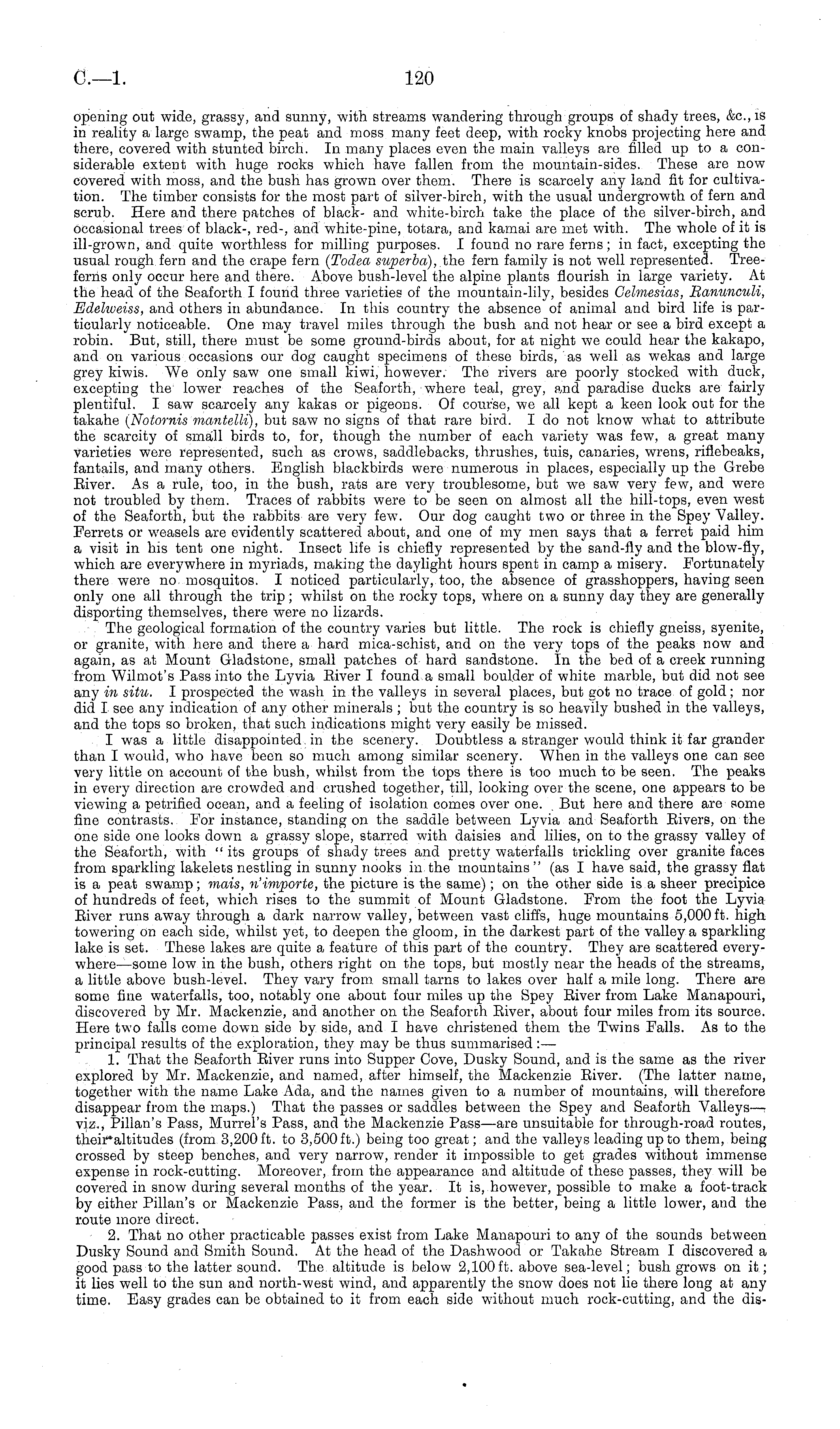opening out wide, grassy, and sunny, with streams wandering through groups of shady trees, &c.,is in reality a large swamp, the peat and moss many feet deep, with rocky knobs projecting here and there, covered with stunted birch. In many places even the main valleys are filled up to a considerable extent with huge rocks which have fallen from the mountain-sides. These are now covered with moss, and the bush has grown over them. There is scarcely any land fit for cultivation. The timber consists for the most part of silver-birch, with the usual undergrowth of fern and scrub. Here and there patches of black- and white-birch take the place of the silver-birch, and occasional trees of black-, red-, and white-pine, totara, and kamai are met with. The whole of it is ill-grown, and quite worthless for milling purposes. I found no rare ferns; in fact, excepting the usual rough fern and the crape fern (Todea superba), the fern family is not well represented. Treeferns only occur here and there. Above bush-level the alpine plants flourish in large variety. At the head of the Seaforth I found three varieties of the mountain-lily, besides Celmesias, Ranunculi, Edelweiss, and others in abundance. In this country the absence of animal and bird life is particularly noticeable. One may travel miles through the bush and not hear or see a bird except a robin. But, still, there must be some ground-birds about, for at night we could hear the kakapo, and on various occasions our dog caught specimens of these birds, as well as wekas and large grey kiwis. We only saw one small kiwi, however. The rivers are poorly stocked with duck, excepting the lower reaches of the Seaforth, where teal, grey, and paradise ducks are fairly plentiful. I saw scarcely any kakas or pigeons. Of course, we all kept a keen look out for the takahe (Notornis mantelli), but saw no signs of that rare bird. Ido not know what to attribute the scarcity of small birds to, for, though the number of each variety was few, a great many varieties were represented, such as crows, saddlebacks, thrushes, tuis, canaries, wrens, rifiebeaks, fantails, and many others. English blackbirds were numerous in places, especially up the Grebe River. As a rule, too, in the bush, rats are very troublesome, but we saw very few, and were not troubled by them. Traces of rabbits were to be seen on almost all the hill-tops, even west of the Seaforth, but the rabbits are very few. Our dog caught two or three in the Spey Valley. Ferrets or weasels are evidently scattered about, and one of my men says that a ferret paid him a visit in his tent one night. Insect life is chiefly represented by the sand-fly and the blow-fly, which are everywhere in myriads, making the daylight hours spent in camp a misery. Fortunately there were no mosquitos. I noticed particularly, too, the absence of grasshoppers, having seen only one all through the trip; whilst on the rocky tops, where on a sunny day they are generally disporting themselves, there were no lizards. The geological formation of the country varies but little. The rock is chiefly gneiss, syenite, or granite, with here and there a hard mica-schist, and on the very tops of the peaks now and again, as at Mount Gladstone, small patches of hard sandstone. In the bed of a creek running from Wilmot's Pass into the Lyvia River I found a small boulder of white marble, but did not see any in situ. I prospected the wash in the valleys in several places, but got no trace of gold; nor did I see any indication of any other minerals ; but the country is so heavily bushed in the valleys, and the tops so broken, that such indications might very easily be missed. I was a little disappointed in the scenery. Doubtless a stranger would think it far grander than I would, who have been so much among similar scenery. When in the valleys one can see very little on account of the bush, whilst from the tops there is too much to be seen. The peaks in every direction are crowded and crushed together, till, looking over the scene, one appears to be viewing a petrified ocean, and a feeling of isolation comes over one. . But here and there are some fine contrasts. For instance, standing on the saddle between Lyvia and Seaforth Rivers, on the one side one looks down a grassy slope, starred with daisies and lilies, on to the grassy valley of the Seaforth, with " its groups of shady trees and pretty waterfalls trickling over granite faces from sparkling lakelets nestling in sunny nooks in the mountains " (as I have said, the grassy flat is a peat swamp; mais, nimporte, the picture is the same); on the other side is a sheer precipice of hundreds of feet, which rises to the summit of Mount Gladstone. From the foot the Lyvia River runs away through a dark narrow valley, between vast cliffs, huge mountains 5,000 ft. high towering on each side, whilst yet, to deepen the gloom, in the darkest part of the valley a sparkling lake is set. These lakes are quite a feature of this part of the country. They are scattered everywhere—some low in the bush, others right on the tops, but mostly near the heads of the streams, a little above bush-level. They vary from, small tarns to lakes over half a mile long. There are some fine waterfalls, too, notably one about four miles up the Spey River from Lake Manapouri, discovered by Mr. Mackenzie, and another on the Seaforth River, about four miles from its source. Here two falls come down side by side, and I have christened them the Twins Falls. As to the principal results of the exploration, they may be thus summarised : — 1. That the Seaforth River runs into Supper Cove, Dusky Sound, and is the same as the river explored by Mr. Mackenzie, and named, after himself, the Mackenzie River. (The latter name, together with the name Lake Ada, and the names given to a number of mountains, will therefore disappear from the maps.) That the passes or saddles between the Spey and Seaforth Valleys— viz., Pillan's Pass, Murrel's Pass, an