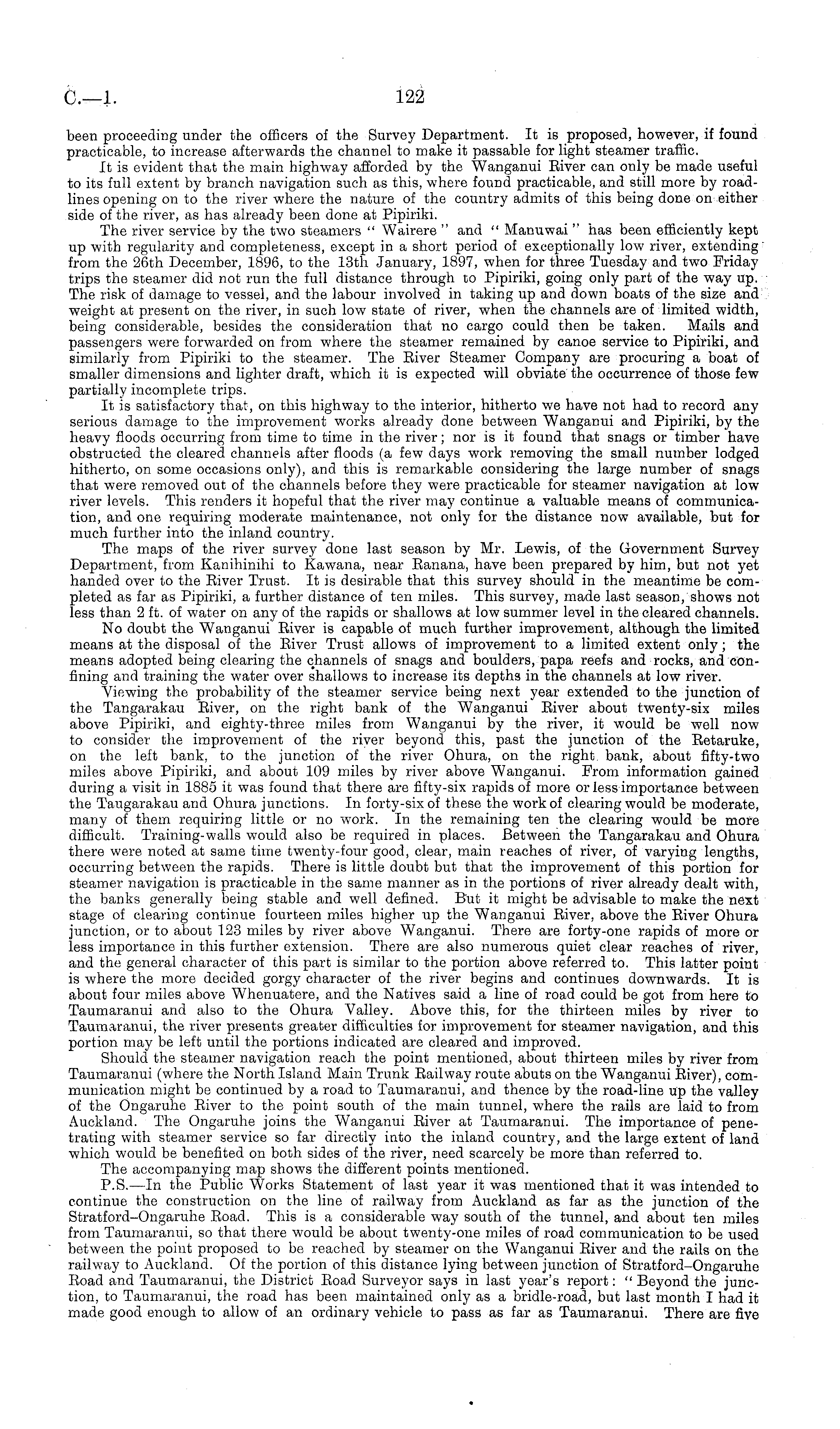 been proceeding under the officers of the Survey Department. It is proposed, however, if found practicable, to increase afterwards the channel to make it passable for light steamer traffic. It is evident that the main highway afforded by the Wanganui River can only be made useful to its full extent by branch navigation such as this, where found practicable, and still more by roadlines opening on to the river where the nature of the country admits of this being done on either side of the river, as has already been done at Pipiriki. The river service by the two steamers " Wairere " and " Manuwai " has been efficiently kept up with regularity and completeness, except in a short period of exceptionally low river, extending from the 26th December, 1896, to the 13th January, 1897, when for three Tuesday and two Friday trips the steamer did not run the full distance through to Pipiriki, going only part of the way up. The risk of damage to vessel, and the labour involved in taking up and down boats of the size and weight at present on the river, in such low state of river, when the channels are of limited width, being considerable, besides the consideration that no cargo could then be taken. Mails and passengers were forwarded on from where the steamer remained by canoe service to Pipiriki, and similarly from Pipiriki to the steamer. The River Steamer Company are procuring a boat of smaller dimensions and lighter draft, which it is expected will obviate the occurrence of those few partially incomplete trips. It is satisfactory that, on this highway to the interior, hitherto we have not had to record any serious damage to the improvement works already done between Wanganui and Pipiriki, by the heavy floods occurring from time to time in the river; nor is it found that snags or timber have obstructed the cleared channels after floods (a few days work removing the small number lodged hitherto, on some occasions only), and this is remarkable considering the large number of snags that were removed out of the channels before they were practicable for steamer navigation at low river levels. This renders it hopeful that the river may continue a valuable means of communication, and one requiring moderate maintenance, not only for the distance now available, but for much further into the inland country. The maps of the river survey done last season by Mr. Lewis, of the Government Survey Department, from Kanihinihi to Kawana, near Ranana, have been prepared by him, but not yet handed over to the River Trust. It is desirable that this survey should in the meantime be completed as far as Pipiriki, a further distance of ten miles. This survey, made last season, shows not less than 2 ft. of water on any of the rapids or shallows at low summer level in the cleared channels. No doubt the Wanganui River is capable of much further improvement, although the limited means at the disposal of the River Trust allows of improvement to a limited extent only ; the means adopted being clearing the channels of snags and boulders, papa reefs and rocks, and confining and training the water over shallows to increase its depths in the channels at low river. Viewing the probability of the steamer service being next year extended to the junction of the Tangarakau River, on the right bank of the Wanganui Biver about twenty-six miles above Pipiriki, and eighty-three miles from Wanganui by the river, it would be well now to consider the improvement of the river beyond this, past the junction of the Retaruke, on the left bank, to the junction of the river Ohura, on the right bank, about fifty-two miles above Pipiriki, and about 109 miles by river above Wanganui. From information gained during a visit in 1885 it was found that there are fifty-six rapids of more or less importance between the Taugarakau and Ohura junctions. In forty-six of these the work of clearing would be moderate, many of them requiring little or no work. In the remaining ten the clearing would be more difficult. Training-walls would also be required in places. Between the Tangarakau and Ohura there were noted at same time twenty-four good, clear, main reaches of river, of varying lengths, occurring between the rapids. There is little doubt but that the improvement of this portion for steamer navigation is practicable in the same manner as in the portions of river already dealt with, the banks generally being stable and well defined. But it might be advisable to make the next stage of clearing continue fourteen miles higher up the Wanganui River, above the River Ohura junction, or to about 123 miles by river above Wanganui. There are forty-one rapids of more or less importance in this further extension. There are also numerous quiet clear reaches of river, and the general character of this part is similar to the portion above referred to. This latter point is where the more decided gorgy character of the river begins and continues downwards. It is about four miles above Whenuatere, and the Natives said a line of road could be got from here to Taumaranui and also to the Ohura Valley. Above this, for the thirteen miles by river to Taumaranui, the river presents greater difficulties for improvement for steamer navigation, and this portion may be left until the portions indicated are cleared and improved. Should the steamer navigation reach the point mentioned, about thirteen miles by river from Taumaranui (where the North Island Main Trunk Railway route abuts on the Wanganui River), communication might be continued by a road to Taumaranui, and thence by the road-line up the valley of the Ongaruhe River to the point south of the main tunnel, where the rails are laid to from Auckland. The Ongaruhe joins the Wanganui River at Taumaranui. The importance of penetrating with steamer service so far directly into the inland country, and the large extent of land which would be benefited on both sides of the river, need scarcely be more than referred to. The accompanying map sh
