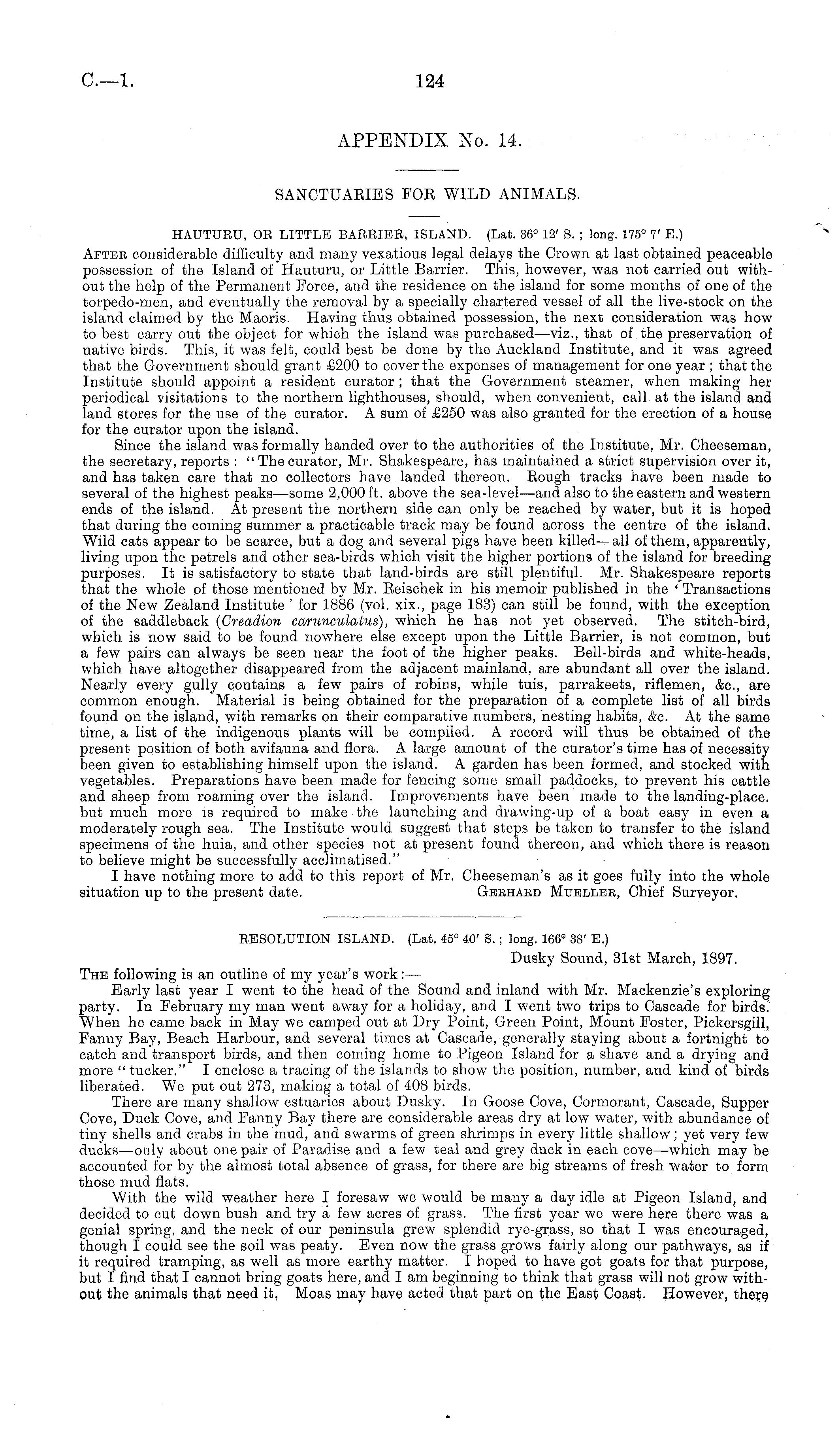 HAUTURU, OR LITTLE BARRIER, ISLAND. (Lat. 36° 12' S. ; long. 175° 7' E.) Aftee considerable difficulty and many vexatious legal delays the Crown at last obtained peaceable possession of the Island of Hauturu, or Little Barrier. This, however, was not carried out without the help of the Permanent Force, and the residence on the island for some months of one of the torpedo-men, and eventually the removal by a specially chartered vessel of all the live-stock on the island claimed by the Maoris. Having thus obtained possession, the next consideration was how to best carry out the object for which the island was purchased —viz., that of the preservation of native birds. This, it was felt, could best be done by the Auckland Institute, and it was agreed that the Government should grant £200 to cover the expenses of management for one year ; that the Institute should appoint a resident curator; that the Government steamer, when making her periodical visitations to the northern lighthouses, should, when convenient, call at the island and land stores for the use of the curator. A sum of £250 was also granted for the erection of a house for the curator upon the island. Since the island was formally handed over to the authorities of the Institute, Mr. Cheeseman, the secretary, reports : " The curator, Mr. Shakespeare, has maintained a strict supervision over it, and has taken care that no collectors have landed thereon. Rough tracks have been made to several of the highest peaks—some 2,000 ft. above the sea-level—and also to the eastern and western ends of the island. At present the northern side can only be reached by water, but it is hoped that during the coming summer a practicable track may be found across the centre of the island. Wild cats appear to be scarce, but a dog and several pigs have been killed—all of them, apparently, living upon the petrels and other sea-birds which visit the higher portions of the island for breeding purposes. It is satisfactory to state that land-birds are still plentiful. Mr. Shakespeare reports that the whole of those mentioned by Mr. Reischek in his memoir published in the ' Transactions of the New Zealand Institute ' for 1886 (vol. xix., page 183) can still be found, with the exception of the saddleback (Creadion carunculatus), which he has not yet observed. The stitch-bird, which is now said to be found nowhere else except upon the Little Barrier, is not common, but a few pairs can always be seen near the foot of the higher peaks. Bell-birds and white-heads, which have altogether disappeared from the adjacent mainland, are abundant all over the island. Nearly every gully contains a few pairs of robins, while tuis, parrakeets, riflemen, &c, are common enough. Material is being obtained for the preparation of a complete list of all birds found on the island, with remarks on their comparative numbers, nesting habits, &c. At the same time, a list of the indigenous plants will be compiled. A record will thus be obtained of the present position of both avifauna and flora. A large amount of the curator's time has of necessity been given to establishing himself upon the island. A garden has been formed, and stocked with vegetables. Preparations have been made for fencing some small paddocks, to prevent his cattle and sheep from roaming over the island. Improvements have been made to the landing-place, but much more is required to make the launching and drawing-up of a boat easy in even a moderately rough sea. The Institute would suggest that steps be taken to transfer to the island specimens of the huia, and other species not at present found thereon, and which there is reason to believe might be successfully acclimatised." I have nothing more to add to this report of Mr. Cheeseman's as it goes fully into the whole situation up to the present date. Geehaed Muellee, Chief Surveyor.