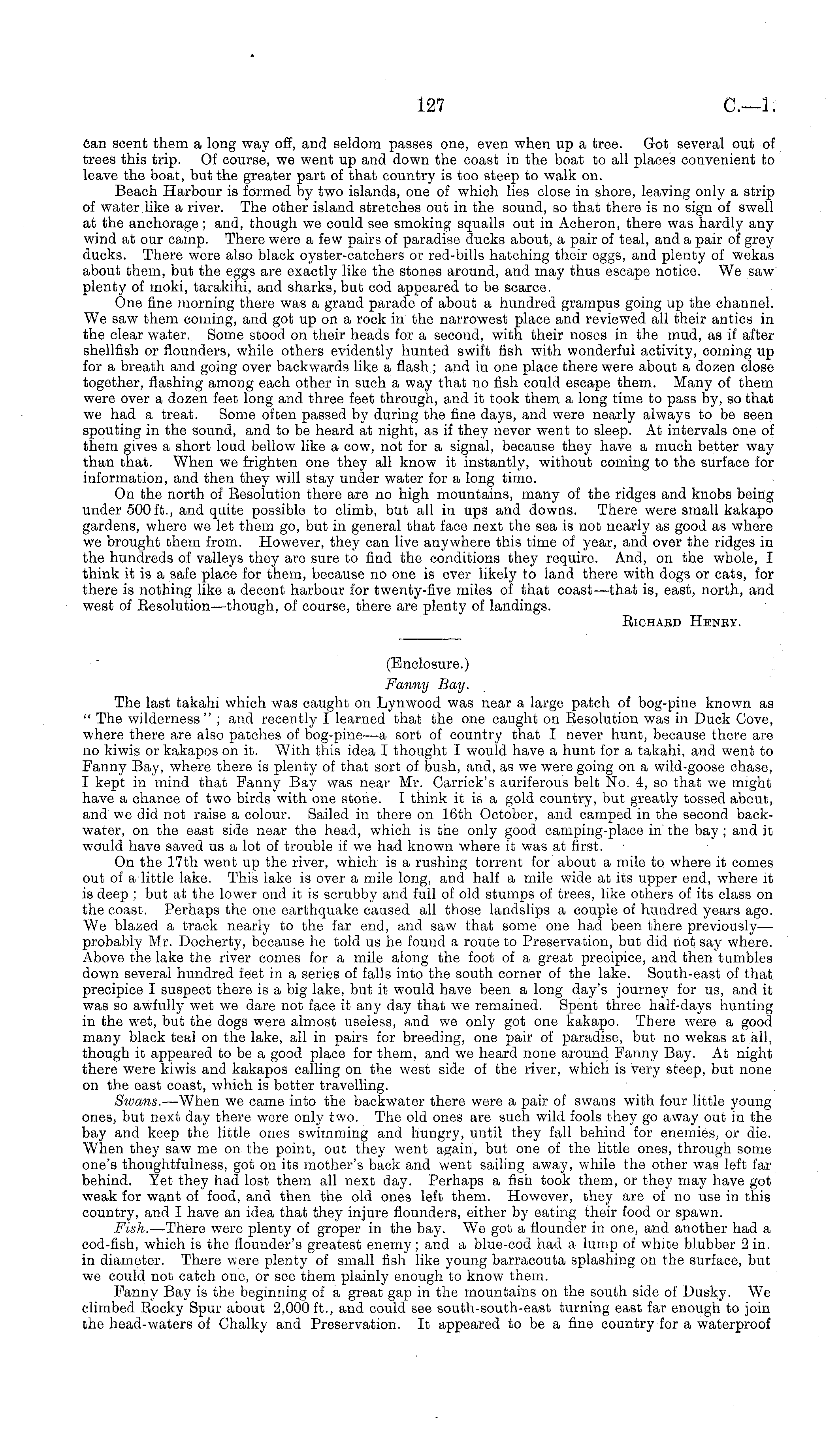 (Enclosure.) Fanny Bay. The last takahi which was caught on Lynwood was near a large patch of bog-pine known as " The wilderness" ; and recently I learned that the one caught on Resolution was in Duck Cove, where there are also patches of bog-pine—a sort of country that I never hunt, because there are no kiwis or kakapos on it. With this idea I thought I would have a hunt for a takahi, and went to Fanny Bay, where there is plenty of that sort of bush, and, as we were going on a wild-goose chase, I kept in mind that Fanny Bay was near Mr. Carrick's auriferous belt No. 4, so that we might have a chance of two birds with one stone. I think it is a gold country, but greatly tossed about, and we did not raise a colour. Sailed in there on 16th October, and camped in the second backwater, on the east side near the head, which is the only good camping-place in'the bay; and it would have saved us a lot of trouble if we had known where it was at first. On the 17th went up the river, which is a rushing torrent for about a mile to where it comes out of a little lake. This lake is over a mile long, and half a mile wide at its upper end, where it is deep ; but at the lower end it is scrubby and full of old stumps of trees, like others of its class on the coast. Perhaps the one earthquake caused all those landslips a couple of hundred years ago. We blazed a track nearly to the far end, and saw that some one had been there previously— probably Mr. Docherty, because he told us he found a route to Preservation, but did not say where. Above the lake the river comes for a mile along the foot of a great precipice, and then tumbles down several hundred feet in a series of falls into the south corner of the lake. South-east of that precipice I suspect there is a big lake, but it would have been a long day's journey for us, and it was so awfully wet we dare not face it any day that we remained. Spent three half-days hunting in the wet, but the dogs were almost useless, and we only got one kakapo. There were a good many black teal on the lake, all in pairs for breeding, one pair of paradise, but no wekas at all, though it appeared to be a good place for them, and we heard none around Fanny Bay. At night there were kiwis and kakapos calling on the west side of the river, which is very steep, but none on the east coast, which is better travelling. Swans. —When we came into the backwater there were a pair of swans with four little young ones, but next day there were only two. The old ones are such wild fools they go away out in the bay and keep the little ones swimming and hungry, until they fall behind for enemies, or die. When they saw me on the point, out they went again, but one of the little ones, through some one's thoughtfulness, got on its mother's back and went sailing away, while the other was left far behind. Yet they had lost them all next day. Perhaps a fish took them, or they may have got weak for want of food, and then the old ones left them. However, they are of no use in this country, and I have an idea that they injure flounders, either by eating their food or spawn. Fish. —There were plenty of groper in the bay. We got a flounder in one, and another had a cod-fish, which is the flounder's greatest enemy ; and a blue-cod had a lump of white blubber 2 in. in diameter. There were plenty of small fish like young barracouta splashing on the surface, but we could not catch one, or see them plainly enough to know them. Fanny Bay is the beginning of a great gap in the mountains on the south side of Dusky. We climbed Rocky Spur about 2,000 ft., and could see south-south-east turning east far enough to join the head-waters of Chalky and Preservation. It appeared to be a fine country for a waterproof