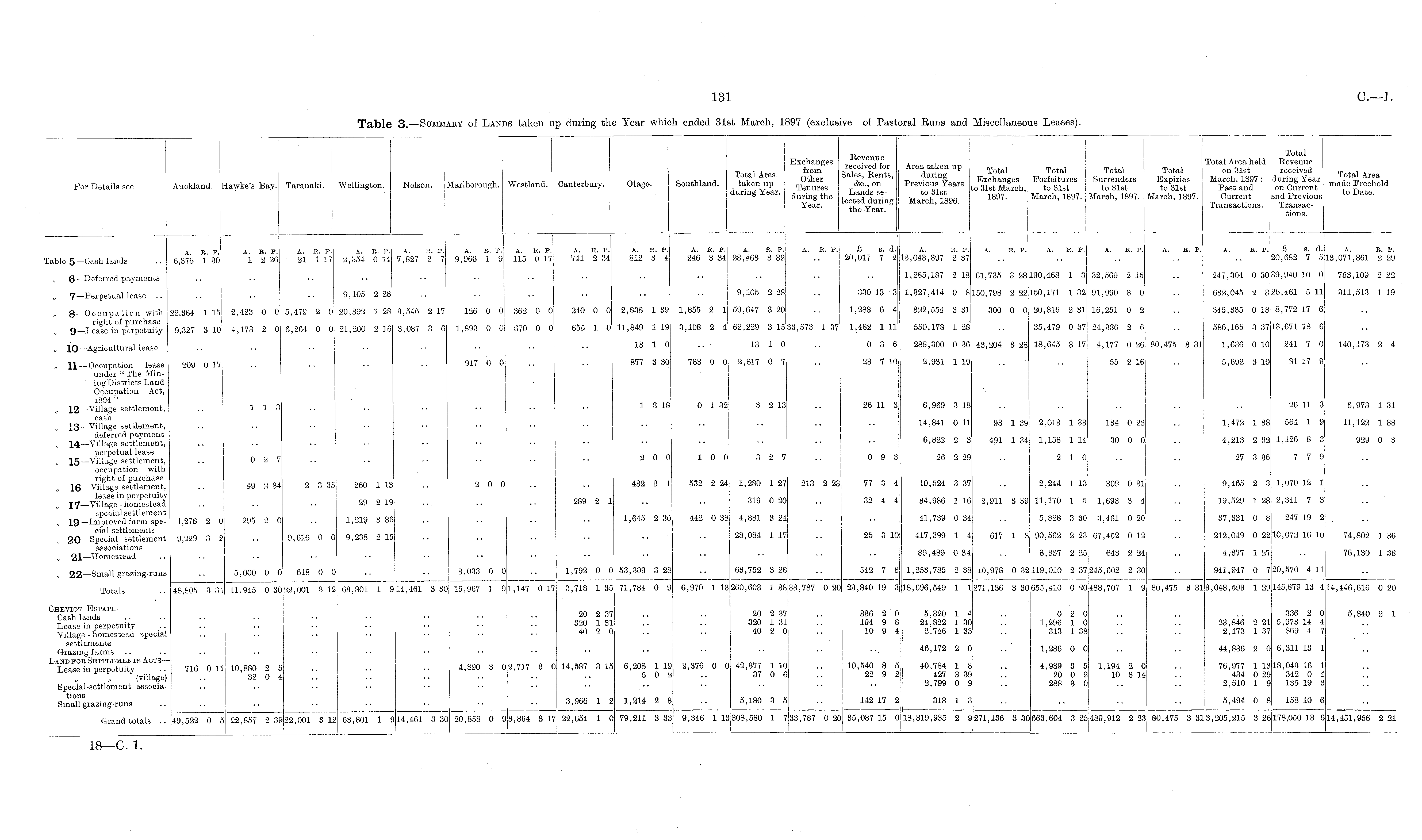 Hawke's Bay.I Taranaki. Nelson. Marlborough. Westland. Canterbury. Otago. Southland. Total Area taken up during Year. Exchanges from Other Tenures during the Year. Revenue received for Sales, Rents, &c, on Lands selected during the Year. Area taken up during Previous Years to 31st March, 1896. Total Exchanges to 31st March, 1897. Total Forfeitures to 31st March, 1897. Total Surrenders to 31st March, 1897. Total Expiries to 31st March, 1897. Total Total Area held Revenue on 31st received March, 1897 : during Year Past and on Current Current and Previous Transactions. Transactions. Total Area made Freehold to Date. For Details see Auckland. Wellington. A. R. P.| 6,376 1 30; A, B. P. 1 2 26 A. R. P.j 21 1 17 A. B. p. 2,554 0 14 A. R. P. 7,827 2 7 A. R. P. 9,966 1 9 ; A. R. P. 115 0 17 A. R. P. 741 2 34 A. R. P. 812 3 4! A. R. P. 246 3 34 A. R. Pj 28,463 3 32 A. R. P. £ s. d. 20,017 7 2 . A. E. P. 13,043,397 2 37 A. R. P. A. R. P. . , A. B. P.j A. R. P. A. B. P. £ s. d.j 20,682 7 6 A. K. P. 113,071,861 2 29 ?able 5 —Gash lands 6 - Deferred payments 1,285,187 2 18 61,735 3 28: 190,468 1 8 32,569 2 15 247,304 0 30 39,940 10 0 753,109 2 22 7 —Perpetual lease 9,105 2 28 9,105 2 28 330 13 3|| : 1,327,414 0 8 150,798 2 22 150,171 1 321 91,990 3 0 632,045 2 3j: J26,461 5 11 311,513 1 19 8 —Occupation with right of purchase 9 —Lease in perpetuity 22,384 1 15 2,423 0 0 5,479 2 0 20,392 1 28! 3,546 2 17 126 0 0 362 0 01 240 0 0 2,838 1 39 1,855 2 1 59,647 3 20 1,283 6 4 322,554 3 31 300 0 0 20,316 2 31 16,251 0 2 345,335 0 18! I 8,772 17 6 9,327 3 10 | 4,173 2 0 6,264 0 0' 21,200 2 16! 3,087 3 6 1,893 0 0; 670 0 0 650 1 0 11,849 1 19 3,108 2 4 62,229 3 15; '33,573 1 37 : 1,482 1 11 550,178 1 28 35,479 0 37; 24,336 2 6 586,165 3 37 13,671 18 6 „ 10 —Agricultural lease 13 1 0 13 1 0 0 3 6j 288,300 0 36 43,204 3 28 i 18,645 3 17! 4,177 0 26 80,475 3 31 1,636 0 10 241 7 0 140,173 2 4 „ 11 — Occupation lease under "The Mining Disbriots Land Occupation Act, 1894 " , 12— Village settlement, cash „ 13 —Village settlement, deferred payment „ 14 —Village settlement, perpetual lease „ 15 —Village settlement, occupation with right of purchase 16 —Village settlement, lease in perpetuity 17 —Village - homestead special settlement „ 19 —Improved farm special settlements 20 —Special-settlement associations 21 —Homestead 209 0 17 947 0 0 877 3 30 783 0 0 ; 2,817 0 7 23 7 10 2,931 1 19 55 2 16 5,692 3 10 31 17 9 113 1 3 18 0 1 32 3 2 13 26 11 3 6,969 3 18 26 11 3 6,973 1 31 14,841 0 11 98 1 39 i 2,013 1 83 134 0 23 1,472 1 38 564 1 9 11,122 1 38 6,822 2 3 491 1 34 [ 1,158 1 14 30 0 0 4,213 2 32 1,126 8 3 929 0 3 0 2 7 2 0 0 10 0 3 2 7 0 9 3 26 2 29 2 10 27 3 36 7 7 9 49 2 34 2 3 35 260 1 13 2 0 0 432 3 1 532 2 24 1,280 1 27 213 2 23 77 3 4 10,524 3 37 2,244 1 13 309 0 31 9,465 2 3 1,070 12 1 29 2 19 289 2 1 319 0 20 32 4 4 34,986 1 16 2,911 3 39 ) 11,170 1 5 ! 1,693 3 4 19,529 1 28 2,341 7 3 1,278 2 0 295 2 0 1,219 3 36 1,645 2 30 442 0 88 4,881 3 24 .. 41,739 0 34 I 5,828 3 30 ! 3,461 0 20 37,331 0 8 247 19 2 9,229 3 2 9,616 0 0 9,238 2 15 ! 28,084 1 17 . , 25 3 10 417,399 1 4 617 1 8 \\ 90,562 2 23 67,452 0 12 212,049 0 22 10,072 16 10 74,802 1 36 89,489 0 34 8,337 2 25; 643 2 24 4,377 1 27 76,130 1 38 „ 22 —Small grazing-runs 5,000 0 0 618 0 0 3,033 0 0 1,792 0 0 53,309 3 28 63,752 3 28 542 7 3 1,253,785 2 38 10,978 0 32 2119,010 2 37, 1245,602 2 30 941,947 0 7 20,570 4 11 Totals 48,805 3 34 11,945 0 30 22,001 3 12; 63,801 1 9 14,461 3 30 15,967 1 9 1,147 0 17 3,718 1 35 71,784 0 9 6,970 1 13 260,603 1 38 33,787 0 20 23,840 19 3 18,696,549 1 1 271,136 3 30 655,410 0 20, ,488,707 1 9 80,475 3 31 3,048,593 1 29 145,879 13 4 14,446,616 0 20 Cheviot Estate — Cash lands Lease in perpetuity Village - homestead special settlements Grazing farms Land fob Settlements Acts — Lease in perpetuity (village) Special-settlement associations Small grazing-runs 20 2 37 320 1 31 40 2 0 20 2 37 320 1 31 40 2 0 336 2 0 194 9 8 10 9 4 5,320 1 4 24,822 1 30 2,746 1 35 0 2 0 1,296 1 0 313 1 38 23,846 2 21 2,473 1 37 336 2 0 5,973 14 4 869 4 7 5,340 2 1 46,172 2 0 1,286 0 0 44,886 2 0 6,311 13 1 716 0 11 10,880 2 5 32 0 4 4,890 3 o! 2,717 3 0 14,587 3 15 6,208 1 19 5 0 2 2,376 0 0 42,377 1 10 37 0 6 10,540 8 5 22 9 2 40,784 1 8 427 3 39 2,799 0 9 4,989 3 5 20 0 2 288 3 0 i 1,194 2 0: 10 3 14 76,977 1 13 434 0 29 2,510 1 9 18,043 16 1 342 0 4 135 19 3 t 3,966 1 2 1,214 2 3 5,180 8 5 142 17 2 313 1 3 5,494 0 8] 158 10 6 Grand totals .. 49,522 0 5 22,857 2 39 22,001 3 12 63,801 1 9 14,461 3 30 20,858 0 9 j3,864 3 17 22,654 1 0 79,211 3 33 9,346 1 13 308,580 1 7 33,787 0 20 35,087 15 0 18,819,935 2 9 271,136 3 30 663,604 3 25: :489,912 2 23, 80,475 3 31 3,205,215 3 26: il78,O5O 13 6 14,451,956 2 21
