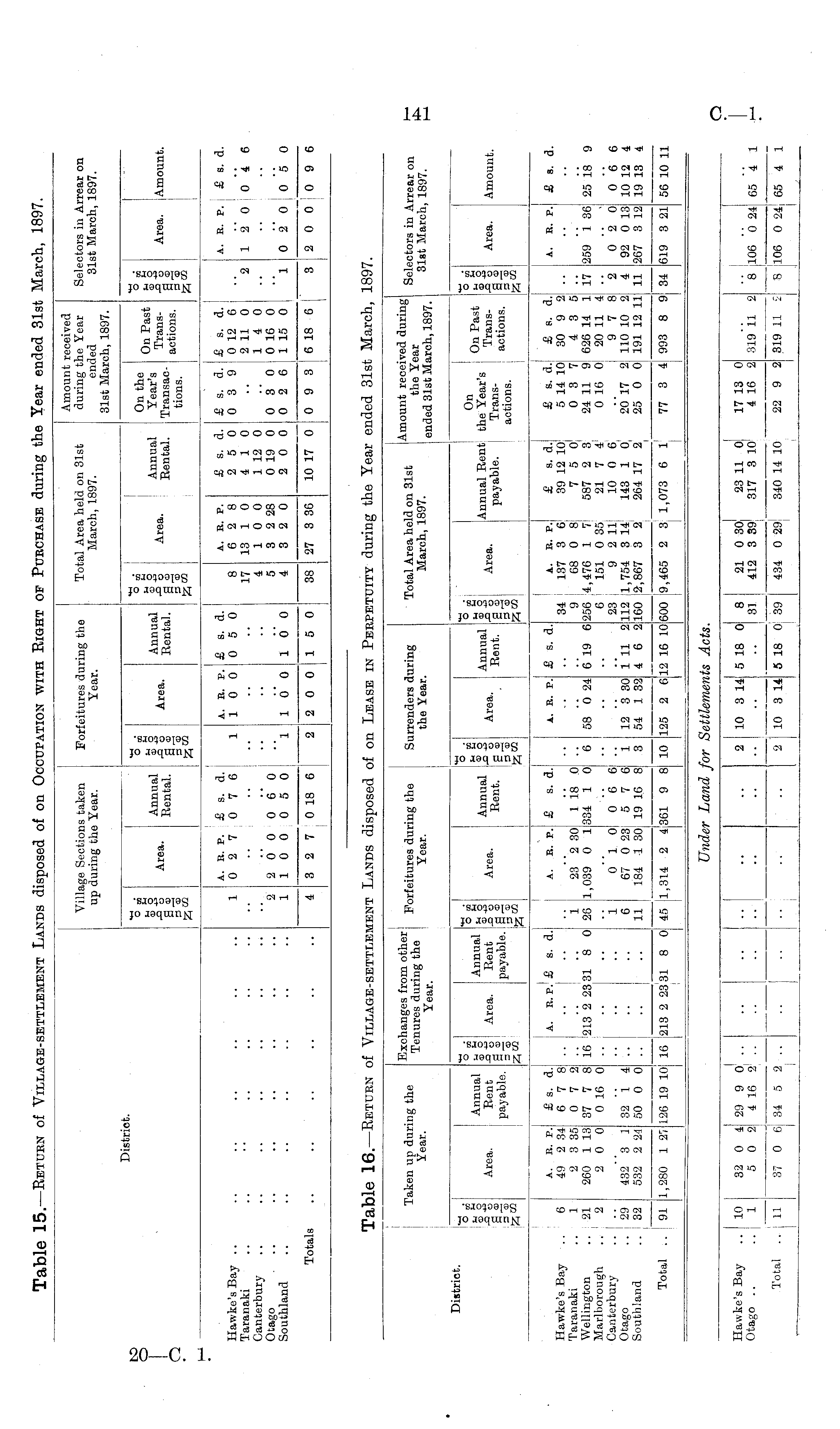 Village Sections taken up during the Year. Forfeitures during the Year. Total Area held on 31st March, 1897. Amount during 1 en 31st Maj i received the Year ded rch, 1897. Selectors in Arrear on 31st March, 1897. District. ■2 11 O m Si ! ■2 u 3 a> Area. Annual Rental. On the Year's Transactions. On Past Transactions. ll Area. Amount. Area. Annual Rental. Area. Annual Rental. a. B. p. 0 2 7 £ s. d. 0 7 6 1 0 6 0 '.'. 0 5 0 1 A. E. P. 10 0 £ s. d. 0 5 0 A. R. P. 6 2 8 13 1 0 10 0 3 2 28 3 2 0 £ s. d. 2 5 0 4 10 1 12 0 0 19 0 2 0 0 £ s. d. 0 3 9 \& s. d. 0 12 6 2 11 0 14 0 0 16 0 1 15 0 A. H. P. £ S. d, 12 0 0 4 6 Hawke's Bay .. Taranaki Canterbury Otago . .. Southland 1 2 1 2 0 0 10 0 •• ! •• I ! •• i •• 8 5 4 0 3 0 0 2 6 2 1 0 0 I 100 "l 0 2 0 I 0 5 C 2 0 0 0 9 6 Totals 4 3 2 7 0 18 6 2 2 0 0 15 0 38 27 3 36 10 17 0 0 9 3 J 6 18 6 3