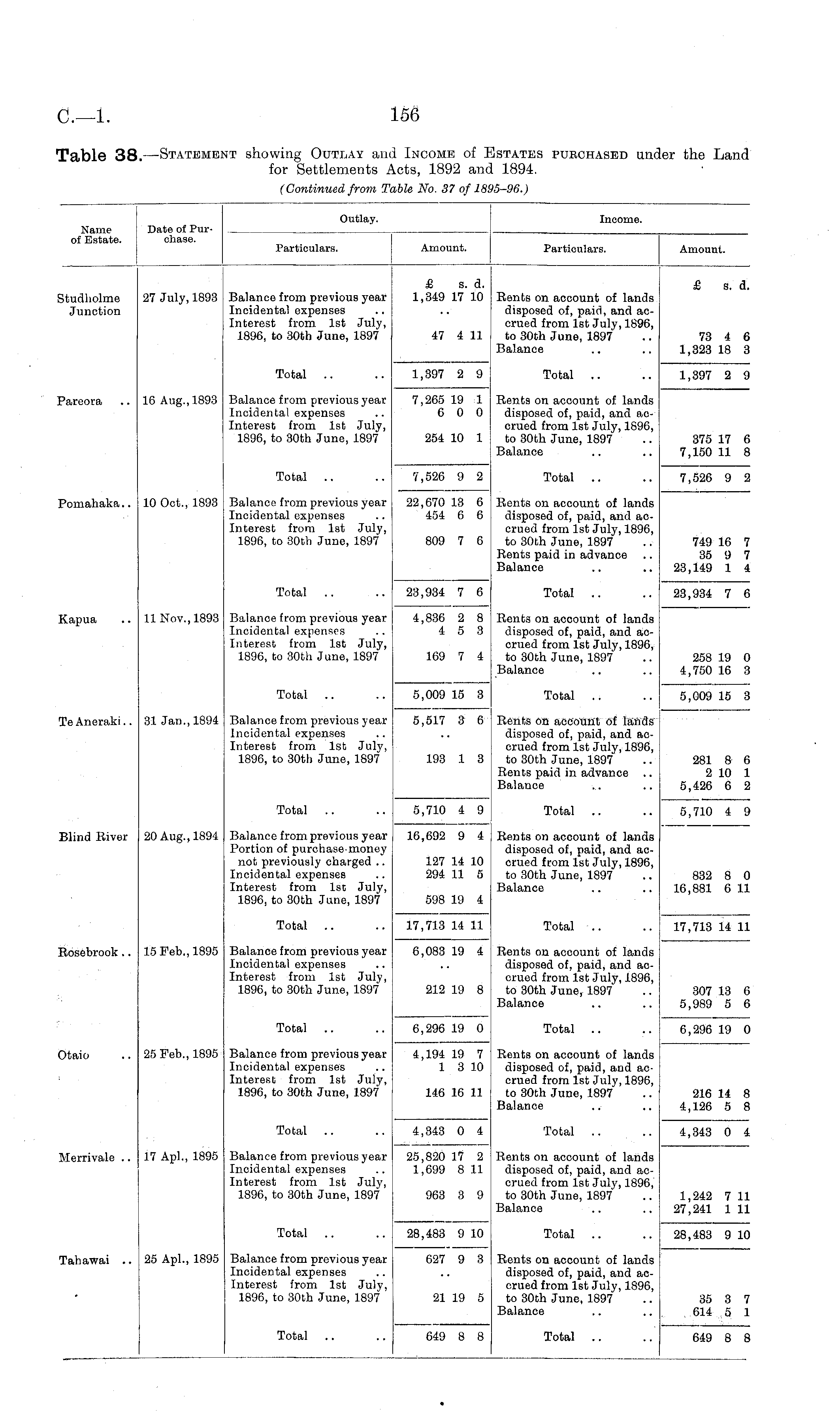 Name Date of Purof Estate. chase. Outlay. Income. Particulars. Amount. Particulars. Amount. Balance from previous year Incidental expenses Interest from 1st July, 1896, to 30th June, 1897 £ s. a. 1,349 17 10 Rents on account of lands disposed of, paid, and accrued from 1st July, 1896, to 30th June, 1897 Balance £ s. a. Studholme Junction 27 July, 1893 47 4 11 73 4 6 1,323 18 3 Total 1,397 2 9 Total 1,397 2 9 'aroora 16 Aug., 1893 Balance from previous year Incidental expenses Interest from 1st July, 1896, to 30th June, 1897 7,265 19 1 6 0 0 254 10 1 Rents on account of lands disposed of, paid, and accrued from 1st July, 1896, to 30th June, 1897 Balance 375 17 7,150 11 Total 7,526 9 2 Total 7,526 9 Pomahaka.. 10 Oct., 1893 Balance from previous year Incidental expenses Interest from 1st July, 1896, to 30th June, 1897 22,670 13 6 454 6 6 809 7 6 Rents on account of lands disposed of, paid, and accrued from 1st July, 1896, to 30th June, 1897 Rents paid in advance .. Balance 749 16 7 35 9 7 23,149 1 4 Total Total 23,934 7 6 23,934 7 6 Kapua 11 Nov., 1893 Balance from previous year Incidental expenses Interest from 1st July, 1896, to 30th June, 1897 4,836 2 8 4 5 3 169 7 4 Rents on account of lands disposed of, paid, and accrued from 1st July, 1896, to 30th June, 1897 Balance 258 19 0 4,750 16 3 Total 5,009 15 3 Total 5,009 15 3 Te Aneraki.. 31 Jan., 1894 Balance from previous year Incidental expenses Interest from 1st July, 1896, to 30th June, 1897 5,517 3 6 193 1 3 Rents on account of lands disposed of, paid, and accrued from 1st July, 1896, to 30th June, 1897 Rents paid in advance Balance 281 8 6 2 10 1 5,426 6 2 Total Total 5,710 4 9 5,710 4 9 Blind River 20 Aug., 1894 Balance from previous year Portion of purchase-money not previously charged .. Incidental expenses Interest from 1st July, 1896, to 30th June, 1897 16,692 9 4 127 14 10 294 11 5 Rents on account of lands disposed of, paid, and accrued from 1st July, 1896, to 30th June, 1897 Balance 832 8 0 16,881 6 11 598 19 4 Total 17,713 14 11 Total 17,713 14 11 Rosebrook.. 15 Feb., 1895 Balance from previous year Incidental expenses Interest from 1st July, 1896, to 30th June, 1897 6,083 19 4 Rents on account of lands disposed of, paid, and accrued from 1st July, 1896, to 30th June, 1897 Balance 212 19 8 307 13 6 5,989 5 6 Total 6,296 19 0 Total 6,296 19 Otaio 25 Feb., 1895 Balance from previous year Incidental expenses Interest from 1st July, 1896, to 30th June, 1897 4,194 19 7 1 3 10 146 16 11 Rents on account of lands disposed of, paid, and accrued from 1st July, 1896, to 30th June, 1897 Balance 216 14 8 4,126 5 8 Total 4,343 0 4 Total 4,343 0 4 Merrivale .. 17 Apl., 1895 Balance from previous year Incidental expenses Interest from 1st July, 1896, to 30th June, 1897 25,820 17 2 1,699 8 11 Rents on account of lands disposed of, paid, and accrued from 1st July, 1896, to 30th June, 1897 Balance 963 3 9 1,242 7 11 27,241 1 11 Total 28,483 9 10 Total 28,483 9 10 Tahawai .. 25 ApL, 1895 Balance from previous year Incidental expenses Interest from 1st July, 1896, to 30th June, 1897 627 9 3 Rents on account of lands disposed of, paid, and accrued from 1st July, 1896, to 30th June, 1897 Balance 21 19 5 35 3 7 614 5 1 Total 649 8 8 Total 649 8