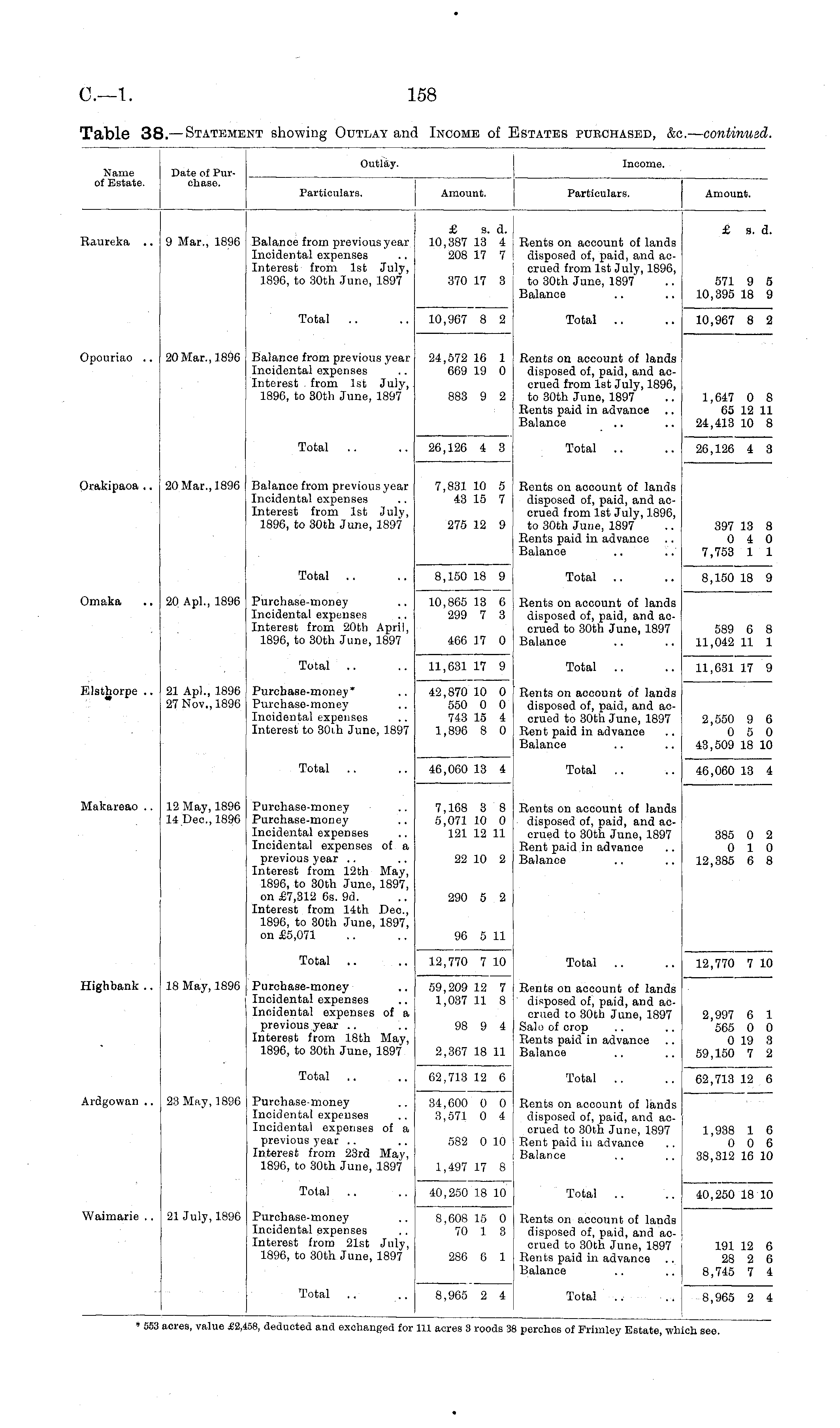 Outlay. Income. Name of Estate. Date ol Purchase. Particulars. Amount. Particulars. Amount. ;aureka .. 9 Mar., 1896 Balance from previous year Incidental expenses Interest from 1st July, 1896, to 30th June, 1897 £ s. d. 10,387 13 4 208 17 7 Rents on account of lands disposed of, paid, and accrued from 1st July, 1896, to 30th June, 1897 Balance £ s. d. 370 17 3 571 9 5 10,395 18 9 Total 10,967 8 2 Total 10,967 8 'pouriao .. 20 Mar., 1896 Balance from previous year Incidental expenses Interest from 1st July, 1896, to 30th June, 1897 24,572 16 1 669 19 0 883 9 2 Rents on account of lands disposed of, paid, and accrued from 1st July, 1896, to 30th June, 1897 Rents paid in advance Balance Total 1,647 0 8 65 12 11 24,413 10 8 26,126 4 3 26,126 4 3 Total irakipaoa .. 20 Mar., 1896 Balance from previous year Incidental expenses Interest from 1st July, 1896, to 30th June, 1897 7,831 10 5 43 15 7 Rents on account of lands disposed of, paid, and accrued from 1st July, 1896, to 30th June, 1897 Rents paid in advance Balance 275 12 9 397 13 8 0 4 0 7,753 1 1 20 Apl., 1896 Total Total )maka Purchase-money Incidental expenses Interest from 20th April, 1896, to 30th June, 1897 8,150 18 9 10,865 13 6 299 7 3 Rents on account of lands disposed of, paid, and accrued to 30th June, 1897 Balance 8,150 18 9 466 17 0 589 6 8 11,042 11 1 Clsthorpe .. Total .. 11,631 17 9 Total 11,631 17 9 21 Apl., 1896 27 Nov., 1896 Purchase-money* Purchase-money Incidental expenses Interest to 30ih June, 1897 42,870 10 0 550 0 0 743 15 4 1,896 8 0 Rents on account of lands disposed of, paid, and accrued to 30th June, 1897 Rent paid in advance Balance 2,550 9 6 0 5 0 43,509 18 10 ■lakareao .. Total 46,060 13 4 Total 46,060 13 12 May, 1896 14 Dec, 1896 Purchase-money Purchase-money Incidental expenses Incidental expenses of a previous year .. Interest from 12th May, 1896, to 30th June, 1897, on £7,312 6s. 9d. Interest from 14th Dec, 1896, to 30th June, 1897, on £5,071 7,168 3 8 5,071 10 0 121 12 11 22 10 2 Rents on account of lands disposed of, paid, and accrued to 30th June, 1897 Rent paid in advance Balance 385 0 2 0 10 12,385 6 8 290 5 2 96 5 11 Total Total 12,770 7 10 12,770 7 li Highbank .. 18 May, 1896 Purchase-money Incidental expenses Incidental expenses of a previous year Interest from 18th May, 1896, to 30th June, 1897 59,209 12 7 1,037 11 8 98 9 4 Rents on account of lands disposed of, paid, and accrued to 30th June, 1897 Sale of crop Rents paid in advance Balance 2,997 6 1 565 0 0 0 19 3 59,150 7 2 2,367 18 11 Ardgowan .. Total 62,713 12 6 Total 62,713 12 6 23 May, 1896 Purchase-money Incidental expenses Incidental expenses of a previous year Interest from 23rd May, 1896, to 30th June, 1897 Rents on account of lands disposed of, paid, and accrued to 30th June, 1897 Rent paid in advance Balance 34,600 0 0 3,571 0 4 1,938 1 6 0 0 6 38,312 16 10 582 0 10 1,497 17 8 Total 40,250 18 10 Total 40,250 18 10 Waimarie .. 21 July, 1896 Purchase-money Incidental expenses Interest from 21st July, 1896, to 30th June, 1897 8,608 15 0 70 1 3 Rents on account of lands disposed of, paid, and accrued to 30th June, 1897 Rents paid in advance Balance 286 0 1 191 12 28 2 8,745 7 Total 8,965 2 4 Total 8,965 2 ♦ 553 acres, value £2,458, deducted and exchanged for 111 acres 3 roods 38 perches of Frimley Estate, which see.