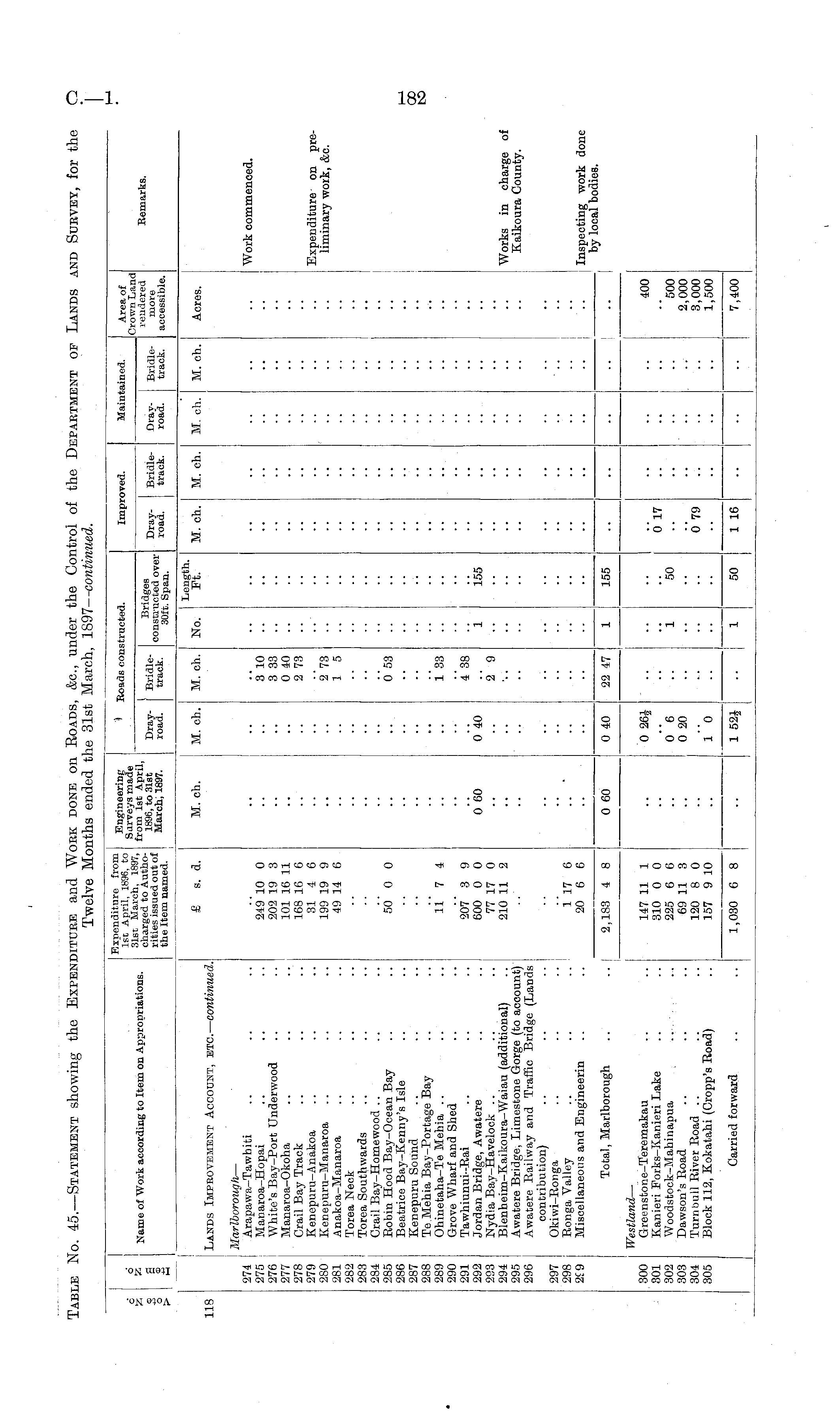 Table No. 45.—Statement showing the Expenditure and Work done on Roads, &c., under the Control of the Department of Lands and Survey, for the Twelve Months ended the 31st March, 1897— continued.