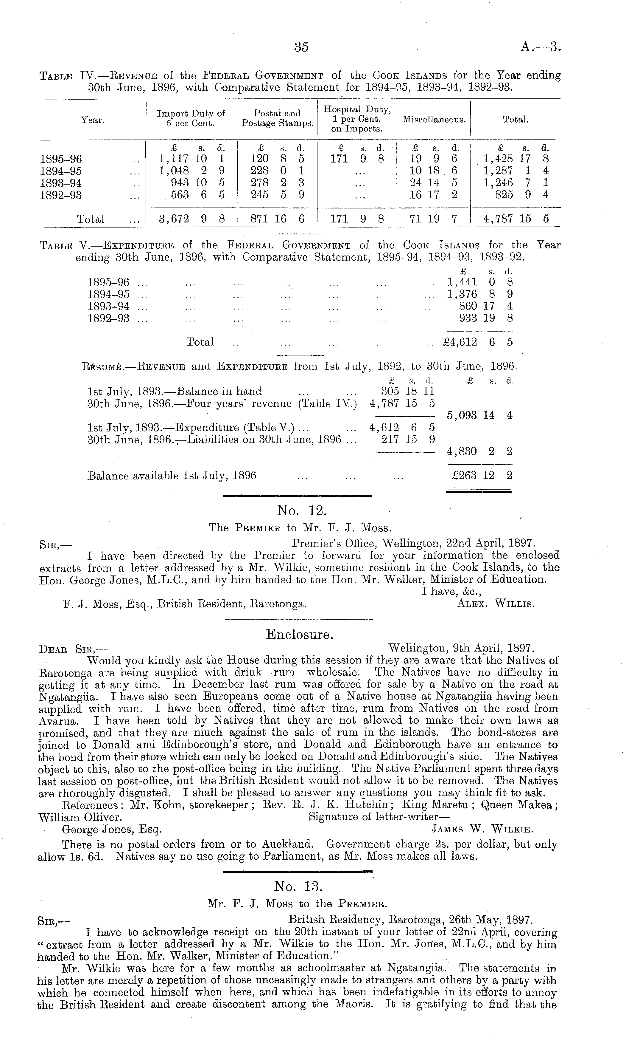 Enclosure. Deab Sib,— Wellington, 9th April, 1897. Would you kindly ask the House during this session if they are aware that the Natives of Rarotonga are being supplied with drink—rum —wholesale. The Natives have no difficulty in getting it at any time. In December last rum was offered for sale by a Native on the road at Ngatangiia. I have also seen Europeans come out of a Native house at Ngatangiia having been supplied with rum. I have been offered, time after time, rum from Natives on the road from Avarua. I have been told by Natives that they are not allowed to make their own laws as promised, and that they are much against the sale of rum in the islands. The bond-stores are joined to Donald and Edinborough's store, and Donald and Edinborough have an entrance to the bond from their store which can only be locked on Donald and Edinborough's side. The Natives object to this, also to the post-office being in the building. The Native Parliament spent three days last session on post-office, but the British Resident would not allow it to be removed. The Natives are thoroughly disgusted. I shall be pleased to answer any questions you may think fit to ask. References: Mr. Kohn, storekeeper ; Rev. R. J. K. Hutchin; King Maretu ; Queen Makea; William Olliver. Signature of letter-writer — George Jones, Esq. James W. Wilkie. There is no postal orders from or to Auckland. Government charge 2s. per dollar, but only allow Is. 6d. Natives say no use going to Parliament, as Mr. Moss makes all laws.