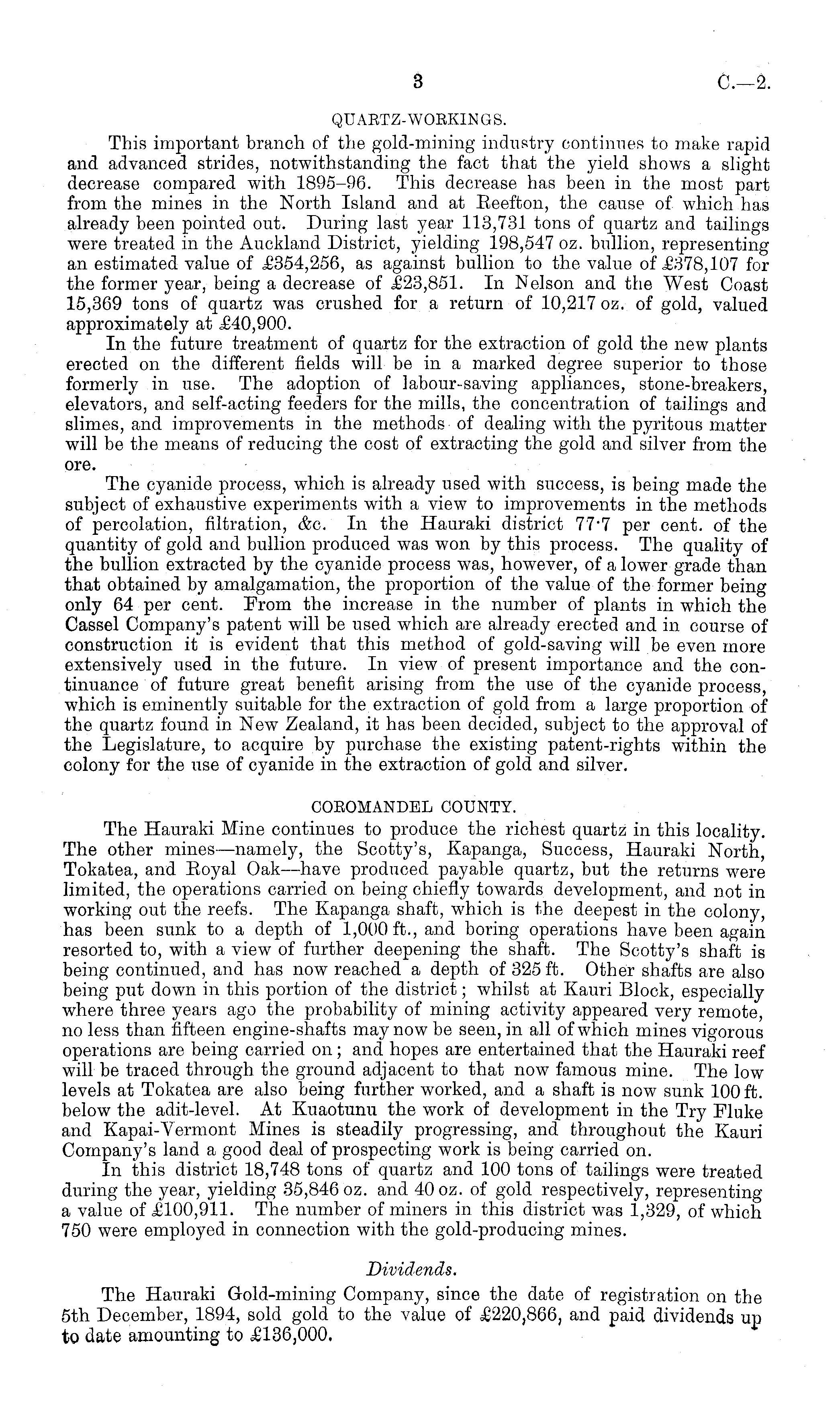 QUAETZ-WOBKINGS. This important branch of the gold-mining industry continues to make rapid and advanced strides, notwithstanding the fact that the yield shows a slight decrease compared with 1895-96. This decrease has been in the most part from the mines in the North Island and at Eeefton, the cause of which has already been pointed out. During last year 113,731 tons of quartz and tailings were treated in the Auckland District, yielding 198,547 oz. bullion, representing an estimated value of £354,256, as against bullion to the value of .£378,107 for the former year, being a decrease of £23,851. In Nelson and the West Coast 15,369 tons of quartz was crushed for a return of 10,217 oz. of gold, valued approximately at £40,900. In the future treatment of quartz for the extraction of gold the new plants erected on the different fields will be in a marked degree superior to those formerly in use. The adoption of labour-saving appliances, stone-breakers, elevators, and self-acting feeders for the mills, the concentration of tailings and slimes, and improvements in the methods of dealing with the pyritous matter will be the means of reducing the cost of extracting the gold and silver from the ore. The cyanide process, which is already used with success, is being made the subject of exhaustive experiments with a view to improvements in the methods of percolation, filtration, &c. In the Hauraki district 77 - 7 per cent, of the quantity of gold and bullion produced was won by this process. The quality of the bullion extracted by the cyanide process was, however, of a lower grade than that obtained by amalgamation, the proportion of the value of the former being only 64 per cent. From the increase in the number of plants in which the Cassel Company's patent will be used which are already erected and in course of construction it is evident that this method of gold-saving will be even more extensively used in the future. In view of present importance and the continuance of future great benefit arising from the use of the cyanide process, which is eminently suitable for the extraction of gold from a large proportion of the quartz found in New Zealand, it has been decided, subject to the approval of the Legislature, to acquire by purchase the existing patent-rights within the colony for the use of cyanide in the extraction of gold and silver. COEOMANDEL COUNTY. The Hauraki Mine continues to produce the richest quartz in this locality. The other mines—namely, the Scotty's, Kapanga, Success, Hauraki North, Tokatea, and Royal Oak—have produced payable quartz, but the returns were limited, the operations carried on being chiefly towards development, and not in working out the reefs. The Kapanga shaft, which is the deepest in the colony, has been sunk to a depth of 1,000 ft., and boring operations have been again resorted to, with a view of further deepening the shaft. The Scotty's shaft is being continued, and has now reached a depth of 325 ft. Other shafts are also being put down in this portion of the district; whilst at Kauri Block, especially where three years ago the probability of mining activity appeared very remote, no less than fifteen engine-shafts may now be seen, in all of which mines vigorous operations are being carried on ; and hopes are entertained that the Hauraki reef will be traced through the ground adjacent to that now famous mine. The low levels at Tokatea are also being further worked, and a shaft is now sunk 100 ft. below the adit-level. At Kuaotunu the work of development in the Try Fluke and Kapai-Vermont Mines is steadily progressing, and throughout the Kauri Company's land a good deal of prospecting work is being carried on. In this district 18,748 tons of quartz and 100 tons of tailings were treated during the year, yielding 35,846 oz. and 40 oz. of gold respectively, representing a value of £100,911. The number of miners in this district was 1,329, of which 750 were employed in connection with the gold-producing mines. Dividends. The Hauraki Gold-mining Company, since the date of registration on the sth December, 1894, sold gold to the value of £220,866, and paid dividends up to date amounting to £136,000.