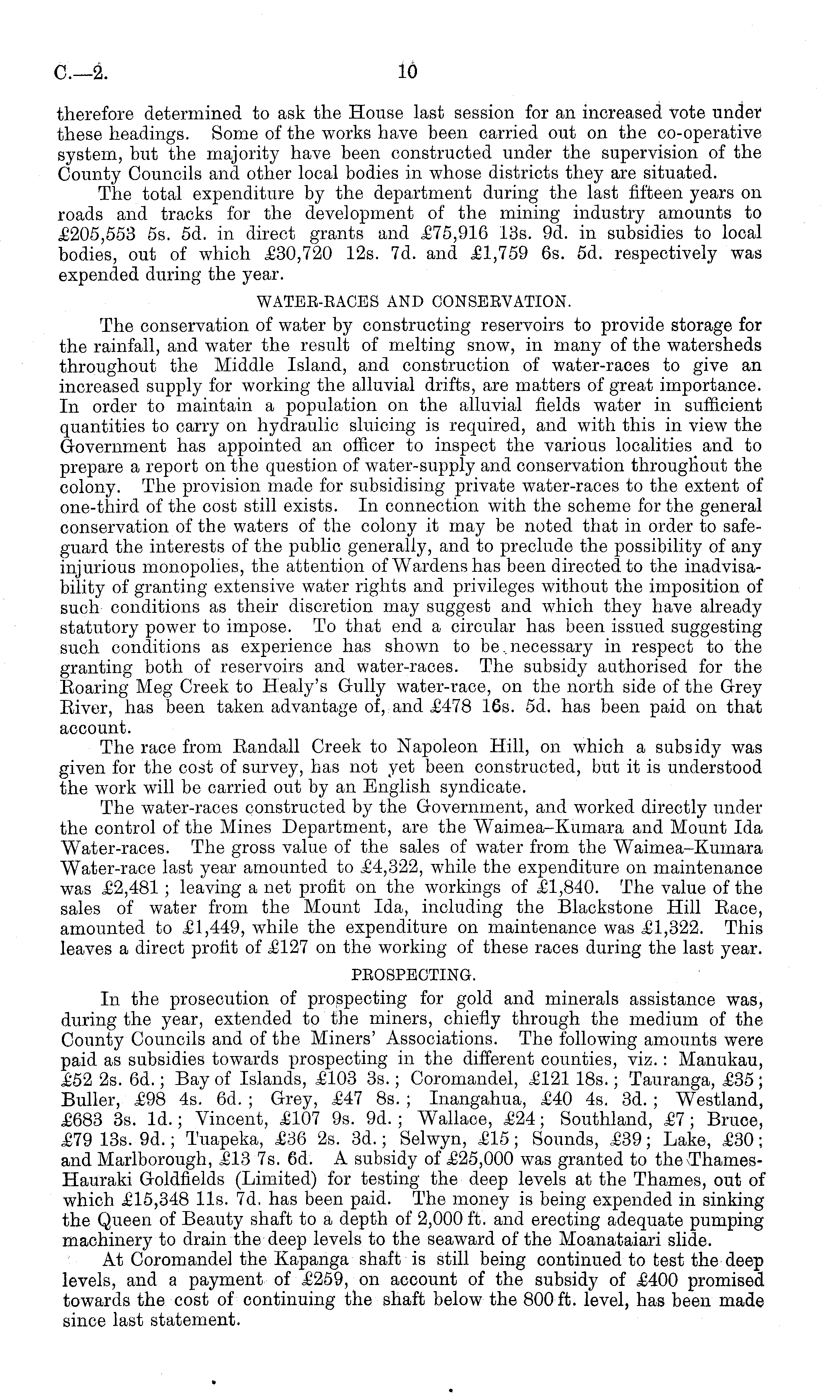 therefore determined to ask the House last session for an increased vote under these headings. Some of the works have been carried out on the co-operative system, but the majority have been constructed under the supervision of the County Councils and other local bodies in whose districts they are situated. The total expenditure by the department during the last fifteen years on roads and tracks for the development of the mining industry amounts to £205,553 ss. sd. in direct grants and £75,916 13s. 9d. in subsidies to local bodies, out of which £30,720 12s. 7d. and £1,759 6s. sd. respectively was expended during the year. WATBE-EACES AND CONSBEVATION. The conservation of water by constructing reservoirs to provide storage for the rainfall, and water the result of melting snow, in many of the watersheds throughout the Middle Island, and construction of water-races to give an increased supply for working the alluvial drifts, are matters of great importance. In order to maintain a population on the alluvial fields water in sufficient quantities to carry on hydraulic sluicing is required, and with this in view the Government has appointed an officer to inspect the various localities and to prepare a report on the question of water-supply and conservation throughout the colony. The provision made for subsidising private water-races to the extent of one-third of the cost still exists. In connection with the scheme for the general conservation of the waters of the colony it may be noted that in order to safeguard the interests of the public generally, and to preclude the possibility of any injurious monopolies, the attention of Wardens has been directed to the inadvisability of granting extensive water rights and privileges without the imposition of such conditions as their discretion may suggest and which they have already statutory power to impose. To that end a circular has been issued suggesting such conditions as experience has shown to be,necessary in respect to the granting both of reservoirs and water-races. The subsidy authorised for the Eoaring Meg Creek to Healy's Gully water-race, on the north side of the Grey Eiver, has been taken advantage of, and £478 16s. sd. has been paid on that account. The race from Eandall Creek to Napoleon Hill, on which a subsidy was given for the cost of survey, has not yet been constructed, but it is understood the work will be carried out by an English syndicate. The water-races constructed by the Government, and worked directly under the control of the Mines Department, are the Waimea-Kumara and Mount Ida Water-races. The gross value of the sales of water from the Waimea-Kumara Water-race last year amounted to £4,322, while the expenditure on maintenance was £2,481; leaving a net profit on the workings of £1,840. The value of the sales of water from the Mount Ida, including the Blackstone Hill Eace, amounted to £1,449, while the expenditure on maintenance was £1,322. This leaves a direct profit of £127 on the working of these races during the last year. PEOSPECTING. In the prosecution of prospecting for gold and minerals assistance was, during the year, extended to the miners, chiefly through the medium of the County Councils and of the Miners' Associations. The following amounts were paid as subsidies towards prospecting in the different counties, viz.: Manukau, £52 2s. 6d.; Bay of Islands, £103 35.; Coromandel, £121 18s.; Tauranga, £35; Buller, £98 4s. 6d. ; Grey, £47 Bs. ; Inangahua, £40 4s. 3d. ; Westland, £683 3s. Id.; Vincent, £107 9s. 9d. ; Wallace, £24; Southland, £7; Bruce, £79 13s. 9d.; Tuapeka, £36 2s. 3d.; Selwyn, £15; Sounds, £39; Lake, £30; and Marlborough, £13 7s. 6d. A subsidy of £25,000 was granted to the\ThamesHauraki Goldfields (Limited) for testing the deep levels at the Thames, out of which £15,348 11s. 7d. has been paid. The money is being expended in sinking the Queen of Beauty shaft to a depth of 2,000 ft. and erecting adequate pumping machinery to drain the deep levels to the seaward of the Moanataiari slide. At Coromandel the Kapanga shaft is still being continued to test the deep levels, and a payment of £259, on account of the subsidy of £400 promised towards the cost of continuing the shaft below the 800 ft. level, has been made since last statement.