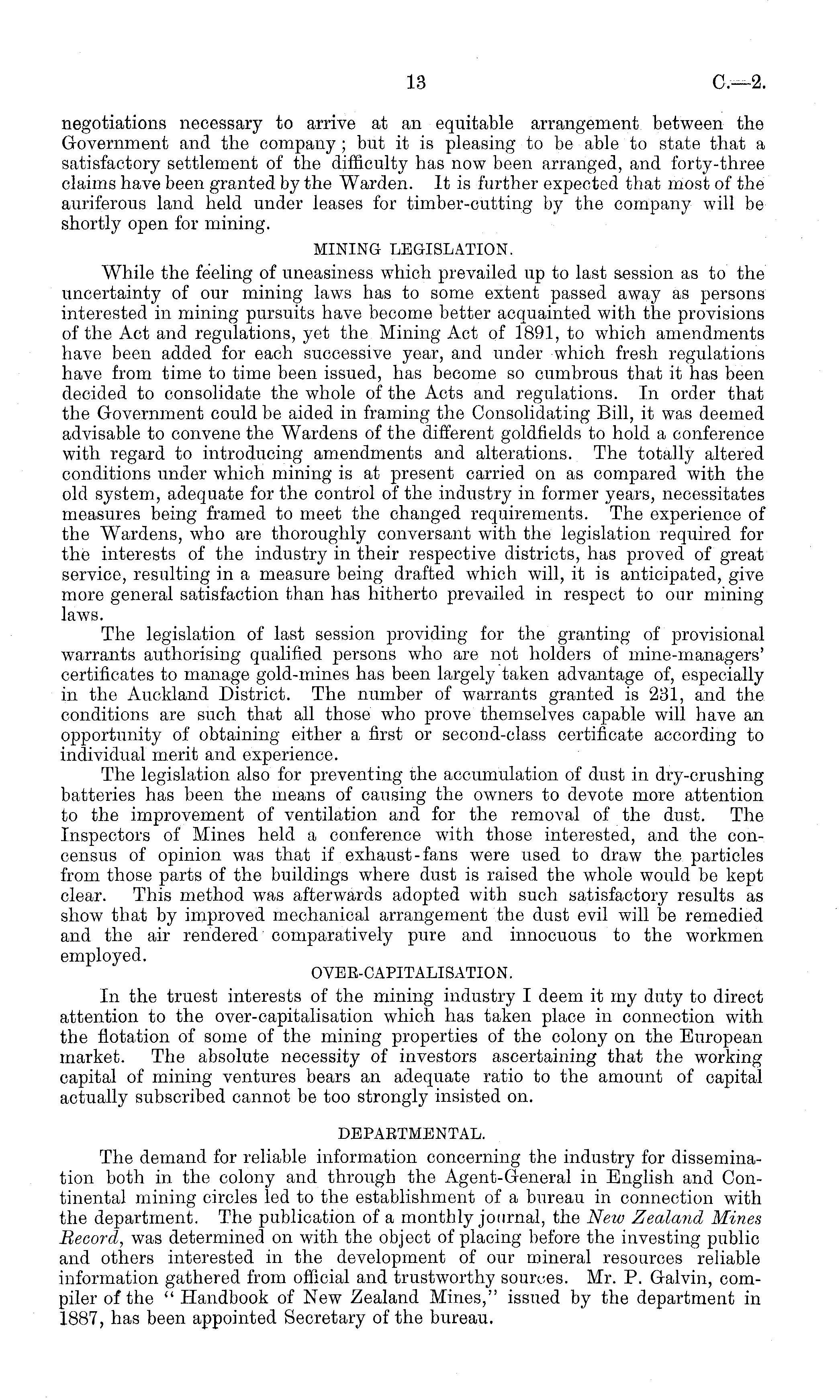 negotiations necessary to arrive at an equitable arrangement between the Government and the company ; but it is pleasing to be able to state that a satisfactory settlement of the difficulty has now been arranged, and forty-three claims have been granted by the Warden. It is further expected that most of the auriferous land held under leases for timber-cutting by the company will be shortly open for mining. MINING LEGISLATION. While the feeling of uneasiness which prevailed up to last session as to the uncertainty of our mining laws has to some extent passed away as persons interested in mining pursuits have become better acquainted with the provisions of the Act and regulations, yet the Mining Act of 1891, to which amendments have been added for each successive year, and under which fresh regulations have from time to time been issued, has become so cumbrous that it has been decided to consolidate the whole of the Acts and regulations. In order that the Government could be aided in framing the Consolidating Bill, it was deemed advisable to convene the Wardens of the different goldfields to hold a conference with regard to introducing amendments and alterations. The totally altered conditions under which mining is at present carried on as compared with the old system, adequate for the control of the industry in former years, necessitates measures being framed to meet the changed requirements. The experience of the Wardens, who are thoroughly conversant with the legislation required for the interests of the industry in their respective districts, has proved of great service, resulting in a measure being drafted which will, it is anticipated, give more general satisfaction than has hitherto prevailed in respect to our mining laws. The legislation of last session providing for the granting of provisional warrants authorising qualified persons who are not holders of mine-managers' certificates to manage gold-mines has been largely taken advantage of, especially in the Auckland District. The number of warrants granted is 231, and the conditions are such that all those who prove themselves capable will have an opportunity of obtaining either a first or second-class certificate according to individual merit and experience. The legislation also for preventing the accumulation of dust in dry-crushing batteries has been the means of causing the owners to devote more attention to the improvement of ventilation and for the removal of the dust. The Inspectors of Mines held a conference with those interested, and the concensus of opinion was that if exhaiist - fans were used to draw the particles from those parts of the buildings where dust is raised the whole would be kept clear. This method was afterwards adopted with such satisfactory results as show that by improved mechanical arrangement the dust evil will be remedied and the air rendered comparatively pure and innocuous to the workmen employed. OVBE-CAPITALISATION. In the truest interests of the mining industry I deem it my duty to direct attention to the over-capitalisation which has taken place in connection with the flotation of some of the mining properties of the colony on the European market. The absolute necessity of investors ascertaining that the working capital of mining ventures bears an adequate ratio to the amount of capital actually subscribed cannot be too strongly insisted on. DEPAETMBNTAL. The demand for reliable information concerning the industry for dissemination both in the colony and through the Agent-General in English and Continental mining circles led to the establishment of a bureau in connection with the department. The publication of a monthly journal, the New Zealand Mines Record, was determined on with the object of placing before the investing public and others interested in the development of our mineral resources reliable information gathered from official and trustworthy sources. Mr. P. Galvin, compiler of the " Handbook of New Zealand Mines," issued by the department in 1887, has been appointed Secretary of the bureau.