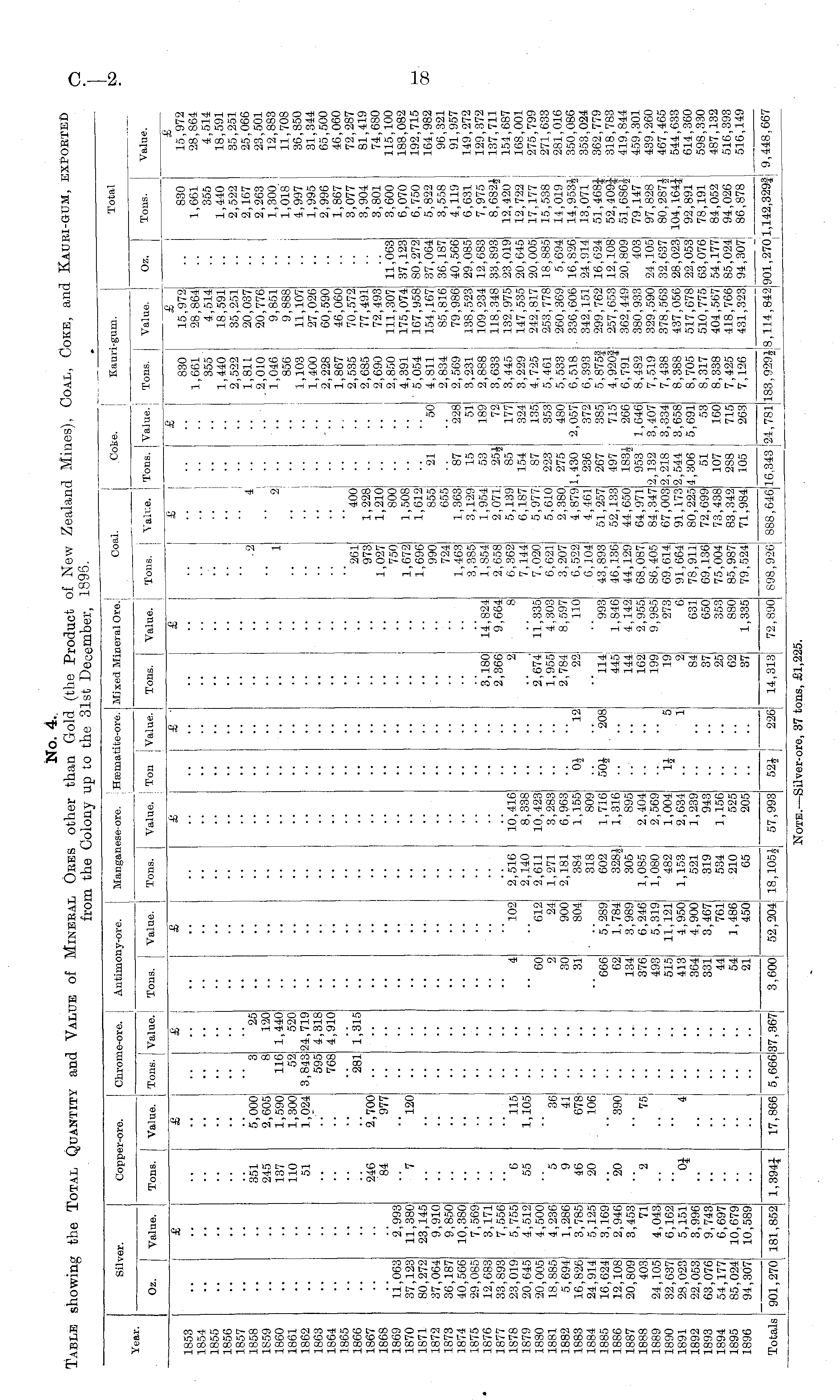Silver. Copper-ore. Chrome-ore. I Antimony-ore. Manganese-ore. Hsematite-ore. Mixed Mineral Ore. Coal. Coke. Kauri-gum. Total Oz. Value. Tons. Value. Tons. Value. ■ Tons. Value. Tons. Value. Ton Value. Tons. Value. Tons, i Value. Tons. Value. Tons. Value. Oz. Tons. Value. 1853 1854 1855 1856 1857 1858 1859 1860 1861 1862 1863 1864 1865 1866 1867 1868 1869 1870 1871 1872 1873 1874 1875 1876 1877 1878 1879 1880 1881 1882 1883 1884 1885 1886 1887 1888 1889 1890 1891 1892 1893 1894 1895 1896 •• .. i 11,063 37,123 80,272 37,064 36,187 40,566 29,085 12,683 33,893 23,019 20,645 20,005 18,885 5,694 16,826 24,914 16,624 12,108 20,809 403 24,105 32,637 28,023 22,053 63,076 54,177 85,024 94,307 £ I 2,993 11,380 23,145 9,910 9,850 10,380 7,569 3,171 7,556 5,755 4,512 4,500 4,236 1,286 3,785 5,125 3,169 2,946 3,453 71 4,043 6,162 5,151 3,996 9,743 6,697 10,679 10,589 351 245 137 110 51 246 84 "7 £ I •• •■ •■ 5,000 2,605 1,590 1,300 1,024 977 'l20 - ■• '• 3 8 116 52 3,843 595 768 281 ! " £ •■ I •• i .. ! 25 120 1,440 520 24,719 4,318 4,910 1,315 •• £ \ •• .. '" £ I ■■ •• ! £ 1 I • .. •• ., " & \ ■■ "• I .. .2 •• . 1 ■' •■ i 261 973 1,027 750 1,672 1,696 990 724 1,463 3,385 1,854 2,658 6,362 7,144 7,020 6,621 3,207 6,522 6,104 43,893 46,136 44,129 68,087 86,405 69,614 91,664 78,911 69,136 75,004 85,987 79,524 ■■ 4' 2) 400 1,228 1,210; 800| 1,508 1,612! 855i 655 1,363! 3,129 ! 1,954! 2,071 5,139| 6,187J 5,977 5,610, 2,380 4,879 4,461 51,257 52,133 44,650 64,971 84,347! 67,003: 91,173: 80,225? 72,699 73,438 83,342 71,984 I ■■ ■■ •• 21 87 15 53 25J 85 154 87 223 275 1,430 236 267 497 1834 953 2,132 2,218 2,544 4,306 51 107 288 105 ■• " " "50 228 51 189 72 177 324 135 353 480 2,057 372 385 715 266 1,646 3,407 3,334 3,658 5,691 53 160 715 263 £ 830 1,661 ! 355' 1,440 2,522 1,811 2,010 1,046 I 856 I 1,103 J 1,400 ! 2,228 1,867 2,535 2,685 2,690 2,850 4,391 5,054 4,811 2,834 2,569 3,231 2,888 3,633 3,445 3,229 4,725 5,461 I 5,533 6,518 6,393 5,875j! 4,920|, 6,791 8,482 7,519 I 7,438 8,388 8,705 8,317 8,338 7,425 7,126 £ 15,972 28,864 4,514 18,591 35,251 20,037 20,776 9,851 9,888 11,107 27,026 60,590 46,060 70,572 77,491 72,493 111,307 175,074 167,958 154,167 85,816 79,986 138,523 109,234 118,348 132,975 147,535 242,817 I 253,778 260,369 . 336,606 342,151 299,762 257,653; 362, 449 1 380,933 i 329,590 378,563 437,056 517,678 510,775 404,567 418,766 431,323 •■ •• ! •• ■• 11,063 37,123 80,272 37,064 36,187 40,566 29,085 12,683 33,893 23,019 20,645 20,005 18,885 5,694 16,826 24,914 16,624 12,108 20,809 403 24,105 32,637 28,023 22,053 63,076 54,177 85,024! 94,307 ! 830 1,661 355 1,440 2,522 2,167 2,263 1,300 1,018 4,997 1,995 2,996 1,867 3,077 3,904 3,801 3,600 6,070 6,750 5,822 3,558 i 4,119 ! 6,631 7,975 8,682J 12,420 12,722 17,177 15,538 14,019 14,9534 13,071 51,468J 52,4091 51,686*' 79,147 97,828 80.2874 1 104,164^ 92,891 78,191 84,052 94,026 86,878 £ 15,972 28,864 4,514 18,591 35,251 25,066 23,501 12,883 11,708 36,850 31,344 65,500 46,060 72,287 81,419 74,680 115,100 188,082 192,715 164,982 96,321 91,957 149,272 129,372 137,711 154,687 168,001 275,799 271,633 281,016 350,086 353,024 362,779 318,783 419,844 459,301 439,260 467,465 544,633 614,360 598,330 487,132 516,393 516,149 - •• •• I ■' . •• I •• 3,180 2,366 2 14,824 9,664 8 . ! '*6 55 "ll5 1,105 4 "102 2,516 2,140 2,611 1,271 2,181 384 318 602 3284 305 1,085 1,080 482 1,153 521 319 534 210 65 10,416 8,338 10,423 3,283 6,963 1,155 809 1,716 1,316 895 2,404 2,569 1,004 2,634 1,239 943 1,156 525 205 5 9 46 20 36 41 678 106 60 2 30 31 612 24 900 804 2,674 1,955 2,784 22 11,335 4,303 8,597 110 •■ I 'oj 12 i "* 666 62 134 376 493 515 413 364 331 44 54 21 5,289 ! 1,7841 3,989! 6,246; 5,319 11,121 4,950 4,900 3,467 761 1,486 450 504 208 114' 445 144 162; 199 19 2 84 37 25 62 37 993 1,846 4,142 2,955 9,985 273 6 631 650 353 880 1,335 20 390 • •• - 2 75 ■• " ! k 5 1 "01 4 - ! •• I 1 •• I •• .. Totals 5,666 1 ! 88,6461 16,343 24,781 , 183, 929 J 1 8,114,842 901,2701,142,3291 9,448,66' 901,270! 181,852! 1,394J 17.866 1 :37,367i 3,600! 52,204 18,105* I 57,993 52J 226! 14,313| 72,890 898,920 888,646 Note.—Silver-ore, 37 tons, £1,225.
