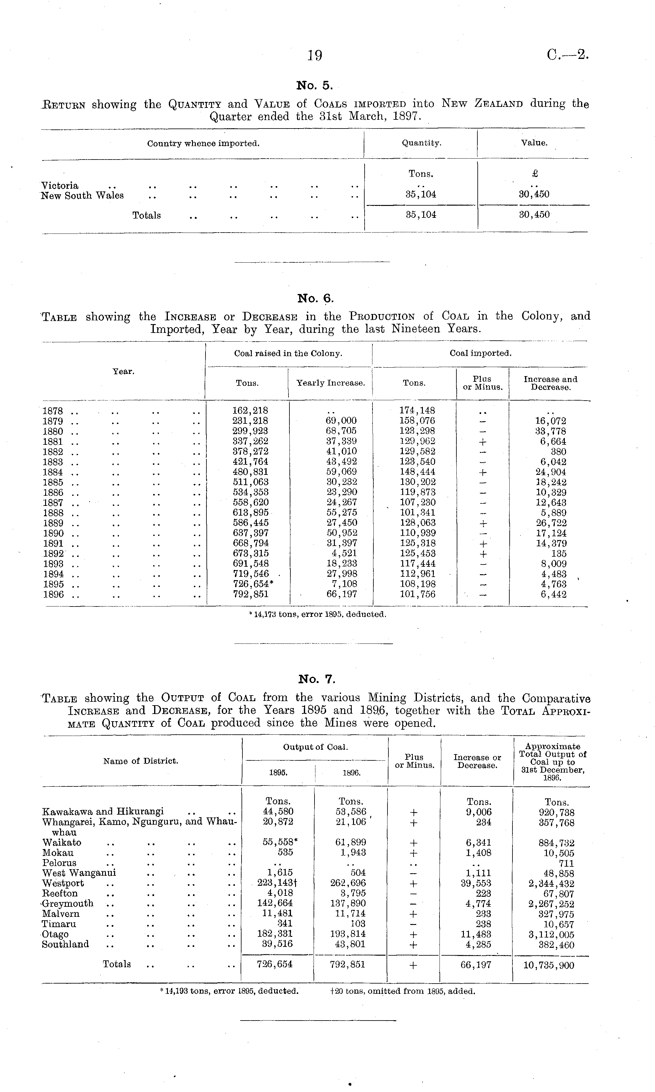 Year. Coal raise Tons. Coal raised in the Colony. ed in the Colony. Yearly Increase. Coal imported. Plus or Minus. Increase and Decrease. Tons. 1878 .. 1879 .. 1880 .. 1881 .. 1882 .. 1883 .. 1884 .. 1885 .. 1886 .. 1887 .. 1888 .. 1889 .. 1890 .. 1891 .. 1892 .. 1893 .. 1894 .. 1895 .. 1896 .. 162,218 231,218 299,923 337,262 378,272 421,764 480,831 511,063 534,353 558,620 613,895 586,445 637,397 668,794 673,315 691,548 719,546 • 726,654* 792,851 69,000 68,705 37,339 41,010 43,492 59,069 30,232 23,290 24,267 55,275 27,450 50,952 31,397 4,521 18,233 27,998 7,108 66,197 174,148 158,076 123,298 129,962 129,582 123,540 148,444 130,202 119,873 107,230 101,341 128,063 110,939 125,318 125,453 117,444 112,961 108,198 101,756 + + 16,072 33,778 6,664 380 6,042 24,904 18,242 10,329 12,643 5,889 26,722 17,124 14,379 135 8,009 4,483 4,763 6,442 + + + * 14,173 toi is, error 1895, deducted.