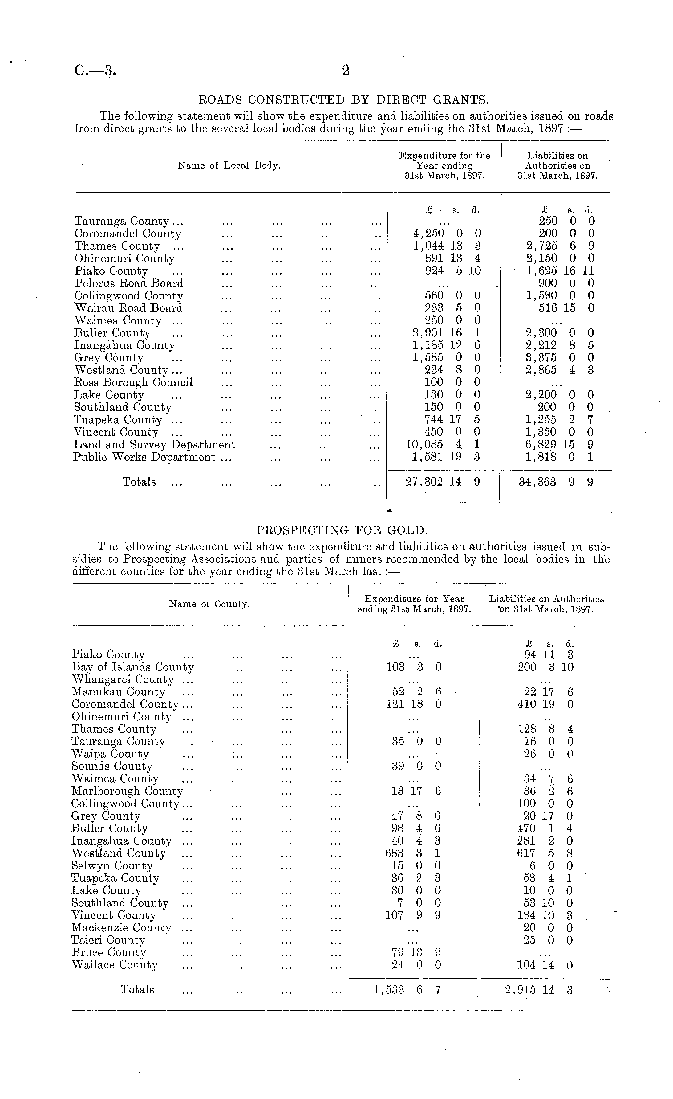 ROADS CONSTRUCTED BY DIRECT GRANTS. The following statement will show the expenditure and liabilities on authorities issued on roads from direct grants to the several local bodies during the year ending the 31st March, 1897: —
