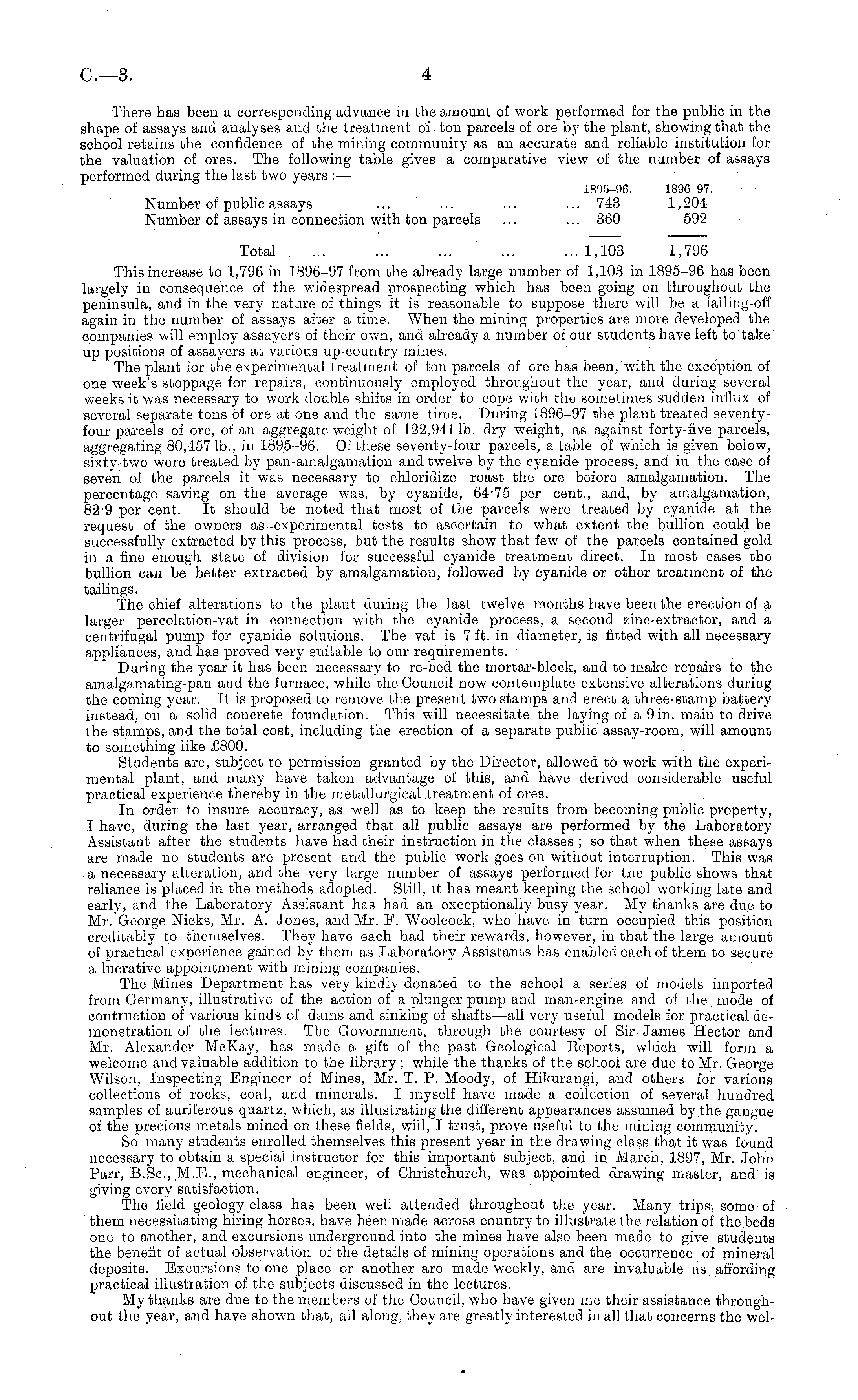There has been a corresponding advance in the amount of work performed for the public in the shape of assays and analyses and the treatment of ton parcels of ore by the plant, showing that the school retains the confidence of the mining community as an accurate and reliable institution for the valuation of ores. The following table gives a comparative view of the number of assays performed during the last two years : — 1895-96. 1896-97. Number of public assays ... ... ... ... 743 1,204 Number of assays in connection with ton parcels ... ... 360 592 Total ... ... ... ... ... 1,103 1,796 This increase to 1,796 in 1896-97 from the already large number of 1,103 in 1895-96 has been largely in consequence of the widespread prospecting which has been going on throughout the peninsula, and in the very nature of things it is reasonable to suppose there will be a falling-off again in the number of assays after a time. When the mining properties are more developed the companies will employ assayers of their own, and already a number of our students have left to take up positions of assayers at various up-country mines. The plant for the experimental treatment of ton parcels of ore has been, with the exception of one week's stoppage for repairs, continuously employed throughout the year, and during several weeks it was necessary to work double shifts in order to cope with the sometimes sudden influx of several separate tons of ore at one and the same time. During 1896-97 the plant treated seventyfour parcels of ore, of an aggregate weight of 122,9411b. dry weight, as against forty-five parcels, aggregating 80,4571b., in 1895-96. Of these seventy-four parcels, a table of which is given below, sixty-two were treated by pan-amalgamation and twelve by the cyanide process, and in the case of seven of the parcels it was necessary to chloridize roast the ore before amalgamation. The percentage saving on the average was, by cyanide, 64-75 per cent., and, by amalgamation, 82-9 per cent. It should be noted that most of the parcels were treated by cyanide at the request of the owners as experimental tests to ascertain to what extent the bullion could be successfully extracted by this process, but the results show that few of the parcels contained gold in a fine enough state of division for successful cyanide treatment direct. In most cases the bullion can be better extracted by amalgamation, followed by cyanide or other treatment of the tailings. The chief alterations to the plant during the last twelve months have been the erection of a larger percolation-vat in connection with the cyanide process, a second zinc-extractor, and a centrifugal pump for cyanide solutions. The vat is 7 ft. in diameter, is fitted with all necessary appliances, and has proved very suitable to our requirements. During the year it has been necessary to re-bed the mortar-block, and to make repairs to the amalgamating-pan and the furnace, while the Council now contemplate extensive alterations during the coming year. It is proposed to remove the present two stamps and erect a three-stamp battery instead, on a solid concrete foundation. This will necessitate the laying of a 9 in. main to drive the stamps, and the total cost, including the erection of a separate public assay-room, will amount to something like £800. Students are, subject to permission granted by the Director, allowed to work with the experimental plant, and many have taken advantage of this, and have derived considerable useful practical experience thereby in the metallurgical treatment of ores. In order to insure accuracy, as well as to keep the results from becoming public property, I have, during the last year, arranged that all public assays are performed by the Laboratory Assistant after the students have had their instruction in the classes ; so that when these assays are made no students are present and the public work goes on without interruption. This was a necessary alteration, and the very large number of assays performed for the public shows that reliance is placed in the methods adopted. Still, it has meant keeping the school working late and early, and the Laboratory Assistant has had an exceptionally busy year. My thanks are due to Mr. George Nicks, Mr. A. Jones, and Mr. F. Woolcock, who have in turn occupied this position creditably to themselves. They have each had their rewards, however, in that the large amount of practical experience gained by them as Laboratory Assistants has enabled each of them to secure a lucrative appointment with mining companies. The Mines Department has very kindly donated to the school a series of models imported from Germany, illustrative of the action of a plunger pump and man-engine and of the mode of contraction of various kinds of dams and sinking of shafts —all very useful models for practical demonstration of the lectures. The Government, through the courtesy of Sir James Hector and Mr. Alexander McKay, has made a gift of the past Geological Eeports, which will form a welcome and valuable addition to the library; while the thanks of the school are due to Mr. George Wilson, Inspecting Engineer of Mines, Mr. T. P. Moody, of Hikurangi, and others for various collections of rocks, coal, and minerals. I myself have made a collection of several hundred samples of auriferous quartz, which, as illustrating the different appearances assumed by the gangue of the precious metals mined on these fields, will, I trust, prove useful to the mining community. So many students enrolled themselves this present year in the drawing class that it was found necessary to obtain a special instructor for this important subject, and in March, 1897, Mr. John Parr, B.Sc, M.E., mechanical engineer, of Christchurch, was appointed drawing master, and is giving every satisfaction. The field geology class has been well attended throughout the year. Many trips, some of them necessitating hiring horses, have been made across country to illustrate the