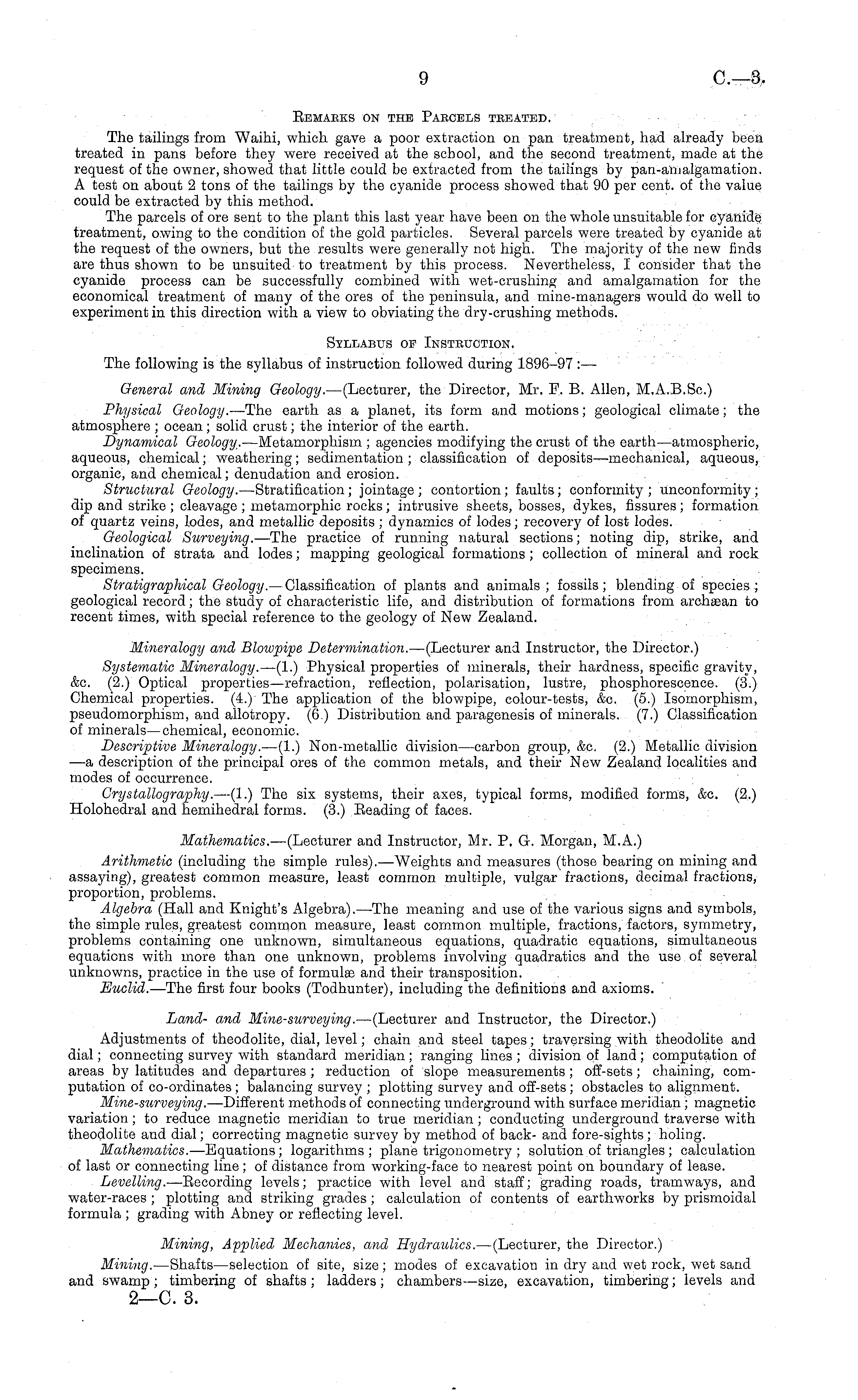 Eemaeks on the Parcels treated. The tailings from Waihi, which gave a poor extraction on pan treatment, had already been treated in pans before they were received at the school, and the second treatment, made at the request of the owner, showed that little could be extracted from the tailings by pan-amalgamation. A test on about 2 tons of the tailings by the cyanide process showed that 90 per cent, of the value could be extracted by this method. The parcels of ore sent to the plant this last year have been on the whole unsuitable for cyanide treatment, owing to the condition of the gold particles. Several parcels were treated by cyanide at the request of the owners, but the results were generally not high. The majority of the new finds are thus shown to be unsuited to treatment by this process. Nevertheless, I consider that the cyanide process can be successfully combined with wet-crushing and amalgamation for the economical treatment of many of the ores of the peninsula, and mine-managers would do well to experiment in this direction with a view to obviating the dry-crushing methods. Syllabus op Instruction. The following is the syllabus of instruction followed during 1896-97 : — General and Mining Geology. —(Lecturer, the Director, Mr. F. B. Allen, M.A.B.Sc.) Physical Geology. —The earth as a planet, its form and motions; geological climate; the atmosphere ; ocean; solid crust; the interior of the earth. Dynamical Geology. —Metamorphism ; agencies modifying the crust of the earth—atmospheric, aqueous, chemical; weathering; sedimentation ; classification of deposits —mechanical, aqueous, organic, and chemical; denudation and erosion. Structural Geology. —Stratification ; jointage ; contortion; faults; conformity ; unconformity ; dip and strike ; cleavage ; metamorphic rocks ; intrusive sheets, bosses, dykes, fissures ; formation of quartz veins, lodes, and metallic deposits ; dynamics of lodes; recovery of lost lodes. Geological Surveying. —The practice of running natural sections; noting dip, strike, and inclination of strata and lodes; mapping geological formations ; collection of mineral and rock specimens. Stratigraphical Geology. — Classification of plants and animals ; fossils; blending of species; geological record; the study of characteristic life, and distribution of formations from archsean to recent times, with special reference to the geology of New Zealand. Mineralogy and Bloivpipe Determination. —(Lecturer and Instructor, the Director.) Systematic Mineralogy. —(l.) Physical properties of minerals, their hardness, specific gravity, &c. (2.) Optical properties —refraction, reflection, polarisation, lustre, phosphorescence. (3.) Chemical properties. (4.) The application of the blowpipe, colour-tests, &c. (5.) Isomorphism, pseudomorphism, and allotropy. (6.) Distribution and paragenesis of minerals. (7.) Classification of minerals—chemical, economic. Descriptive Mineralogy. —(l.) Non-metallic division—carbon group, &c. (2.) Metallic division —a description of the principal ores of the common metals, and their New Zealand localities and modes of occurrence. Crystallography. —(l.) The six systems, their axes, typical forms, modified forms, &c. (2.) Holohedral and hemihedral forms. (3.) Eeading of faces. Mathematics. —(Lecturer and Instructor, Mr. P. G. Morgan, M.A.) Arithmetic (including the simple rules). —Weights and measures (those bearing on mining and assaying), greatest common measure, least common multiple, vulgar fractions, decimal fractions, proportion, problems. Algebra (Hall and Knight's Algebra).—The meaning and use of the various signs and symbols, the simple rules, greatest common measure, least common multiple, fractions, factors, symmetry, problems containing one unknown, simultaneous equations, quadratic equations, simultaneous equations with more than one unknown, problems involving quadratics and the use of several unknowns, practice in the use of formulae and their transposition. Euclid. —The first four books (Todhunter), including the definitions and axioms. Land- and Mine-surveying. —(Lecturer and Instructor, the Director.) Adjustments of theodolite, dial, level; chain and steel tapes; traversing with theodolite and dial; connecting survey with standard meridian ; ranging lines ; division of land ; computation of areas by latitudes and departures ; reduction of slope measurements; off-sets; chaining, computation of co-ordinates; balancing survey ; plotting survey and off-sets ; obstacles to alignment. Mine-surveying. —Different methods of connecting underground with surface meridian ; magnetic variation; to reduce magnetic meridian to true meridian ; conducting underground traverse with theodolite and dial; correcting magnetic survey by method of back- and fore-sights ; holing. Mathematics. —Equations; logarithms; plane trigonometry ; solution of triangles ; calculation of last or connecting line; of distance from working-face to nearest point on boundary of lease. Levelling. —Eecording levels; practice with level and staff; grading roads, tramways, and water-races ; plotting and striking grades ; calculation of contents of earthworks by prismoidal formula ; grading with Abney or reflecting level. Mining, Applied Mechanics, and Hydraulics. —(Lecturer, the Director.) Mining. —Shafts—selection of site, size; modes of excavation in dry and wet rock, wet sand and swamp; timbering of shafts; ladders; chambers—size, excavation, timbering; levels and 2—C. 3.